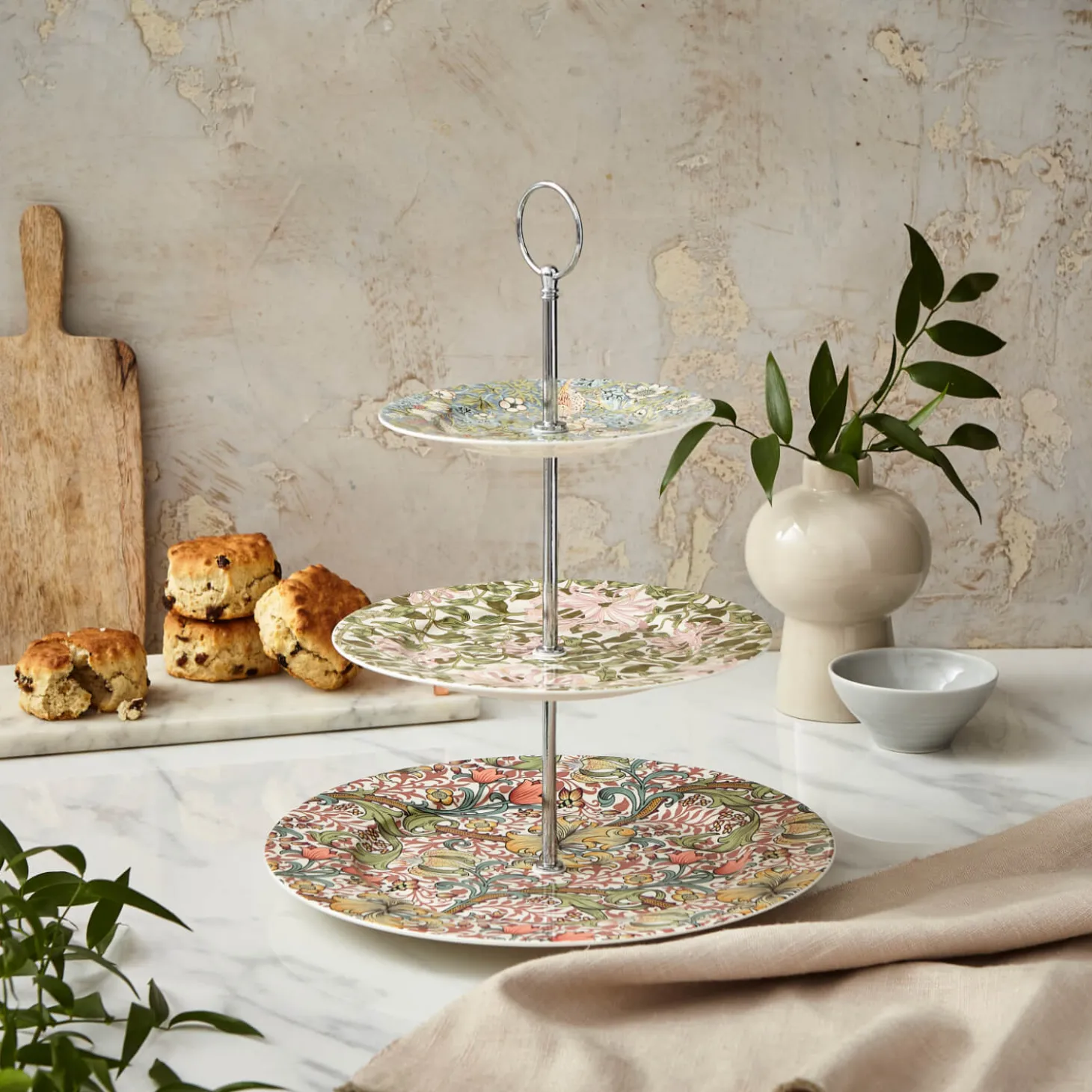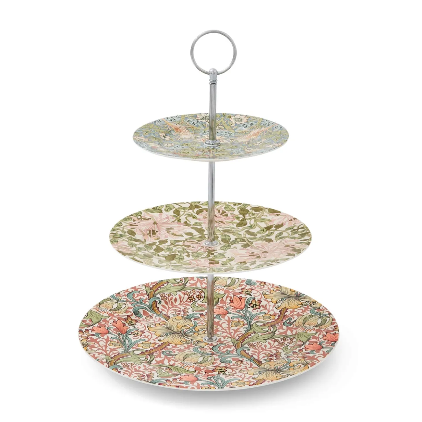 Morris & Co presents their 3-Tier Porcelain Cake Stand. Featuring the iconic botanical patterns of William Morris designed to add a warm cottage feel to your kitchen creating a beautiful, calm and restful touch to your home. The three stunning designs in soft and gentle hues create an impressive show of floral patterns that would make a striking centerpiece for any tea party.