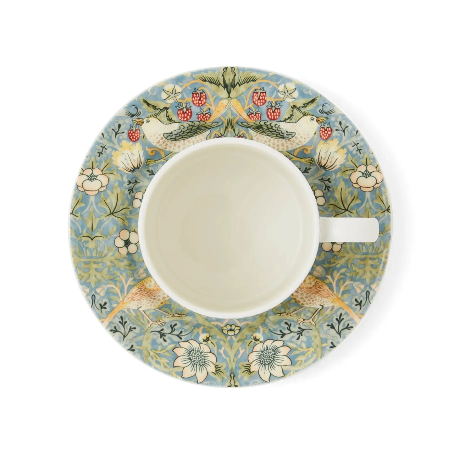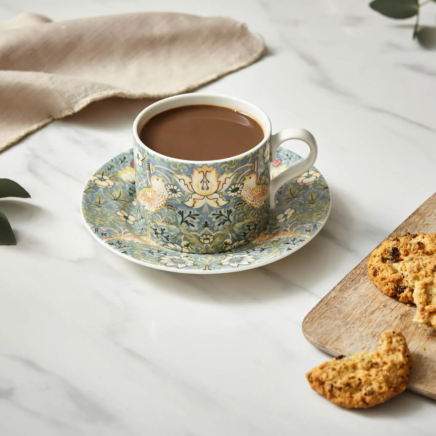 Morris & Co presents the Cup & Saucer in their Strawberry Thief design, made from Porcelain. Featuring the iconic botanical patterns of William Morris designed to add a warm cottage feel to your kitchen creating a beautiful, calm and restful touch to your home. The stunning Strawberry Thief pattern with its gentle pink and green shades make this set ideal for a peaceful cup of tea or creating a stunning table display for afternoon tea with friends.Â