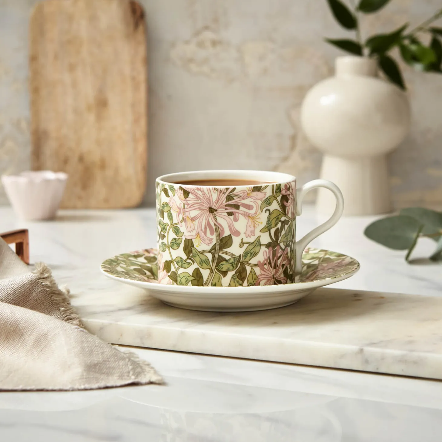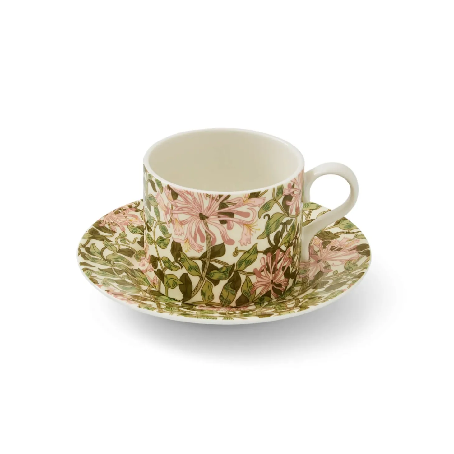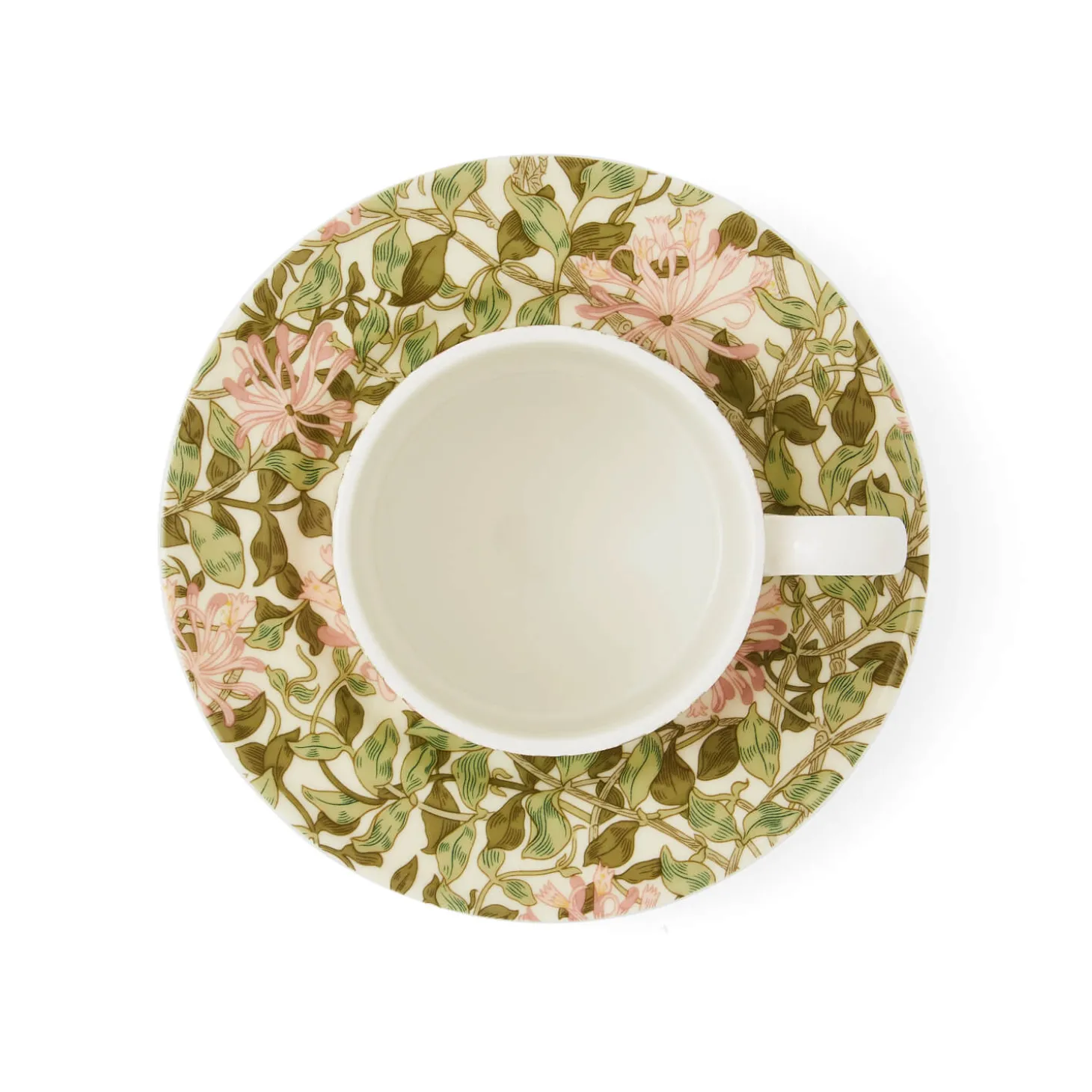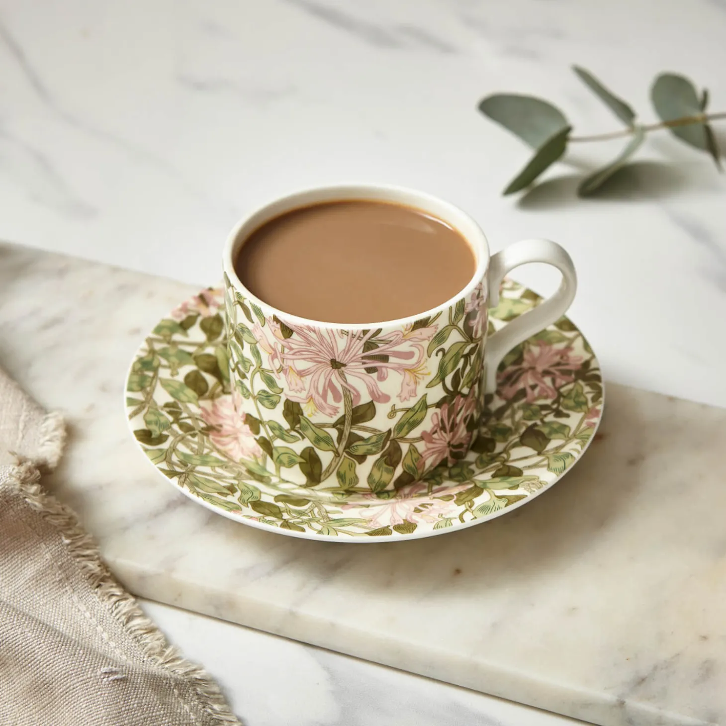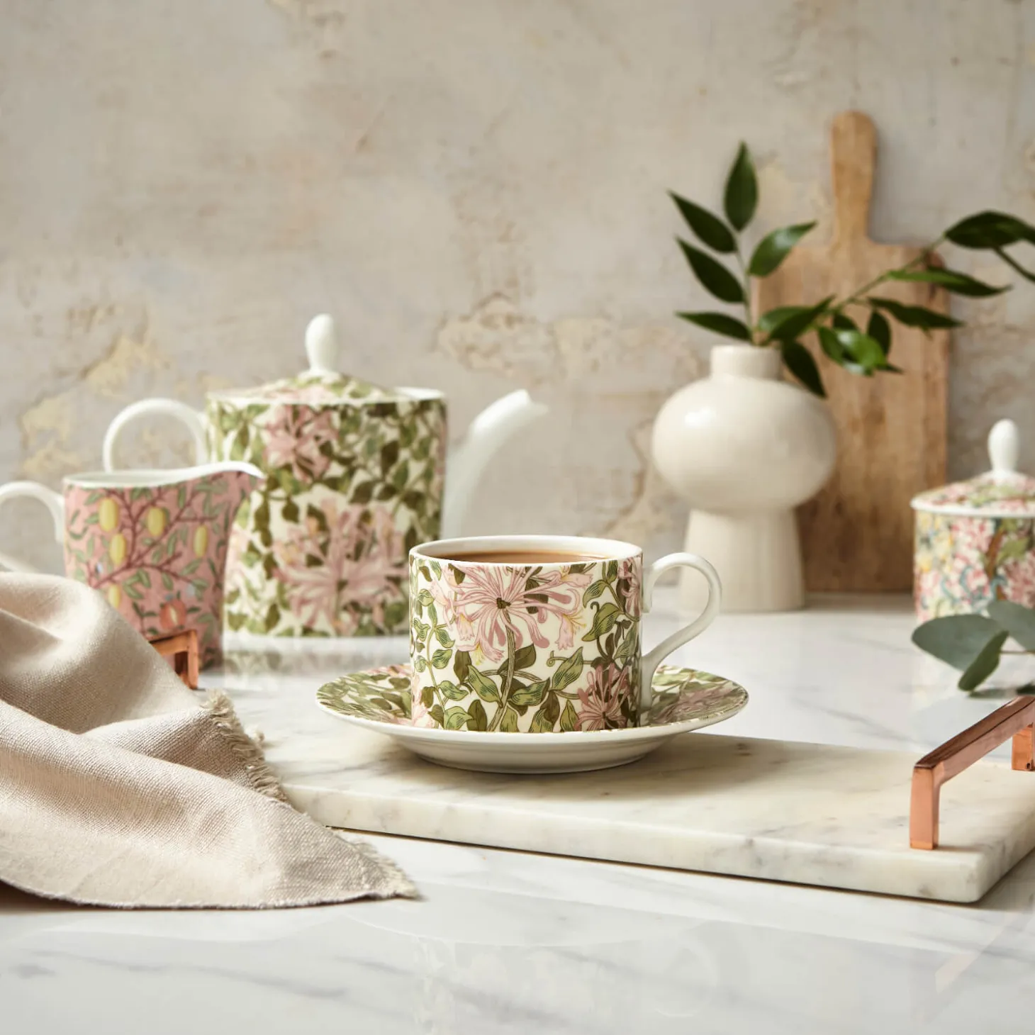 Morris & Co presents the Cup & Saucer in their Honeysuckle design, made from Porcelain. Featuring the iconic botanical patterns of J.H. Dearle, designed in 1883, the Honeysuckle pattern was created to add a touch of the outdoors to your kitchen creating a beautiful, calm and restful touch to your home. The stunning floral colours make this set ideal for a peaceful cup of tea or for creating a elegant table display for afternoon tea with friends.Â