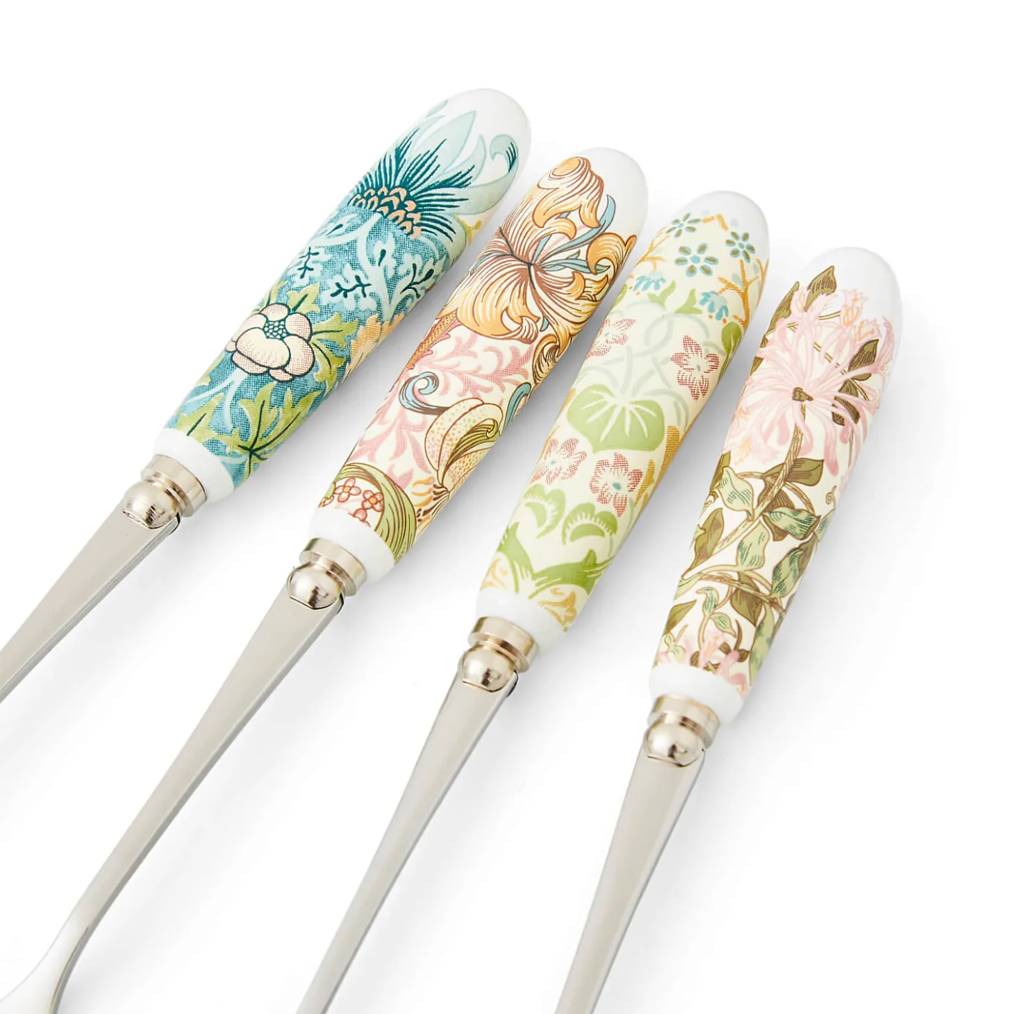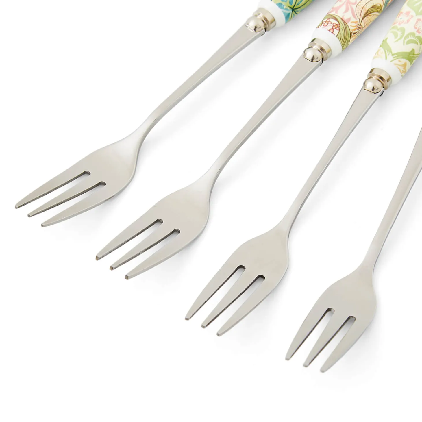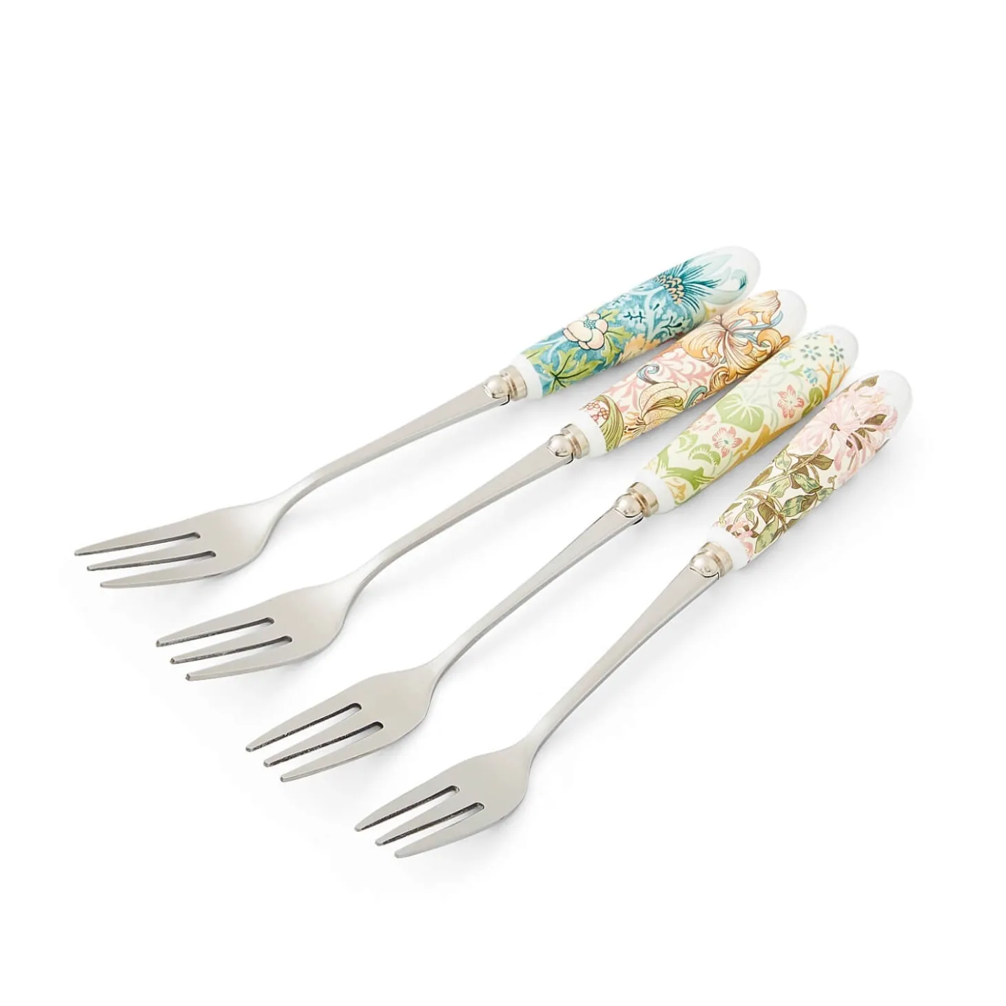 Morris & Co present their set of four Pastry Forks. Featuring the iconic botanical patterns of William Morris designed to add a warm cottage feel to your kitchen creating a beautiful, calm and restful touch to your home. The four stunning designs in soft and gentle hues create an impressive show of floral patterns that would make a striking afternoon tea party table setting when entertaining friends.