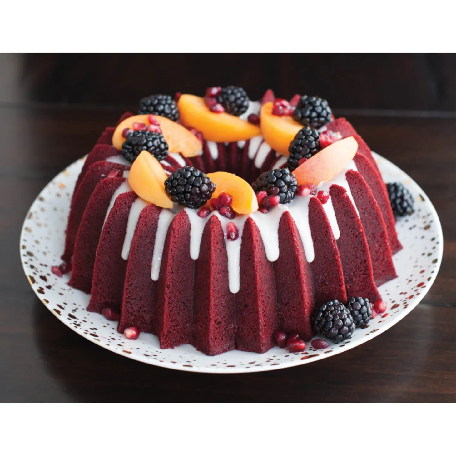 Nordic Ware presents the Brilliance 10-Cup Bundt Pan, designed to create showstopping cakes for any occasion. Made from high-quality cast aluminium, this pan ensures even heat distribution, resulting in perfectly baked cakes every time. The premium non-stick coating allows for effortless release, preserving intricate details with ease. Ideal for entertaining, simply decorate your cake with a dusting of icing sugar or cocoa powder for a fabulous finish.Â