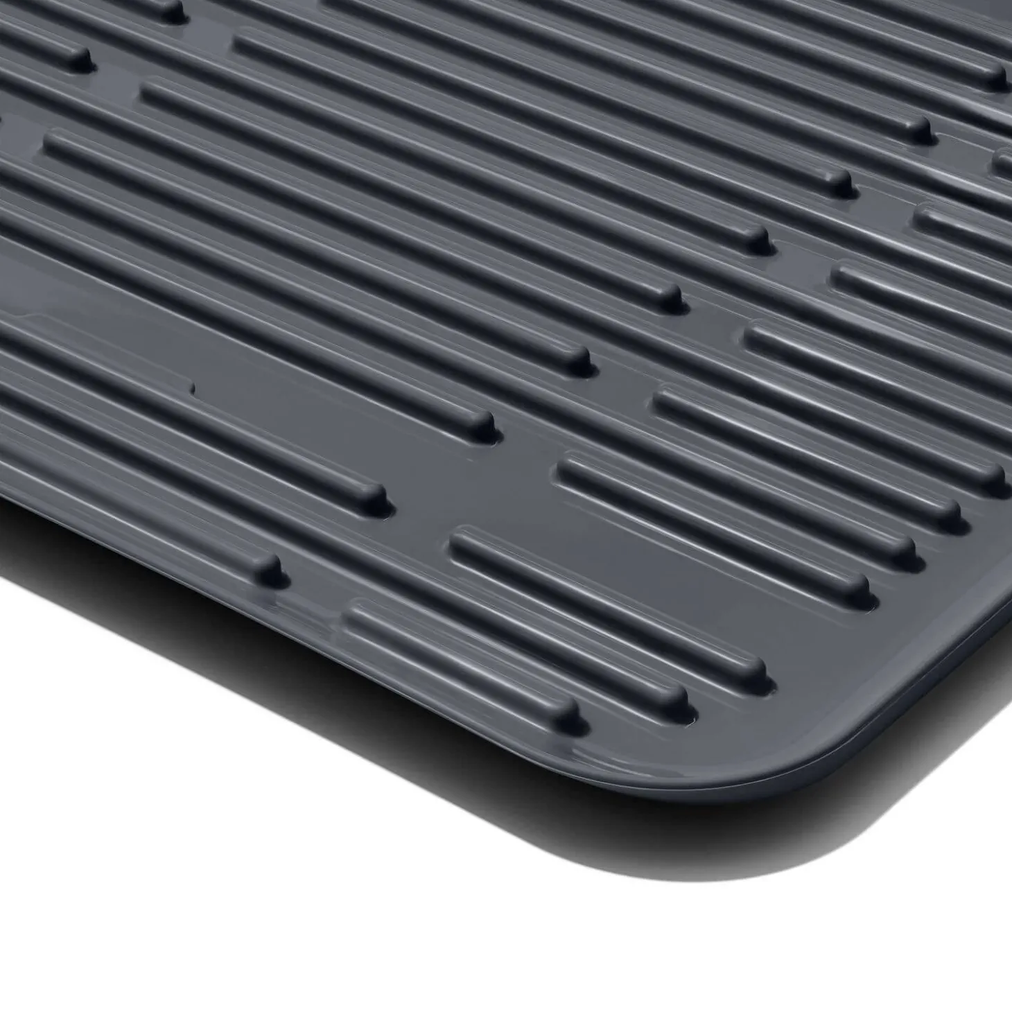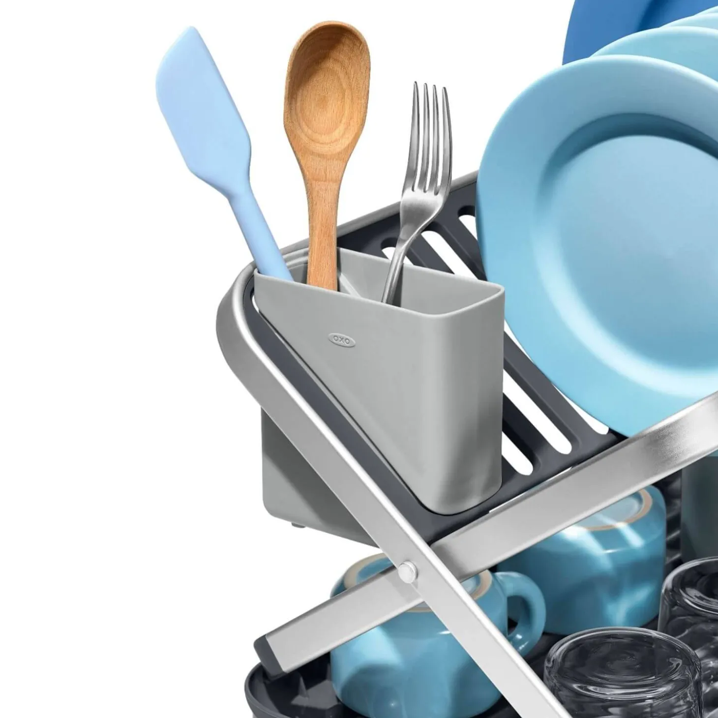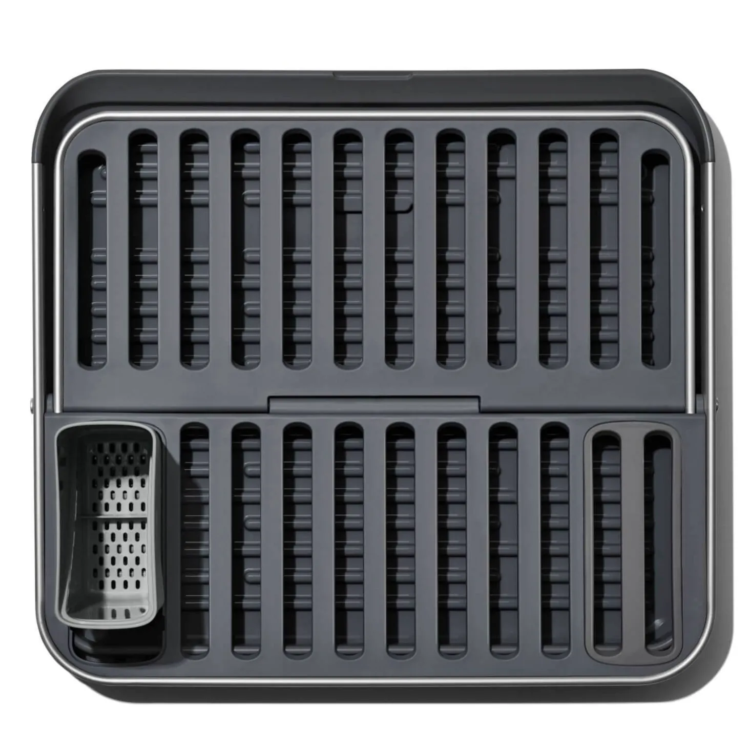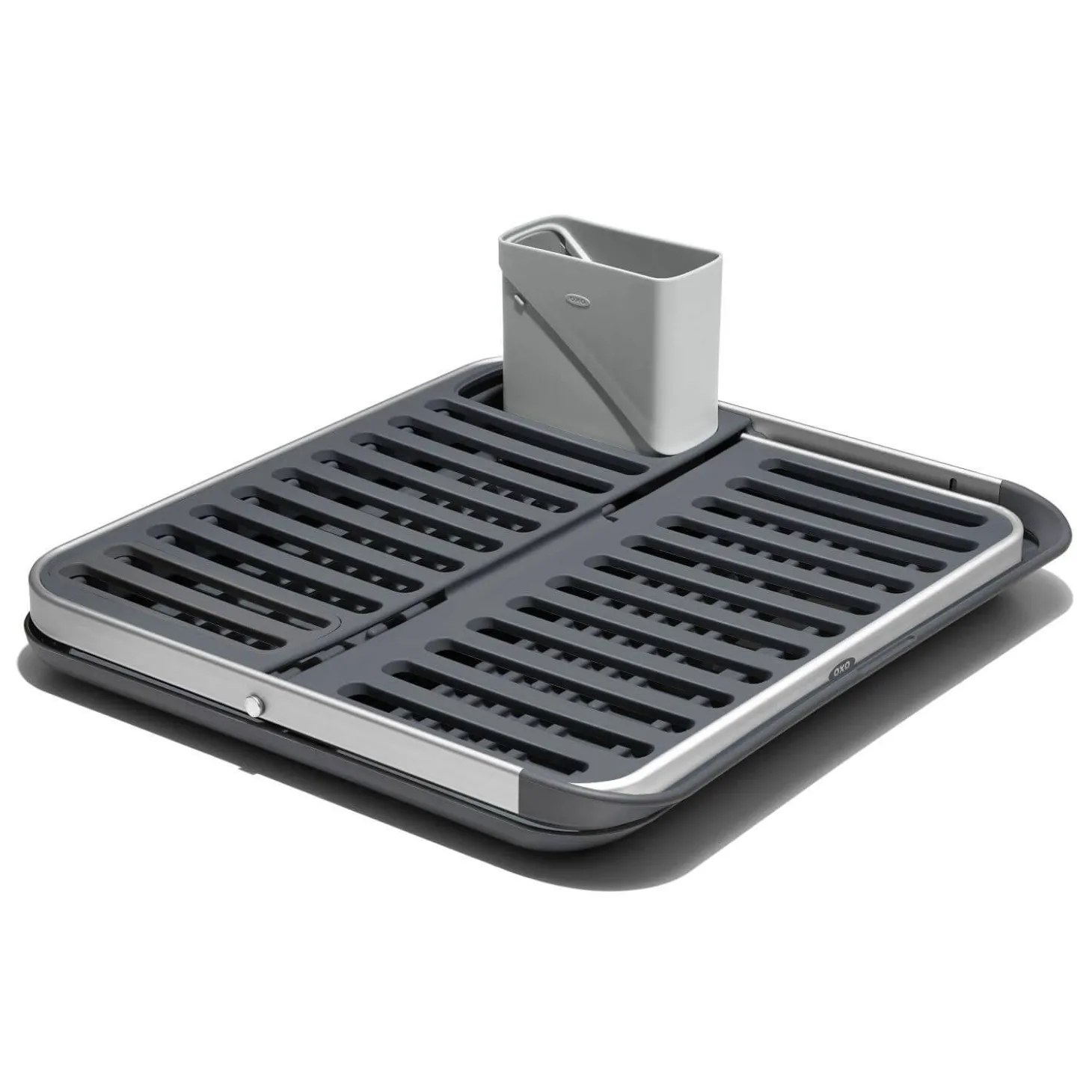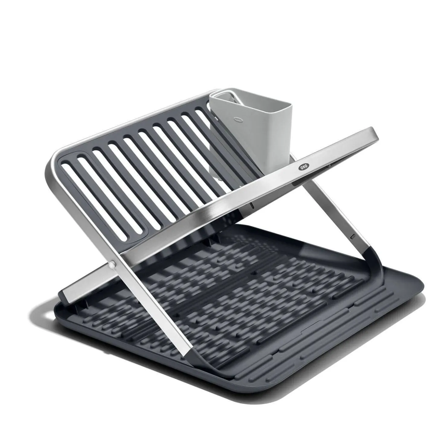 Space-saving and practical is this Aluminium Fold Flat Dish Rack in Grey by OXO Good Grips. The frame of this dish rack is made from aluminium which is rustproof, the draining board has ridges to allow water to drain away and the non-slip feet ensure stability on your countertop. This dish rack folds flat for draining small amounts of items and is easily stored away when not in use. A stylish dish rack for all kitchens.