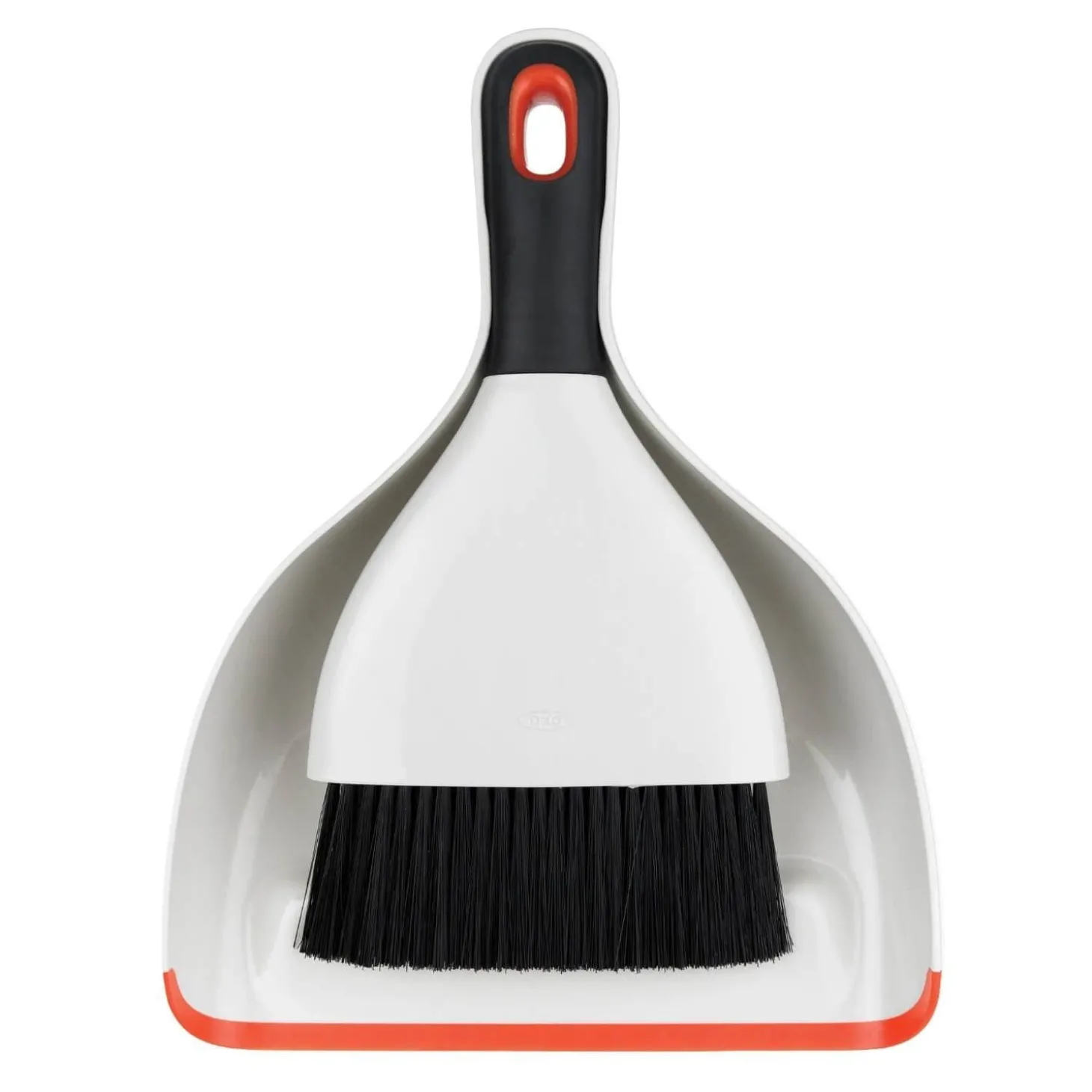 The white OXO Good Grips Dustpan & Brush Set is versatile in cleaning up big or small messes. The brush easily sweeps with its whisk-broom shape, whilst the dustpan’s rubber lip conforms to surfaces so that no mess remains behind. The soft, non-slip handle ensures a comfortable grip. The brush snaps into the dustpan for convenient storage. Â