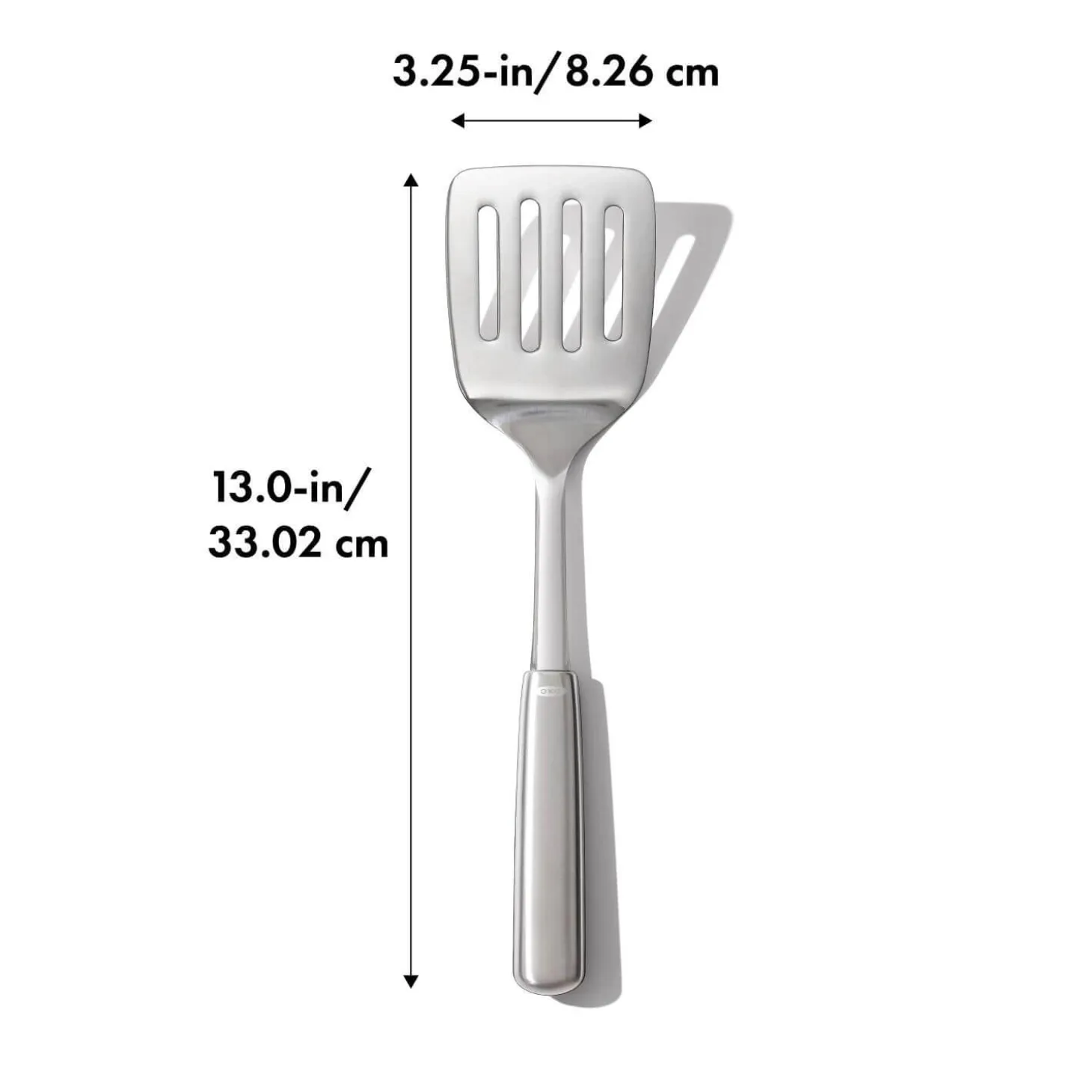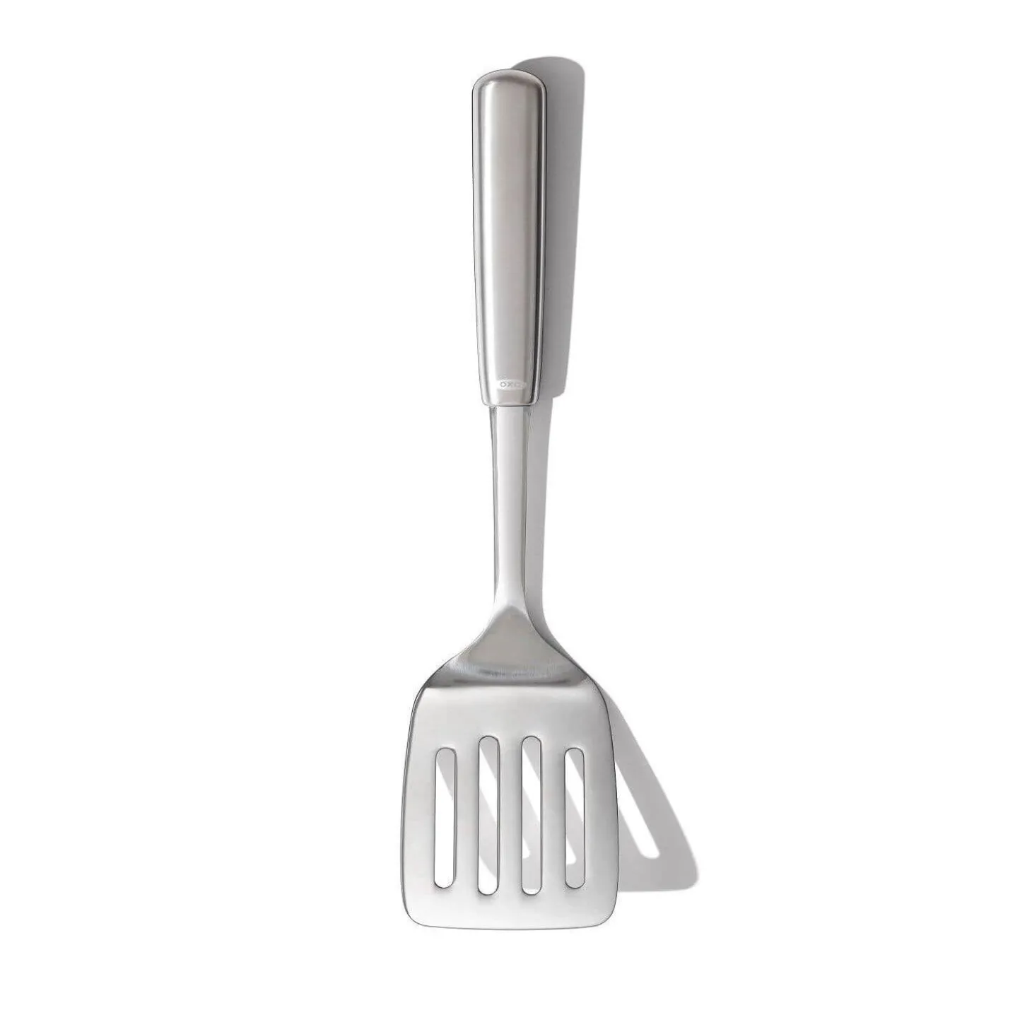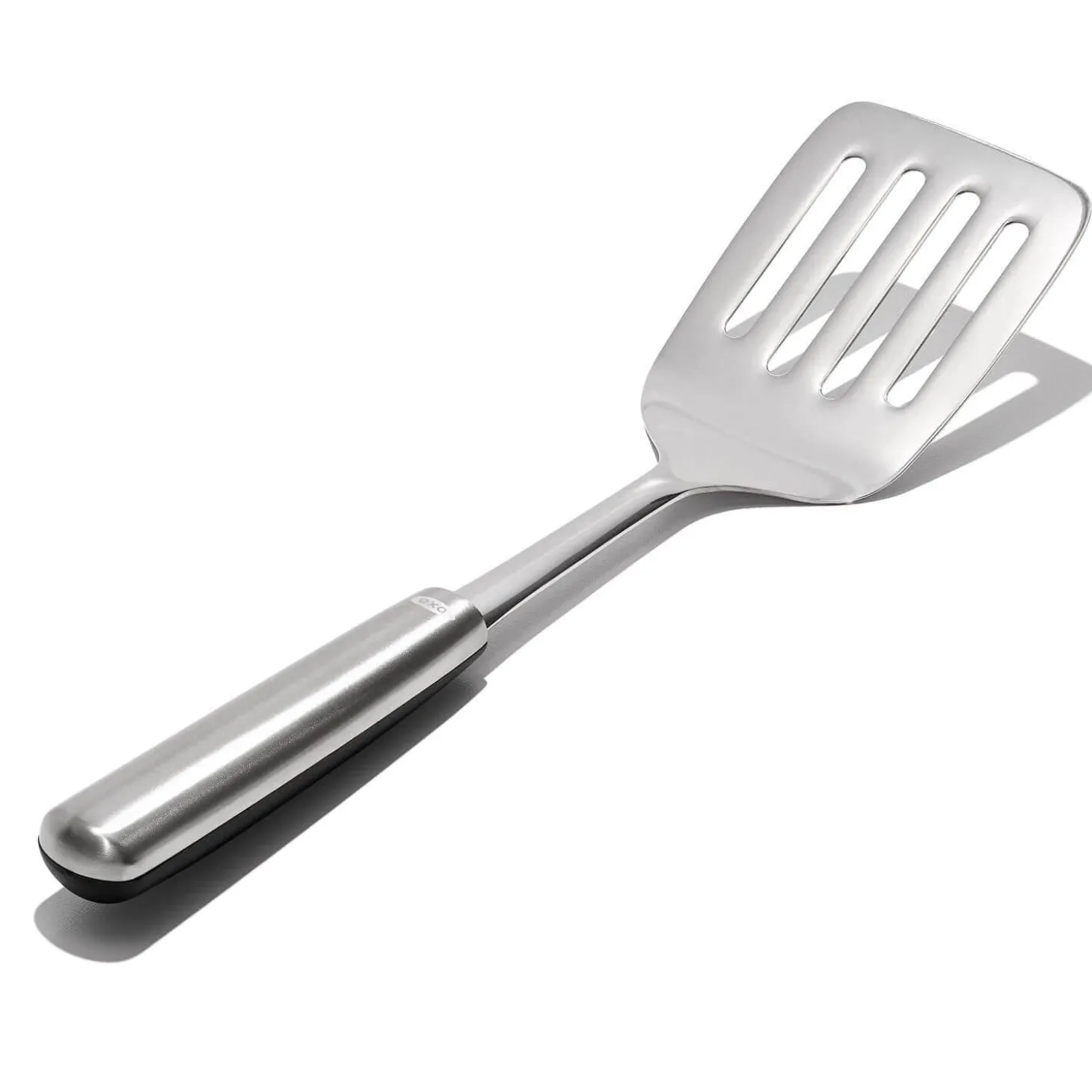 OXO presents their Steel Cooking Turner, the flexible head makes it easy to lift and flip food as you cook as well as being durable enough to chop ground beef. The head is very strong making it easy to slide under food, the non-slip handle is made from stainless steel and it is very ergonomic making this turner comfortable to use. This OXO turner will make a great addition to your utensil drawer.