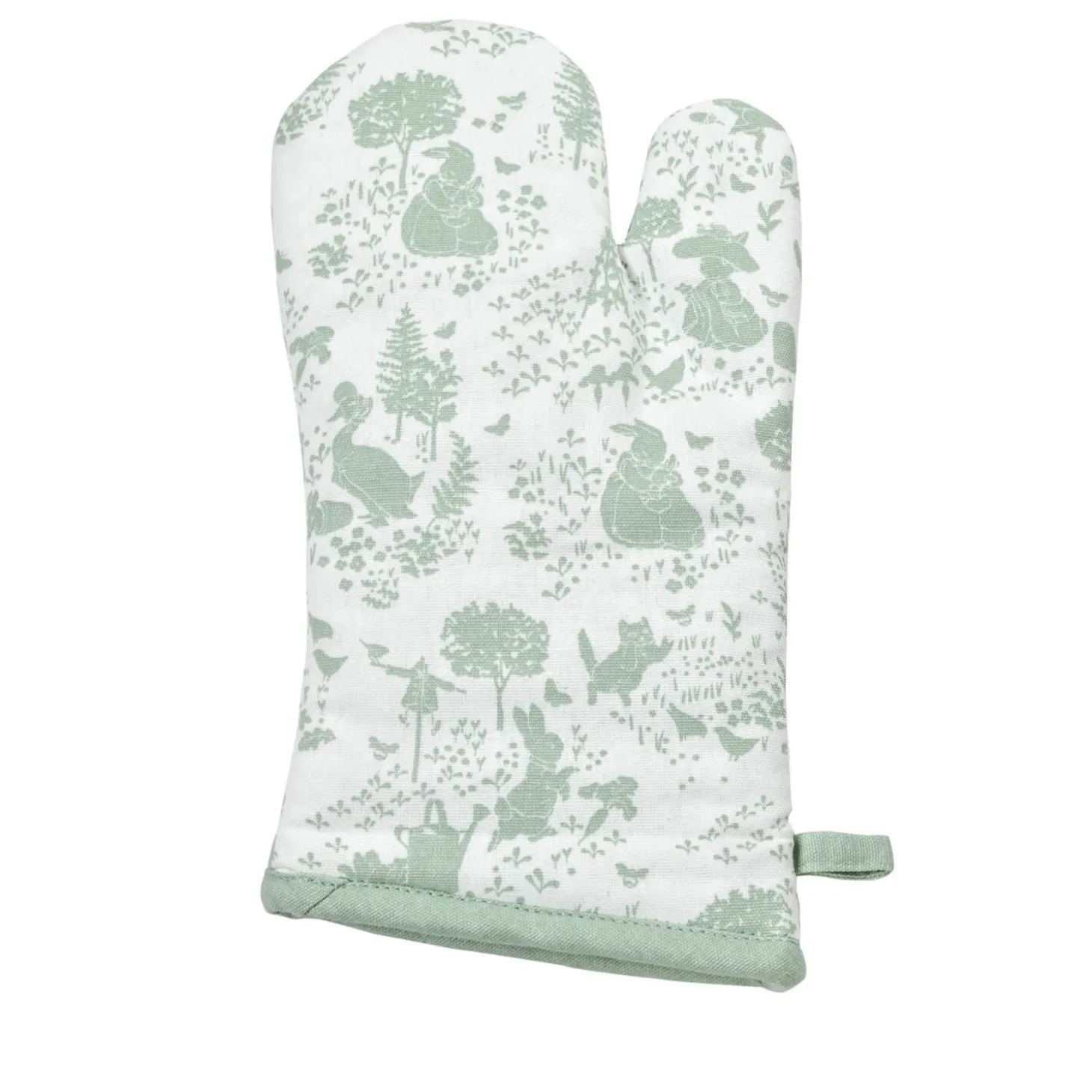 Eddingtons presents the Peter Rabbit Classic Pattern Single Oven Glove in Green. This oven glove is ideal for protecting your hand when handling hot pots and pans, making a lovely addition to your kitchen. These oven gloves are part of the Peter Rabbit classic pattern collection and would make a lovely gift or a treat for yourself.