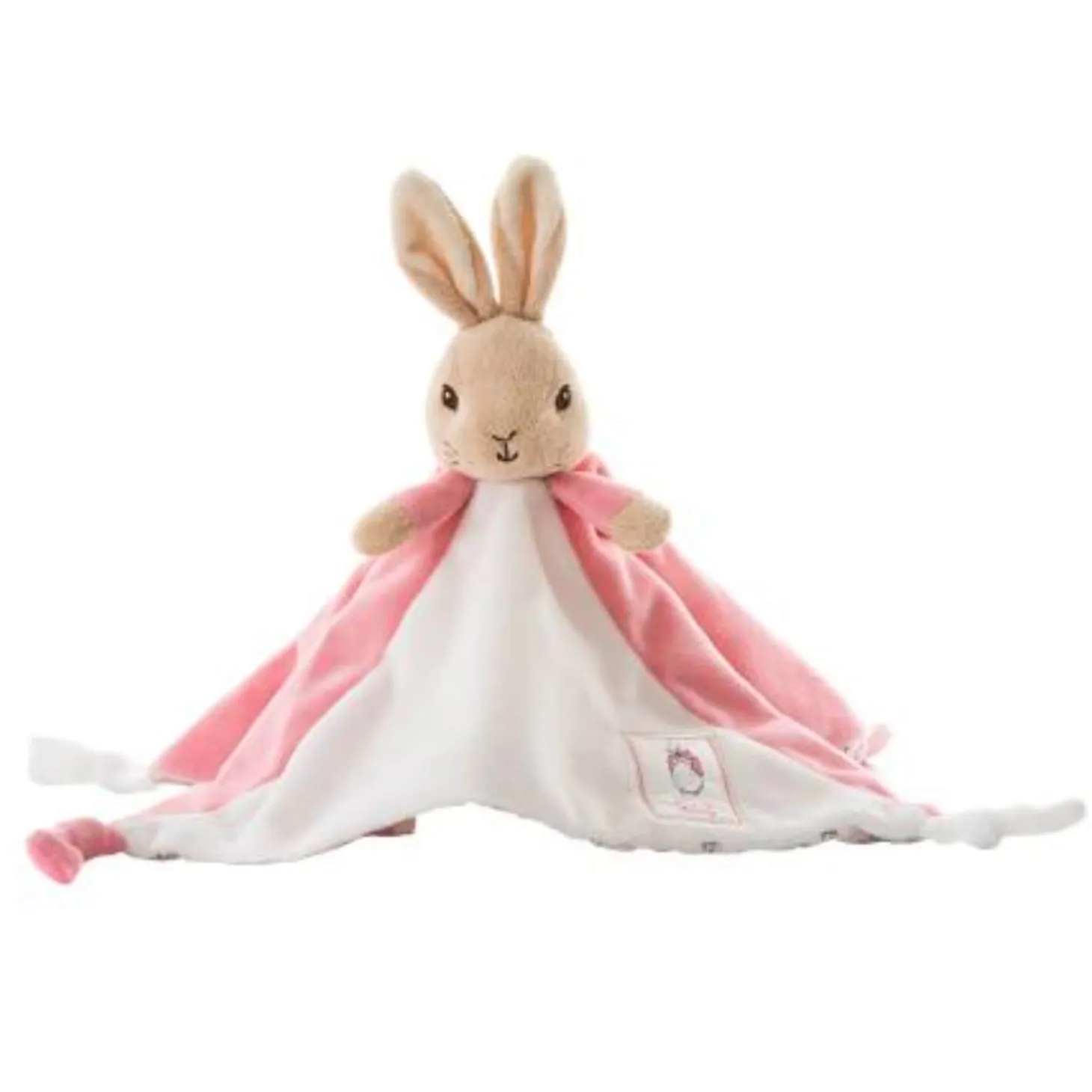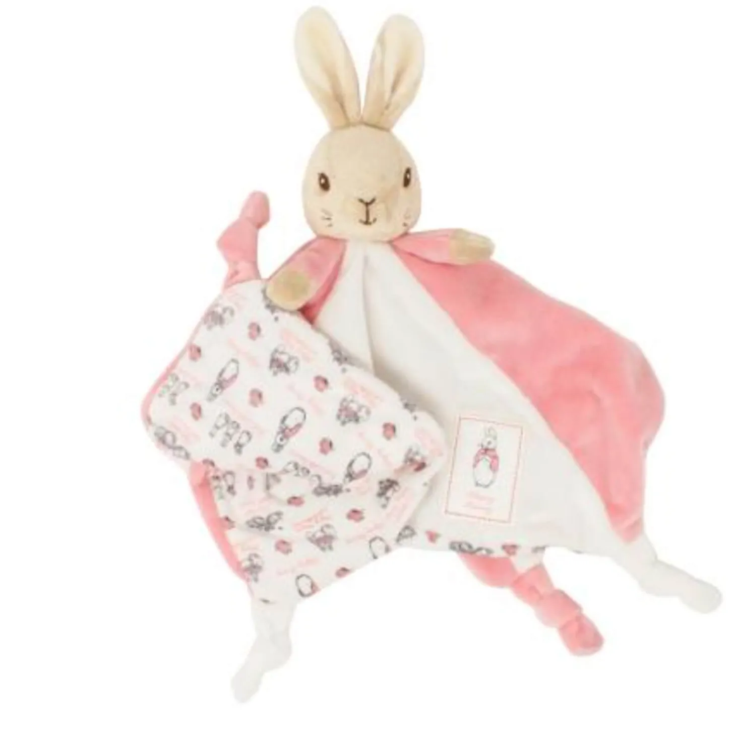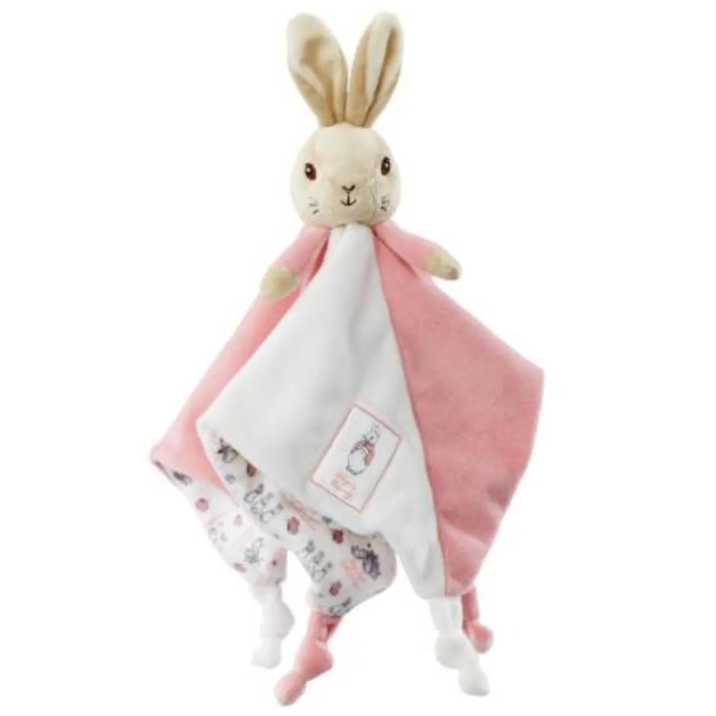 Presenting the Flopsy Bunny Comfort Blanket, inspired by the much-loved character from the classic tales created by Beatrix Potter. Suitable from birth and crafted from luxuriously soft fabric, this blanket is perfect for cosy snuggles at bedtime or storytime. Featuring an adorable bunny motif and knotted corners to encourage sensory play, this beautiful comforter makes an ideal first companion for little ones.