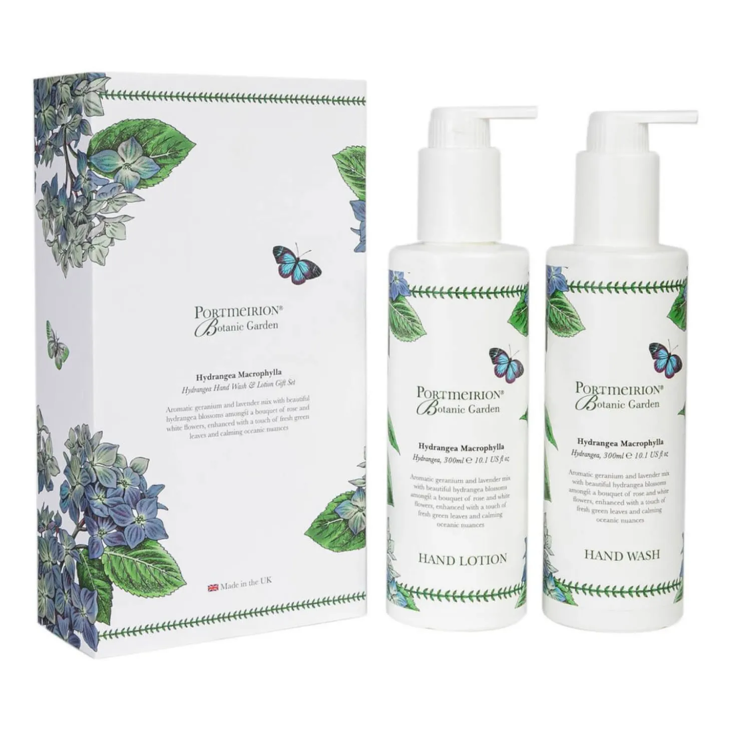Portmeirion presents this hand wash & hand lotion gift set in the scent ‘Hydrangea’ which forms part of their popular Botanic Garden. Expressing an aromatic geranium and lavender mix with hints of hydrangea blossoms, roses and white flowers and is rich in distinctive notes of fresh green leaves and calming oceanic nuances. Each piece in this set holds a volume of 300ml and is perfect to be displayed for yourself, friends and family to use.Â