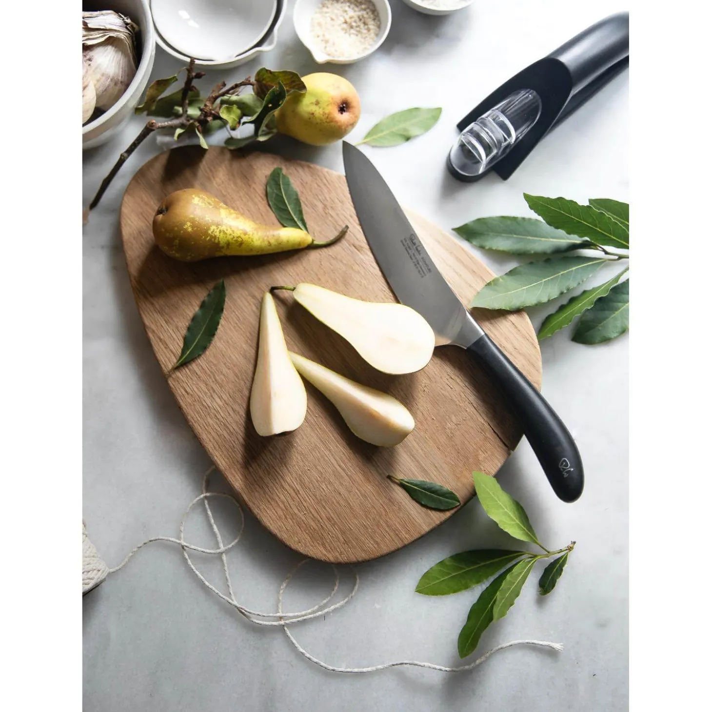Robert Welch presents the 32cm Pebble Chopping board, made from solid oak, this beautiful chopping board made of natural wood protects your knives when slicing food in the kitchen. It is an attractive addition to your kitchen countertop.