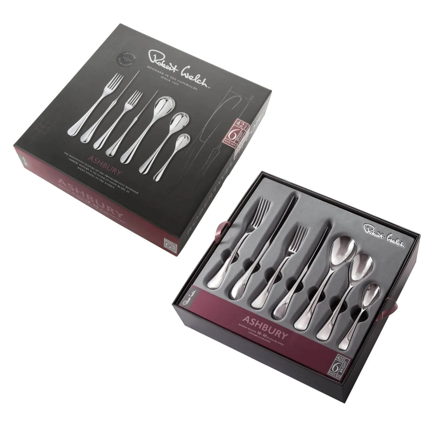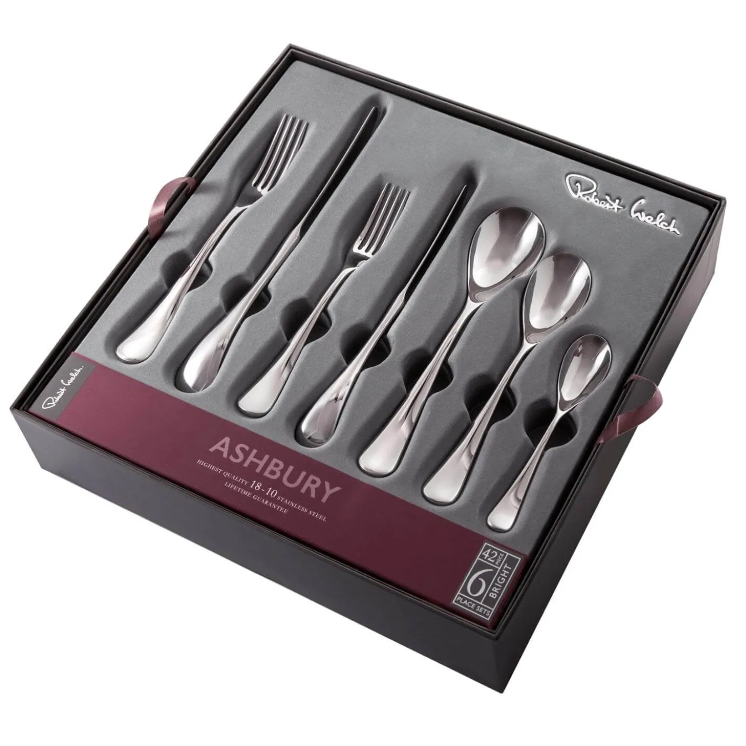 Robert Welch presents the Ashbury Bright 42-Piece Cutlery Set. The sleek design of the cutlery contrasts beautifully with the modern silhouette of the dining table. The gentle upward curve at the ends of the fork and spoon handles mirrors the downward curve of the knife handle. Made from specially forged hardened stainless steel, this cutlery set is resistant to rust and corrosion, making it ideal for both special occasions and everyday use.
