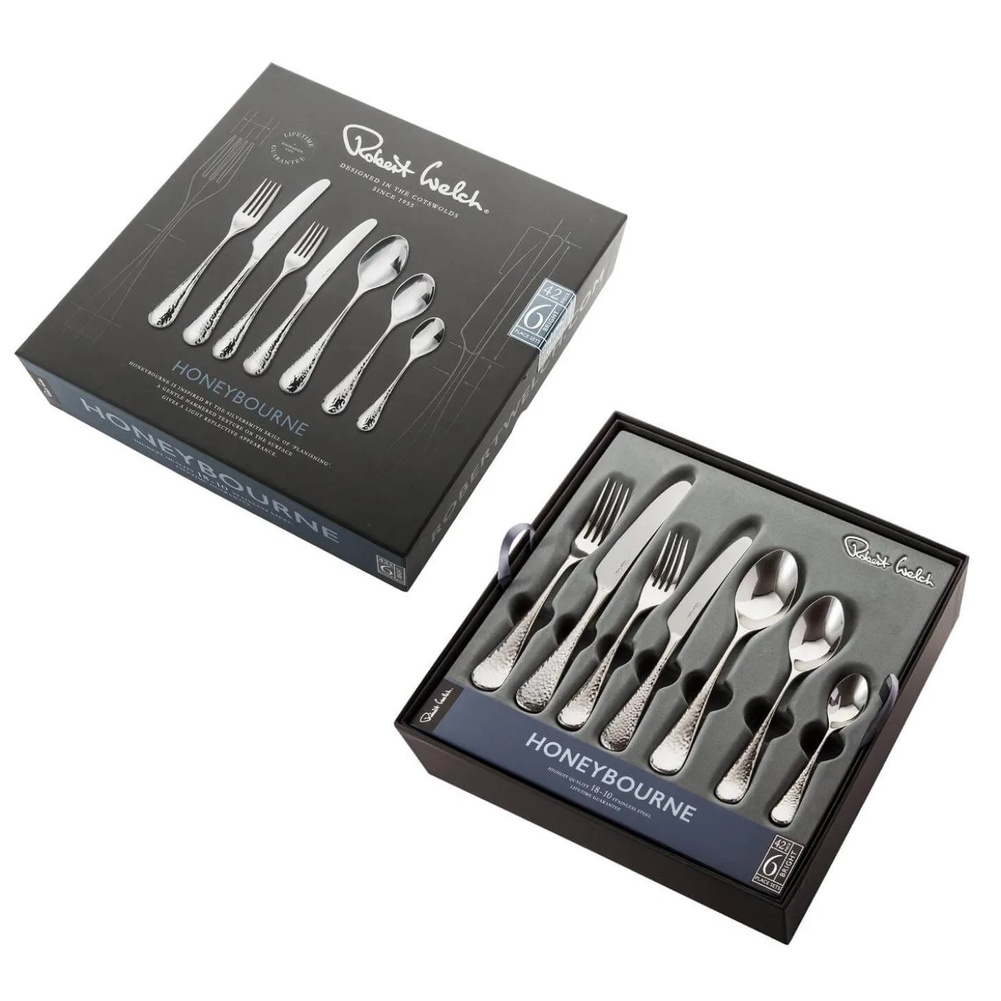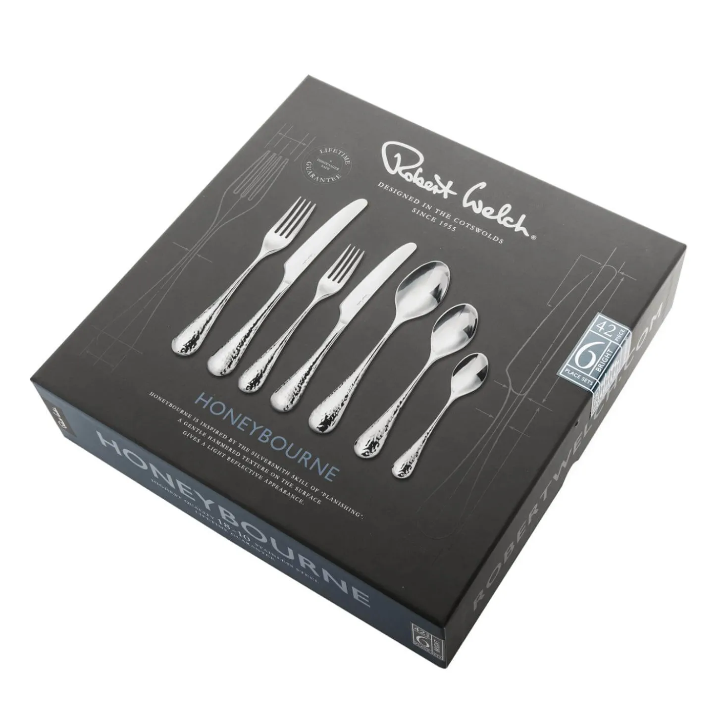 Robert Welch presents the Honeybourne Bright 42-Piece Cutlery Set. The beautifully dimpled handles reflect light, enhancing the look of your table setting with a stylish touch. Made from specially forged hardened stainless steel, this cutlery set is resistant to rust and corrosion, making it perfect for both special occasions and everyday use.