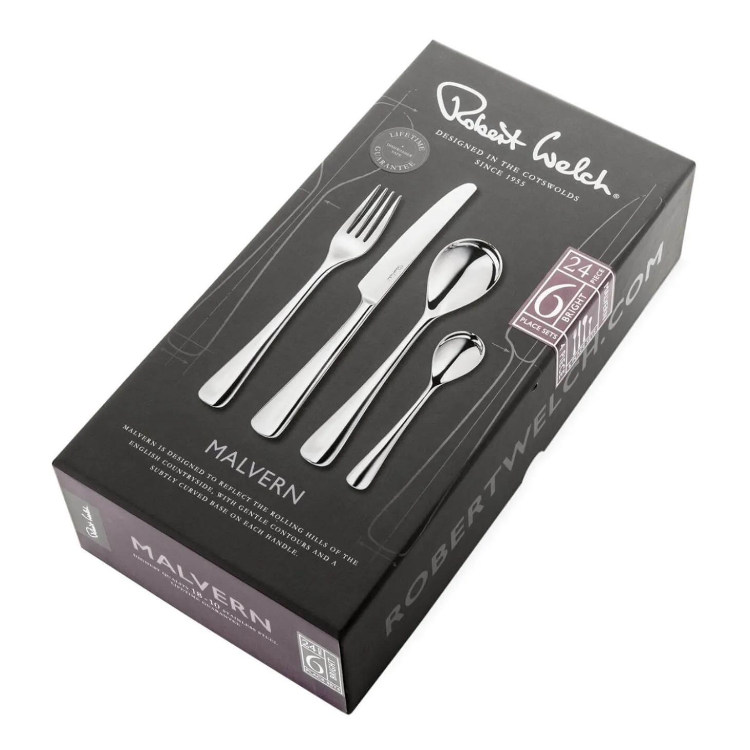 Robert Welch presents the Malvern 24-Piece Cutlery Set, featuring mirror-polished curves and contours finished with a gently subtle curved edge. This set will suit any table setting and add a touch of class when entertaining your family and friends. Created from specially forged hardened stainless steel which will not rust or corrode makes this cutlery set suitable for special occasions and everyday use.Â