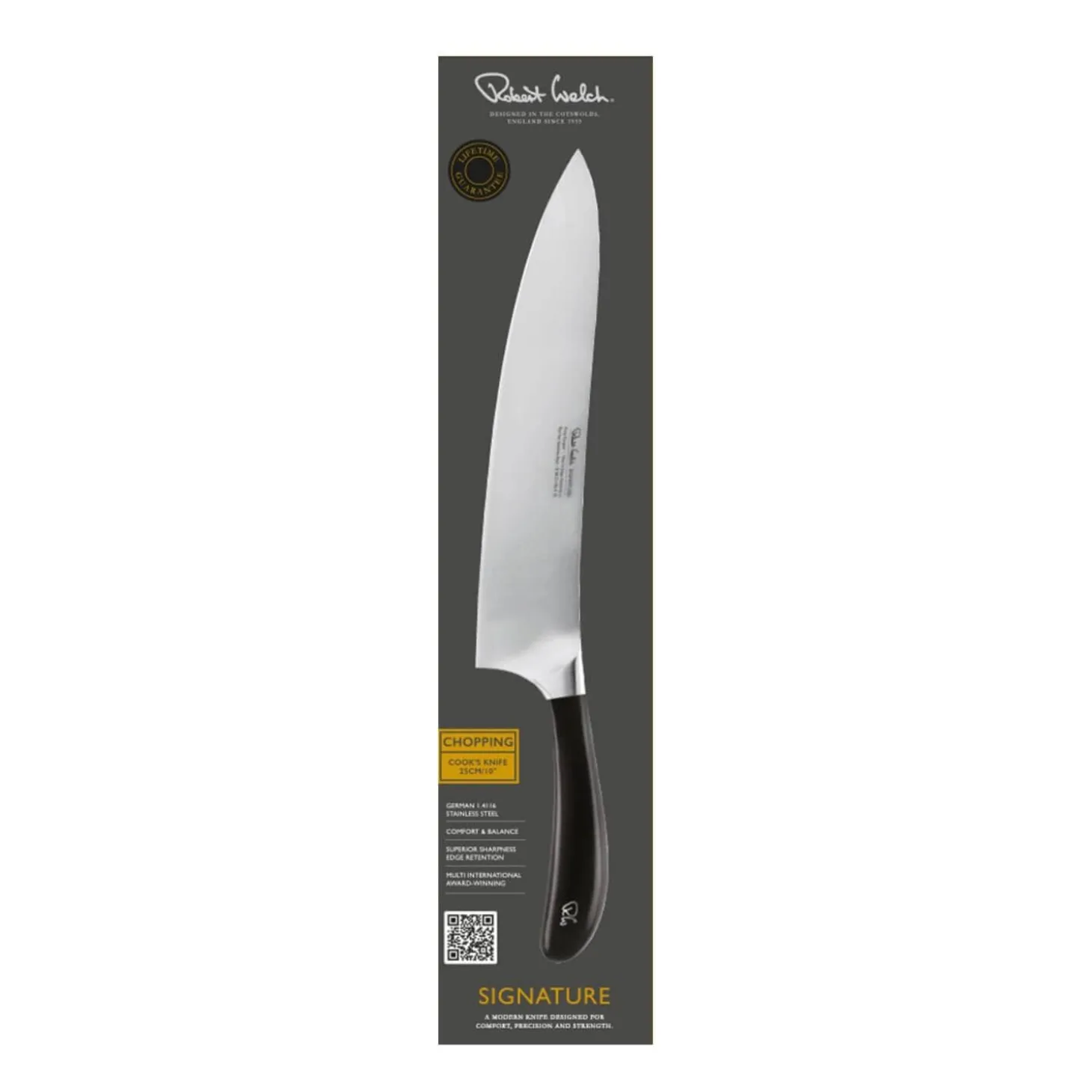 This 25cm Cooks knife forms part of the Signature kitchen knife range by Robert Welch. Each item in the collection has been designed with comfort, precision and strength in mind, created from a single billet of German stainless steel with a hand-sharpened finish of 15° for exceptional sharpness. Includes a lifetime guarantee.