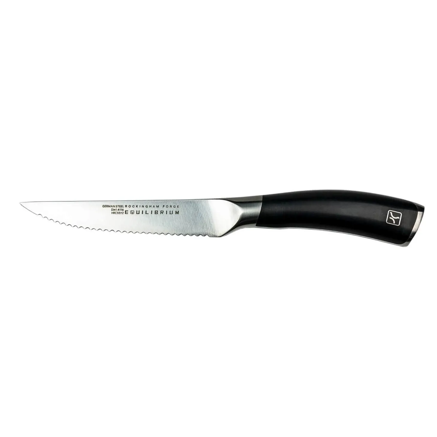 This 11.5cm steak knife forms part of the Equilibrium range by Rockingham Forge. Each item in this collection features high-quality chromium-molybdenum-vanadian steel which has been ice-hardened for long-lasting sharpness and rust resistance. The knife-edge is hand-finished with taper-grinding for sharper cutting action and also a curved design handle for a more comfortable and easy grip. Perfect for cutting through steak with ease.