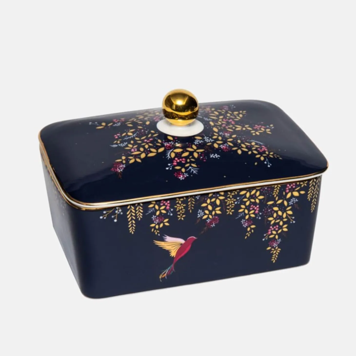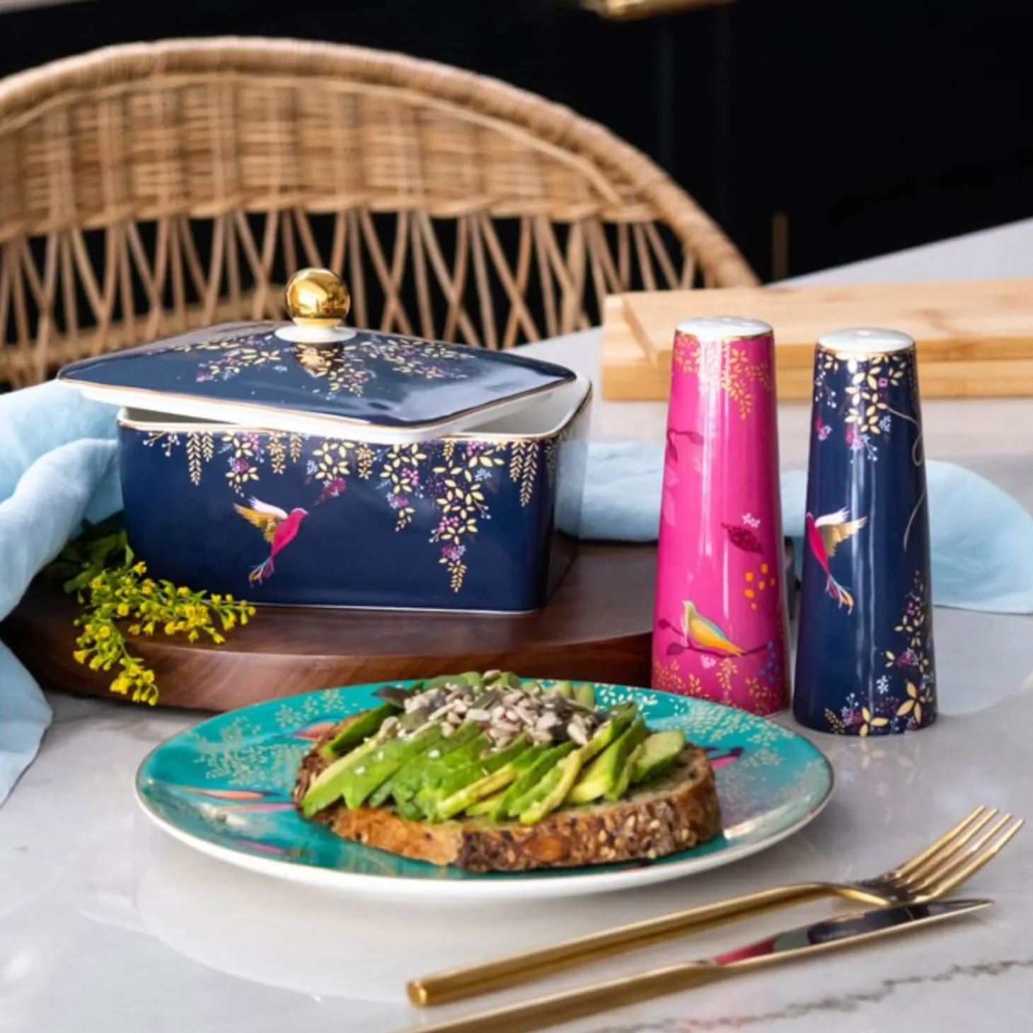 Beautifully crafted from fine china and perfectly complementing the rest of the Chelsea collection from Sara Miller, this colourful and stylish butter dish with lid has a unique style synonymous with the lifestyle brand. An elegant design on a navy background featuring Hummingbirds birds embellished with luxurious golden accents, the colour tones of each design in the Chelsea collection draw on inspiration from around the world. Presented in a gorgeous gift box, this butter dish would make a lovely gift or a treat for yourself.