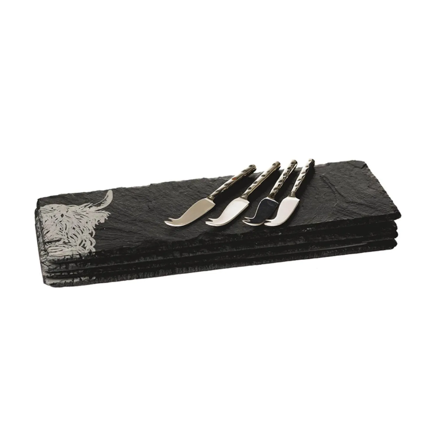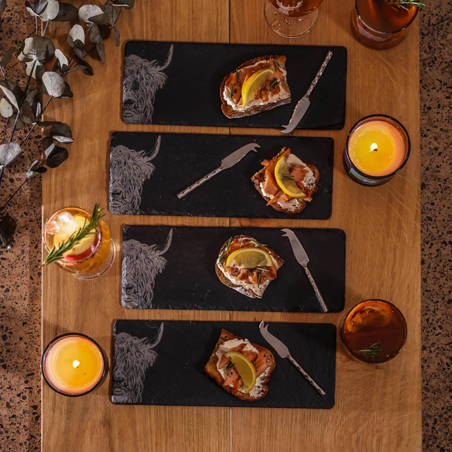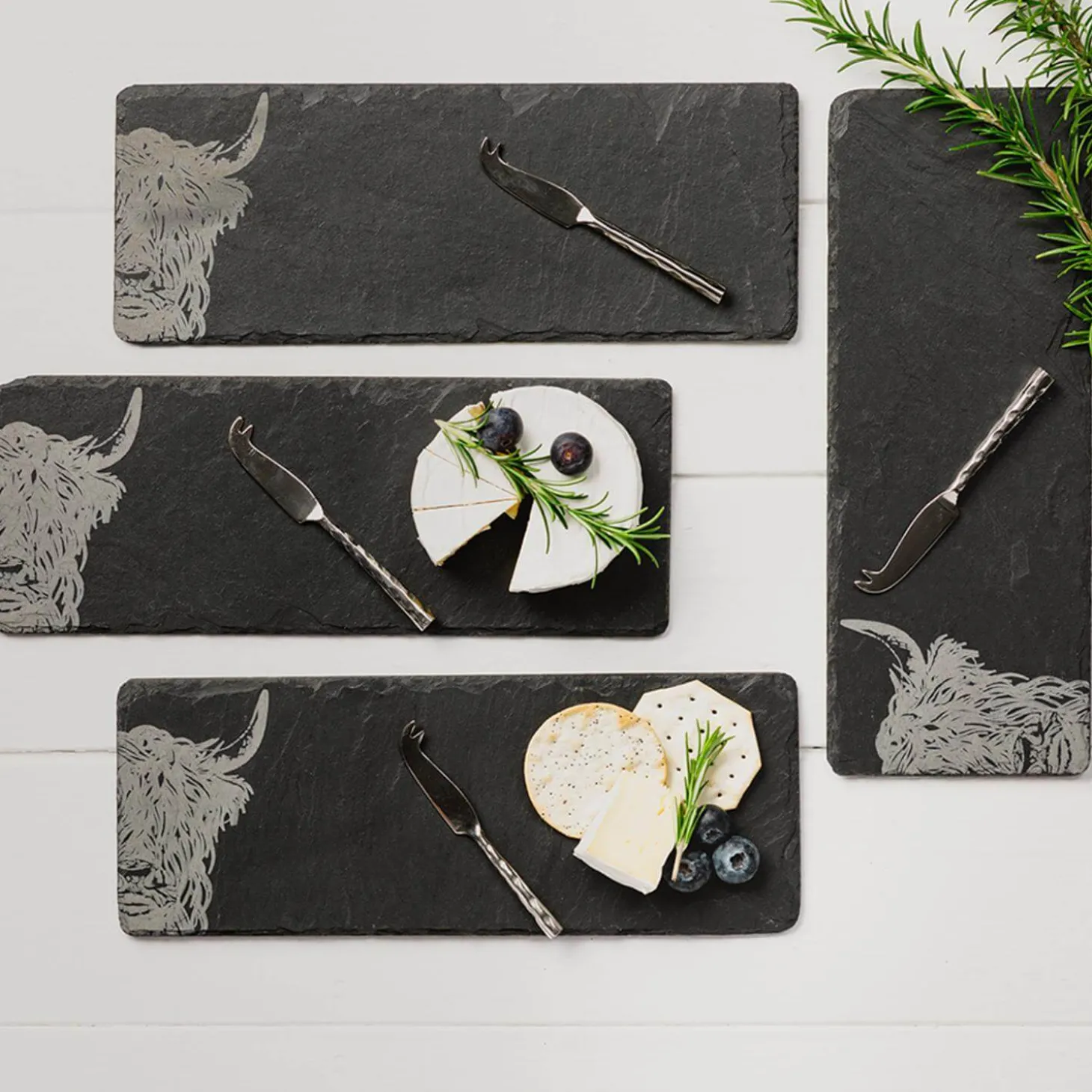 Selbrae House presents their ‘Highland Cow’ 4-Piece Mini Slate Cheese Board & Knife Set, perfect for individual servings of cheese when you are entertaining. Each cheese board in this set is engraved with a delightful highland cow. Complete with a high-quality gift box, this set makes a perfect gift for engagements, weddings, housewarmings and birthdays or a wonderful treat for yourself.
