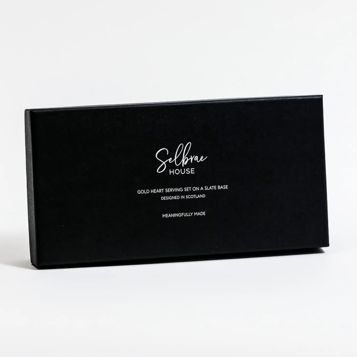 Selbrae House presents the Gold Heart Serving Dish Set with a beautiful slate board. Ideal for serving dips and treats at dinner parties, this set features a slate base and two hand-hammered bowls with a heart-shaped gold interior and black exterior, perfect for serving a variety of dips or sauces.