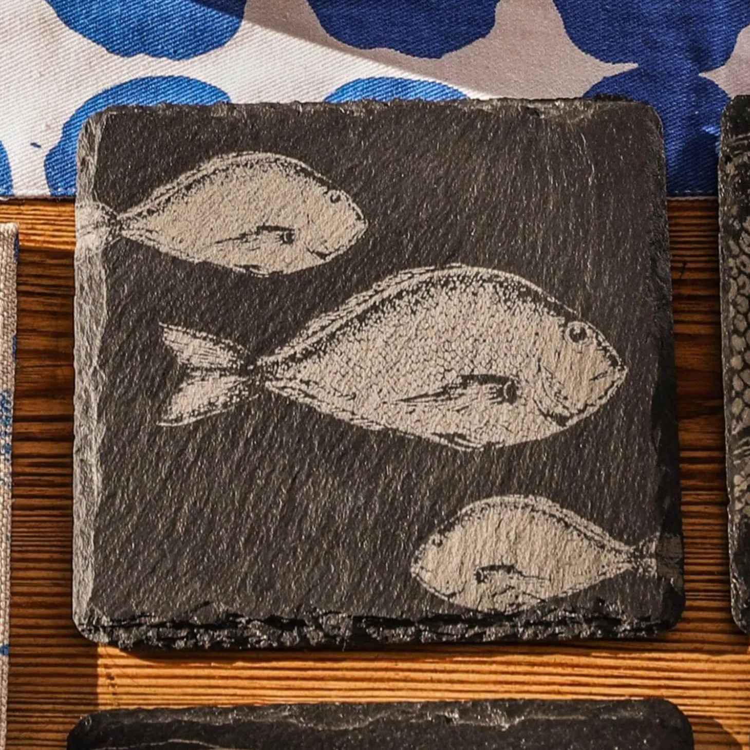 Selbrae House presents their ‘Fish Repeat’ Slate Coaster, beautifully engraved with a trio of fish. Perfect for protecting all your table tops from hot drinks or water marks, the underside is padded to prevent scratches. An attractive coaster for your home bar or lounge area.