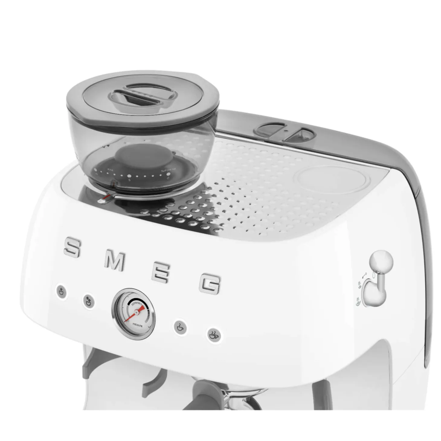 Experience the best in-house barista experience with the Smeg EGF03 machine. It is equipped with various features including stainless steel conical burr grinders that evenly grind coffee beans to preserve the flavour and aromas. Also included is a 58mm filter holder, a professional steam wand and a pressure gauge dial that allows you to monitor the espresso extraction throughout the brewing process. - Thermoblock Heating