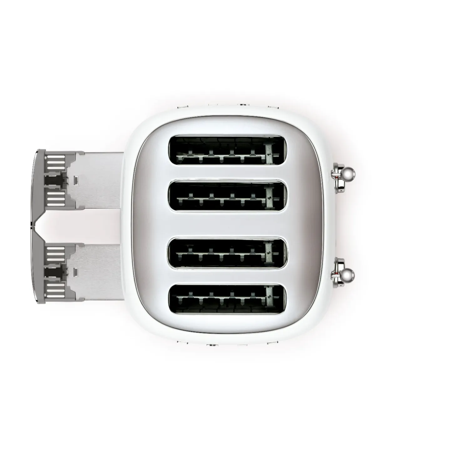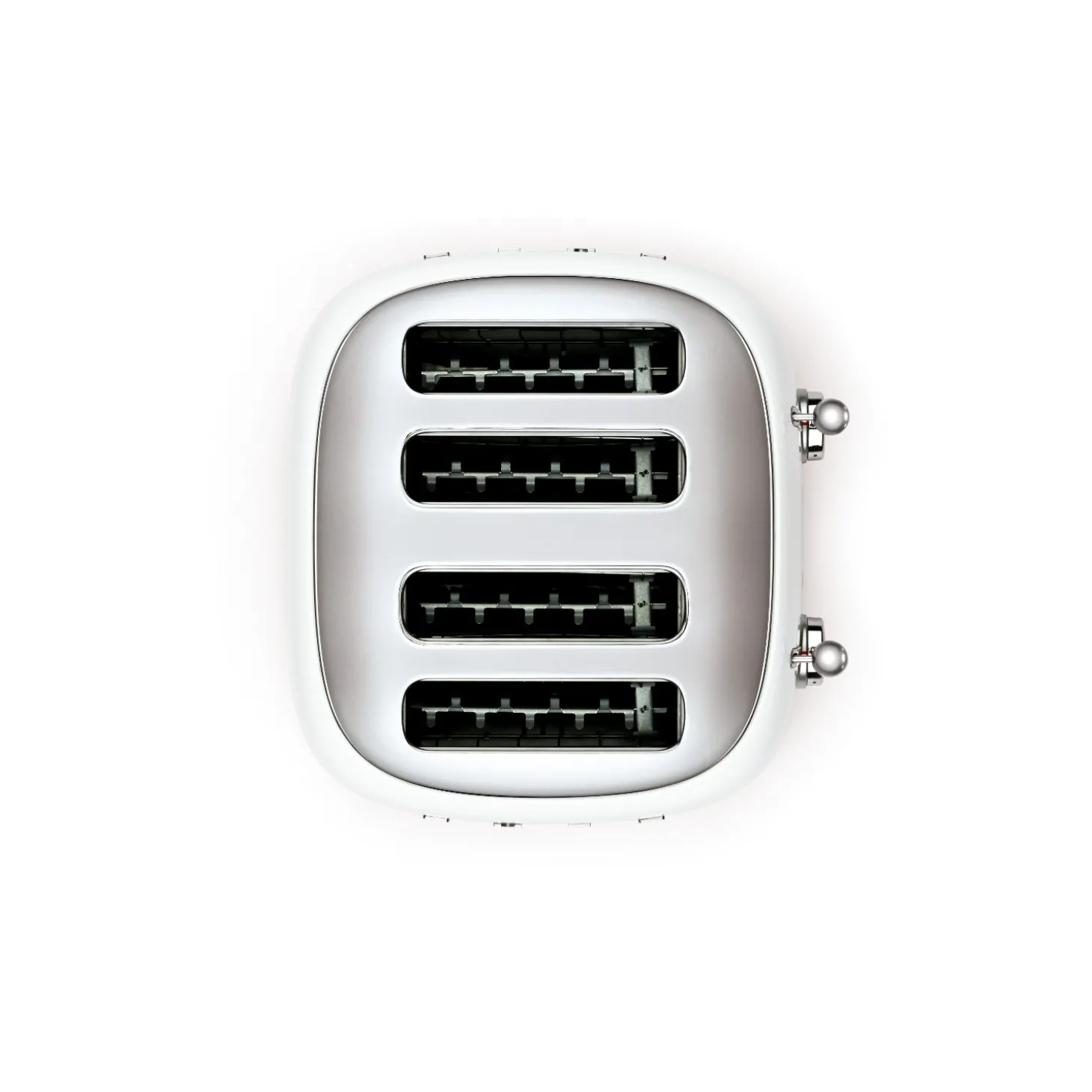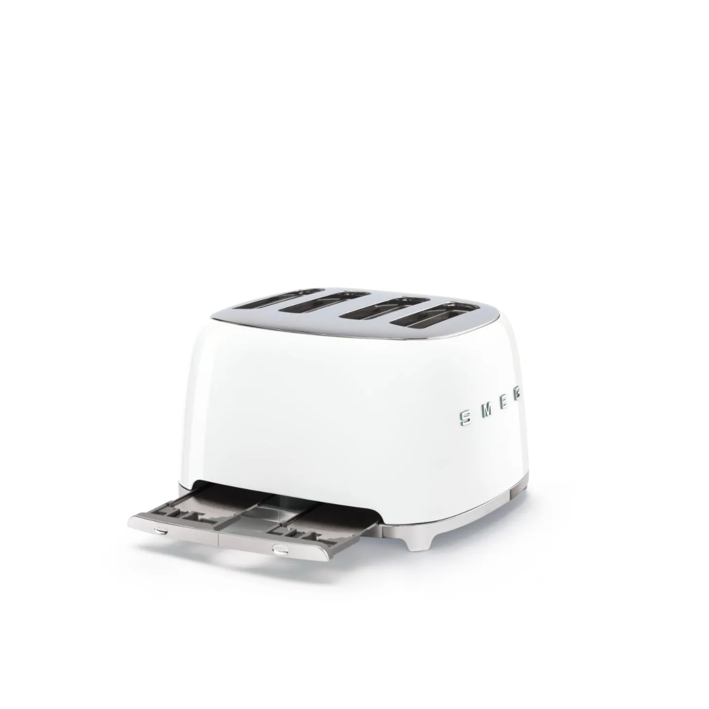 Toast a variety of bread with the Smeg 4 slice retro toaster in White. Sporting a classic 1950’s Americana design with its seamless curved edges, stylish silver accents and raised SMEG logo; this retro shape toaster makes a true style statement in any kitchen.