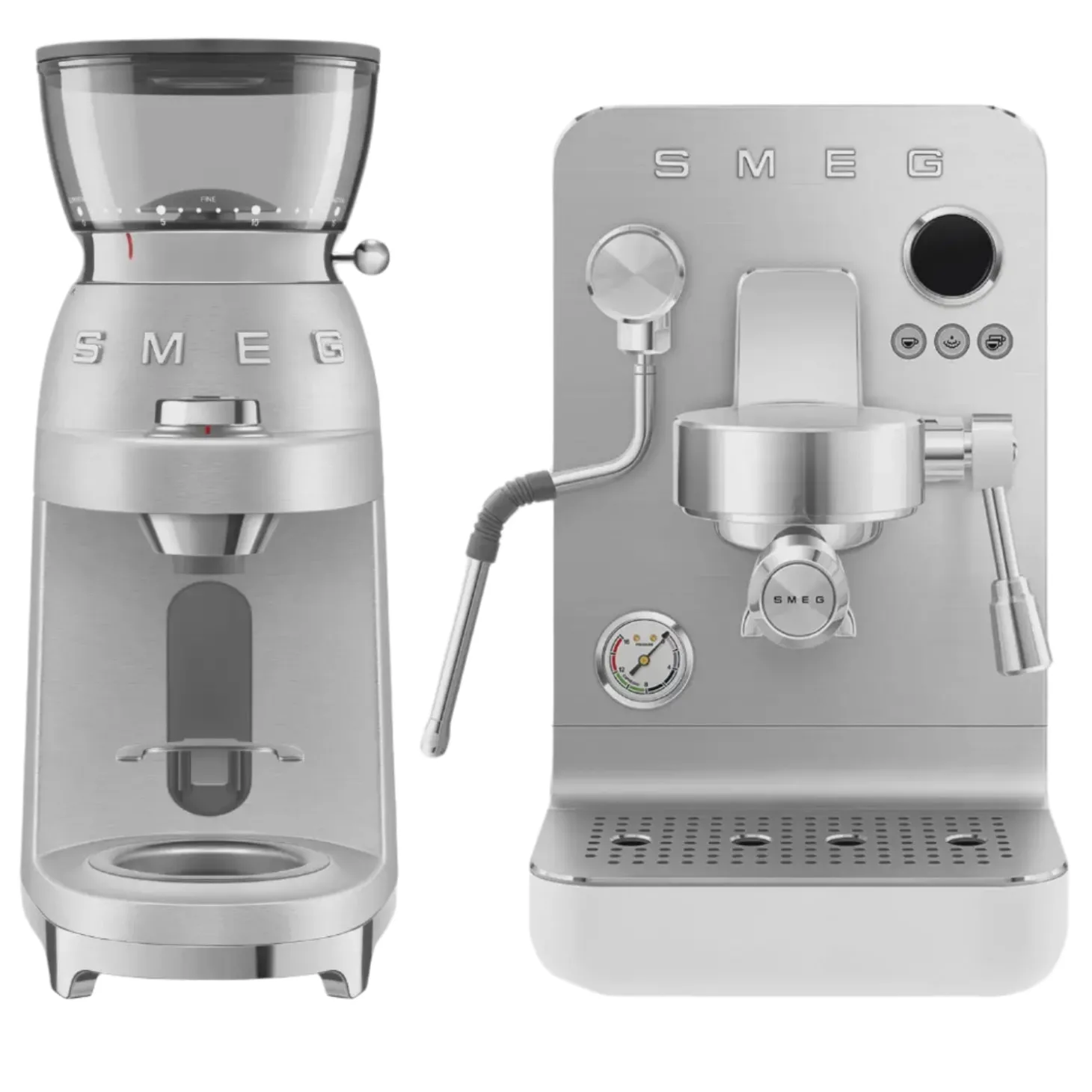The Smeg EMC02WHMUK Mini Pro Espresso Coffee Machine in Matte White combines style and user-friendliness. It features two pre-set espresso functions, a professional pressure gauge, and three thermoblocks, allowing it to be ready in minutes and eliminating wait times between brewing coffee and frothing milk. One thermoblock is dedicated to brewing coffee, while another is used for the steam circuit. The group head is actively heated to ensure precise temperature control, enabling you to create authentic Italian espresso and coffee-based drinks quickly. Combine this machine with the excellent Mini Pro Coffee Grinder, which delivers professional-grade grinding performance. With 50 adjustable grind settings, you can easily switch between a super fine espresso grind and coarser grinds, allowing you to become a superb barista in the comfort of your own home!