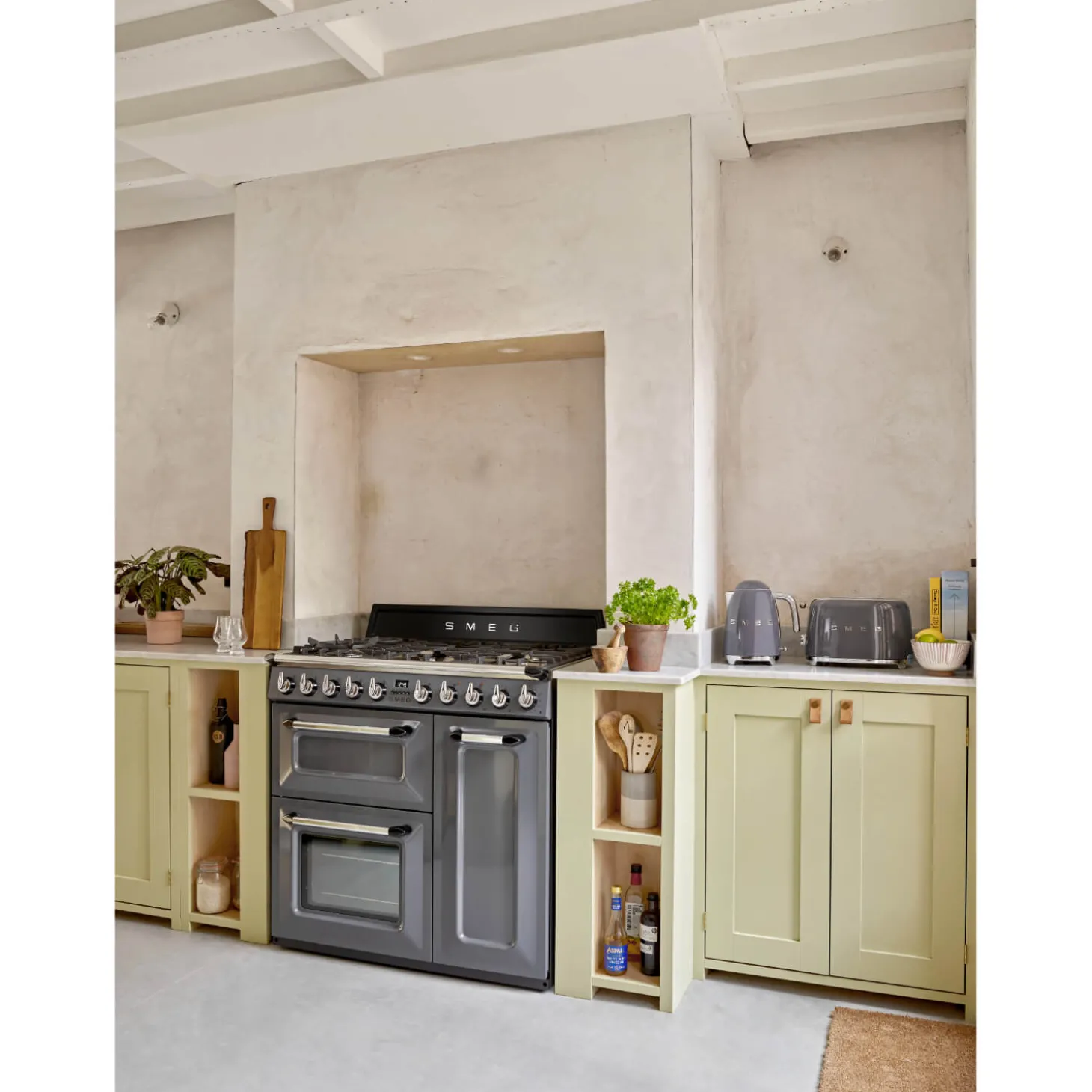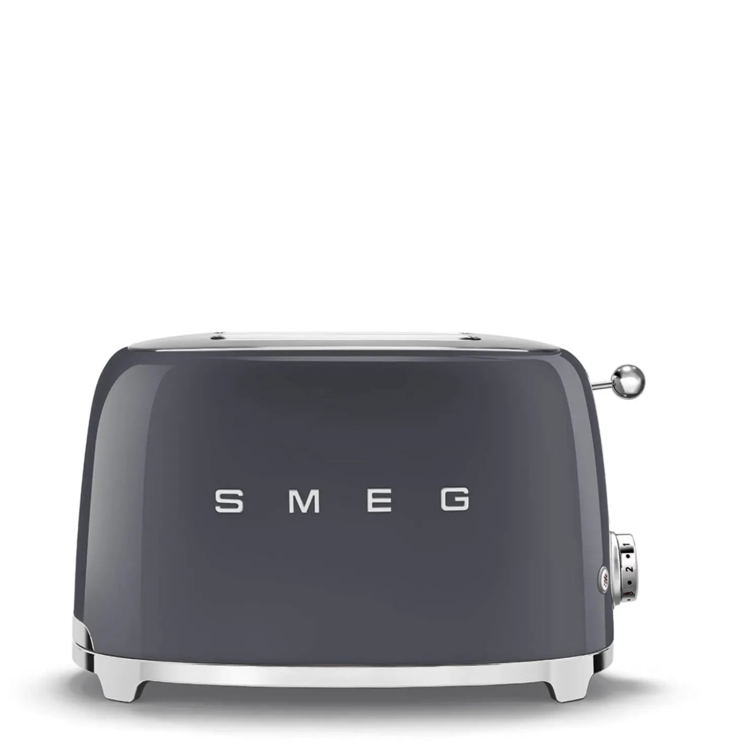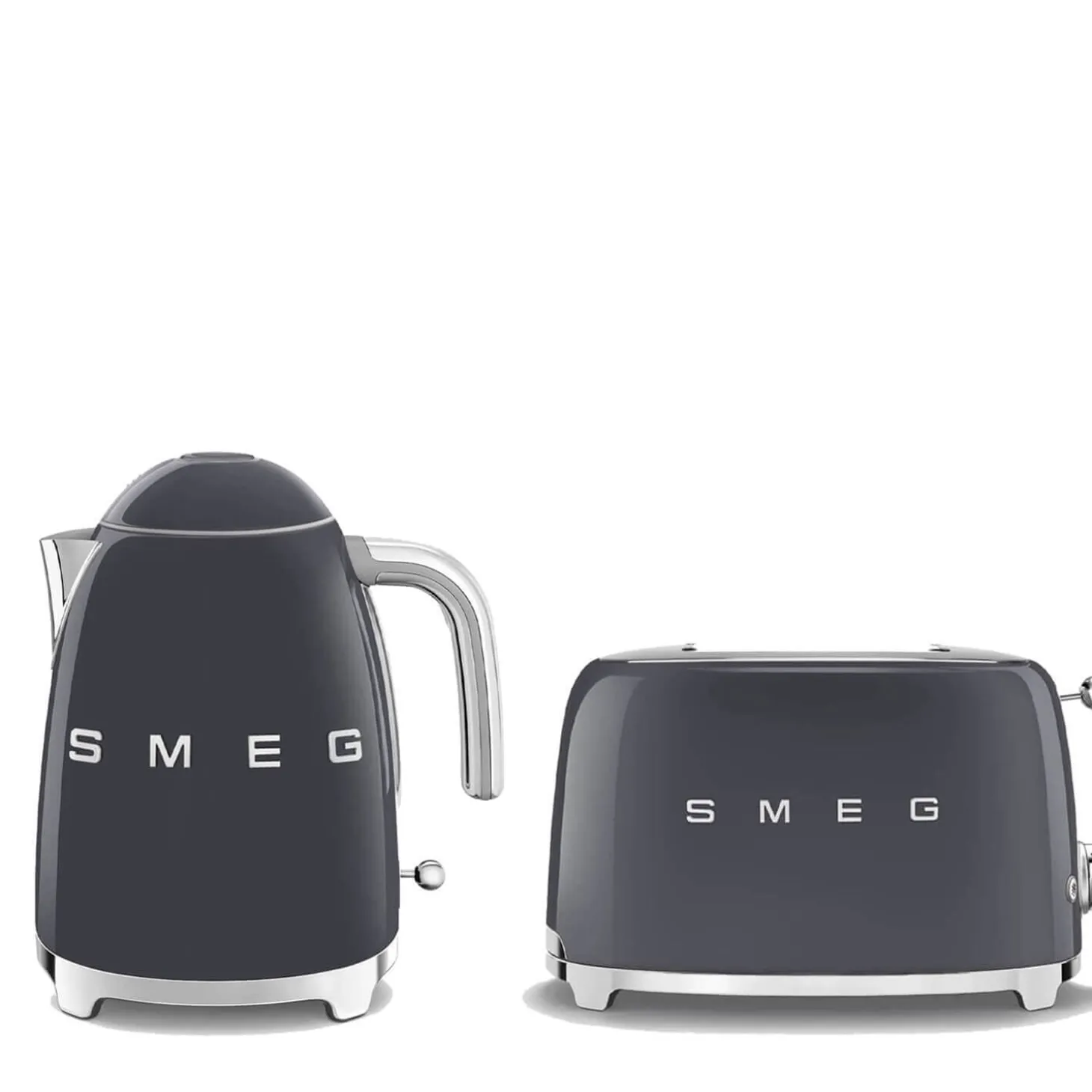 Each item in the Smeg slate grey 1.7-litre jug kettle and 2 slice toaster set features a retro 50’s style exterior with a stylish on-trend gloss Black finish with silver accents and a unique raised 3D logo. This set includes a two-year guarantee and is also available individually.
