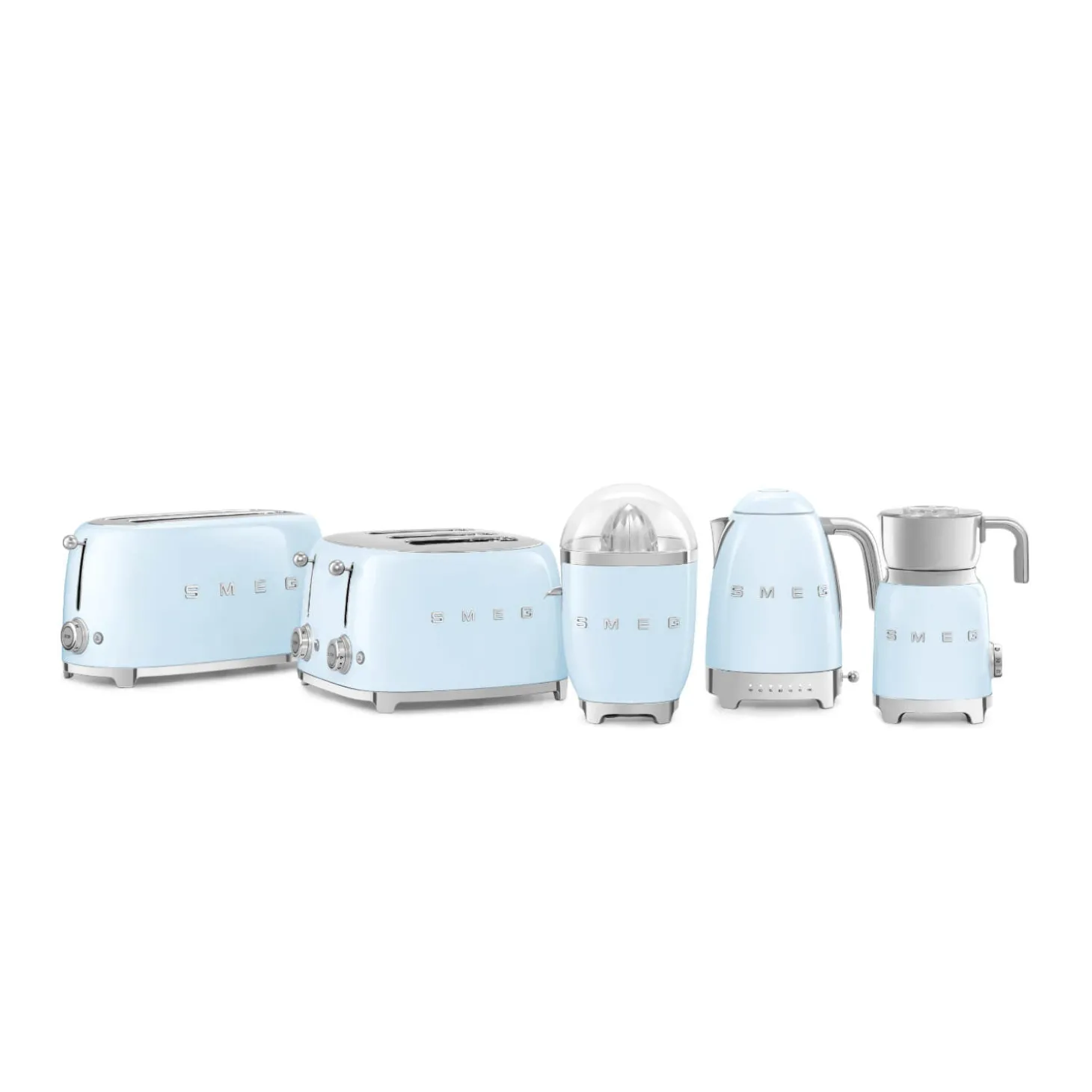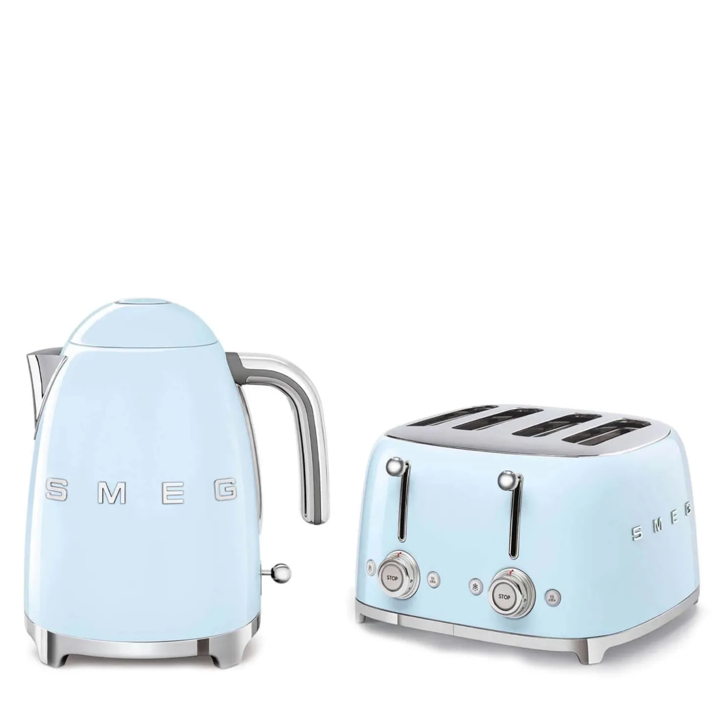 Each item in the Smeg Pastel Blue 1.7-litre kettle and 4 slice toaster set features a retro 50’s style exterior with a stylish on-trend Blue gloss finish with silver accents and a unique raised 3D logo. This set includes a two-year guarantee and is also available individually.