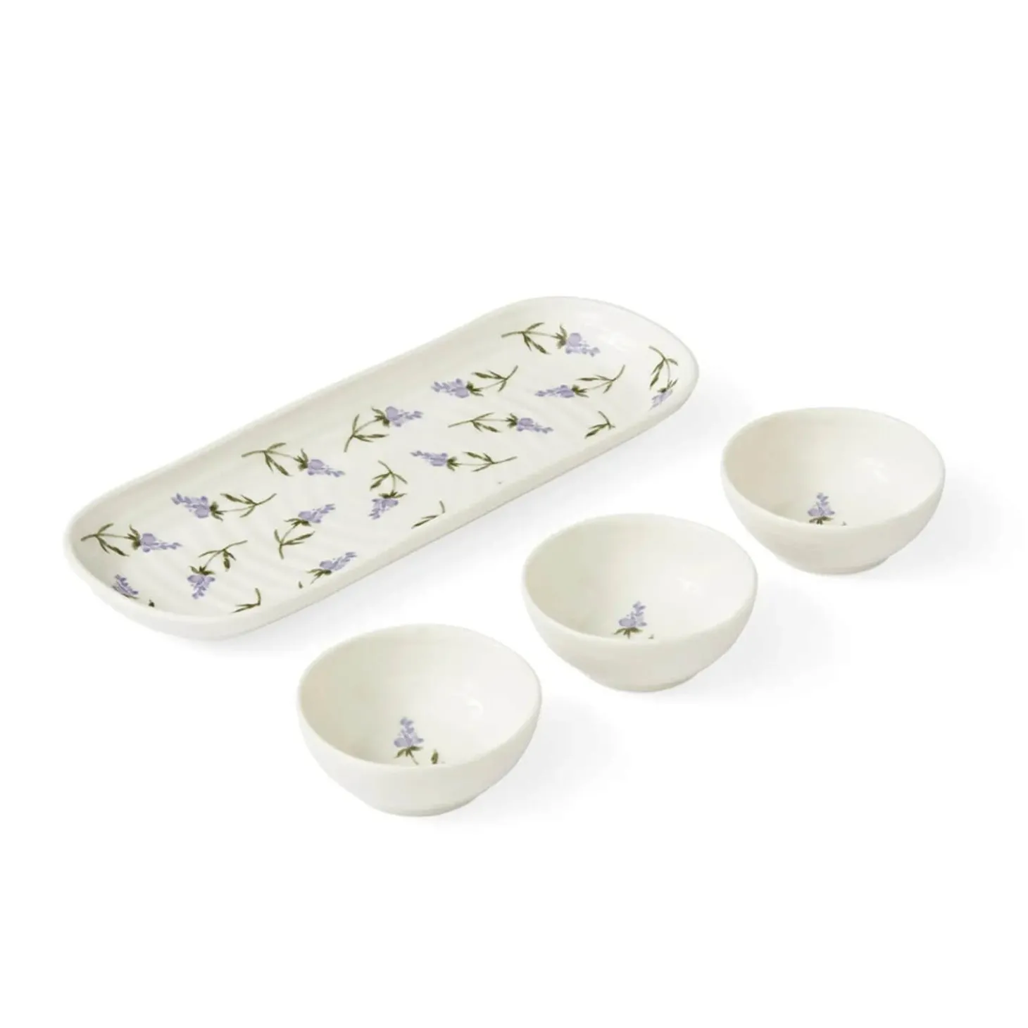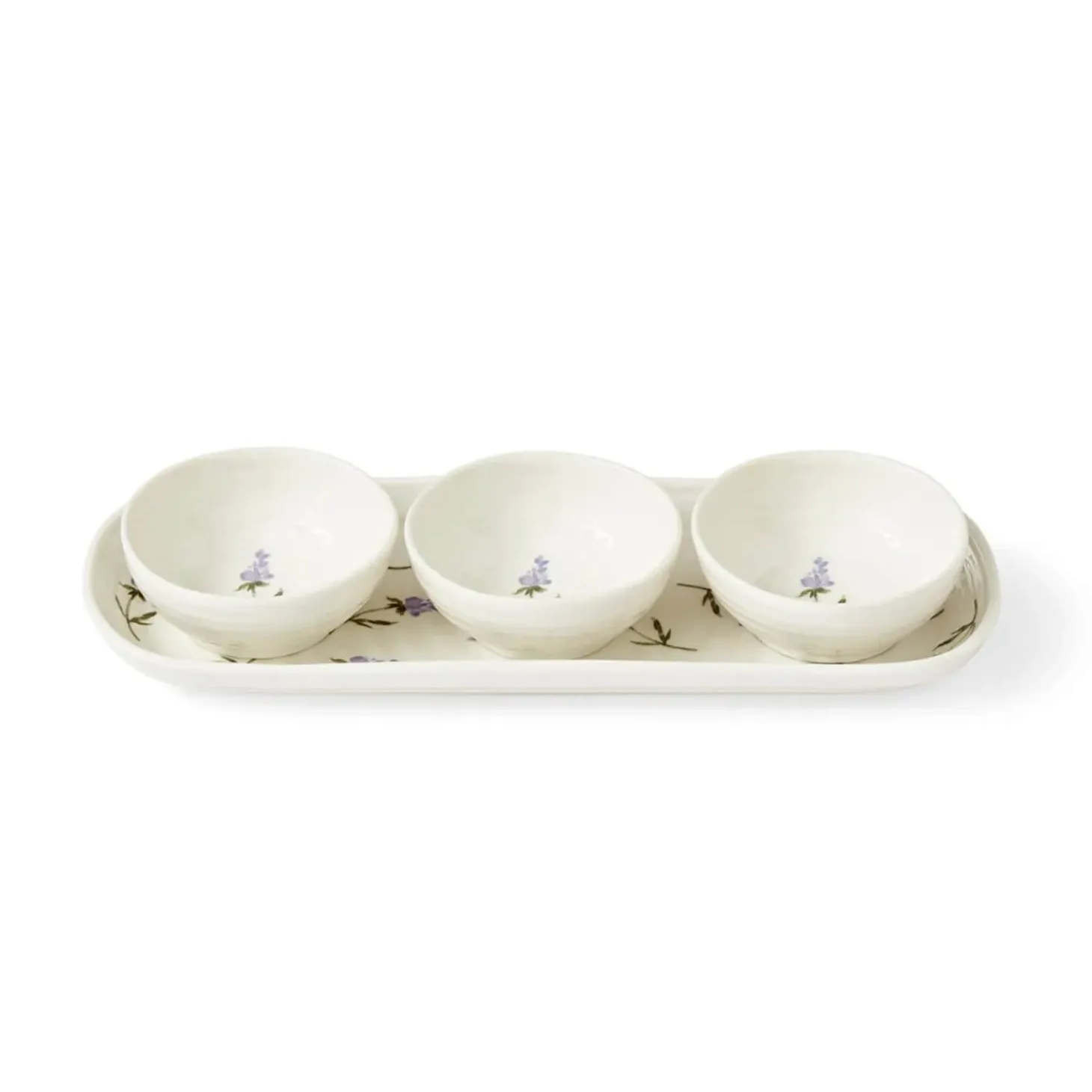 Sophie Conran presents the 3 Dip Bowls & Tray Set, produced by Portmeirion as part of her porcelain ‘Lavandula’ collection. This stunning design showcases the intricate beauty of delicate lavender flowers and foliage. Its charming elegance, featuring the unique Sophie Conran ripple effect, is sure to captivate your senses and create a tranquil atmosphere for fine dining. This beautiful set would make a wonderful gift or a treat for yourself.