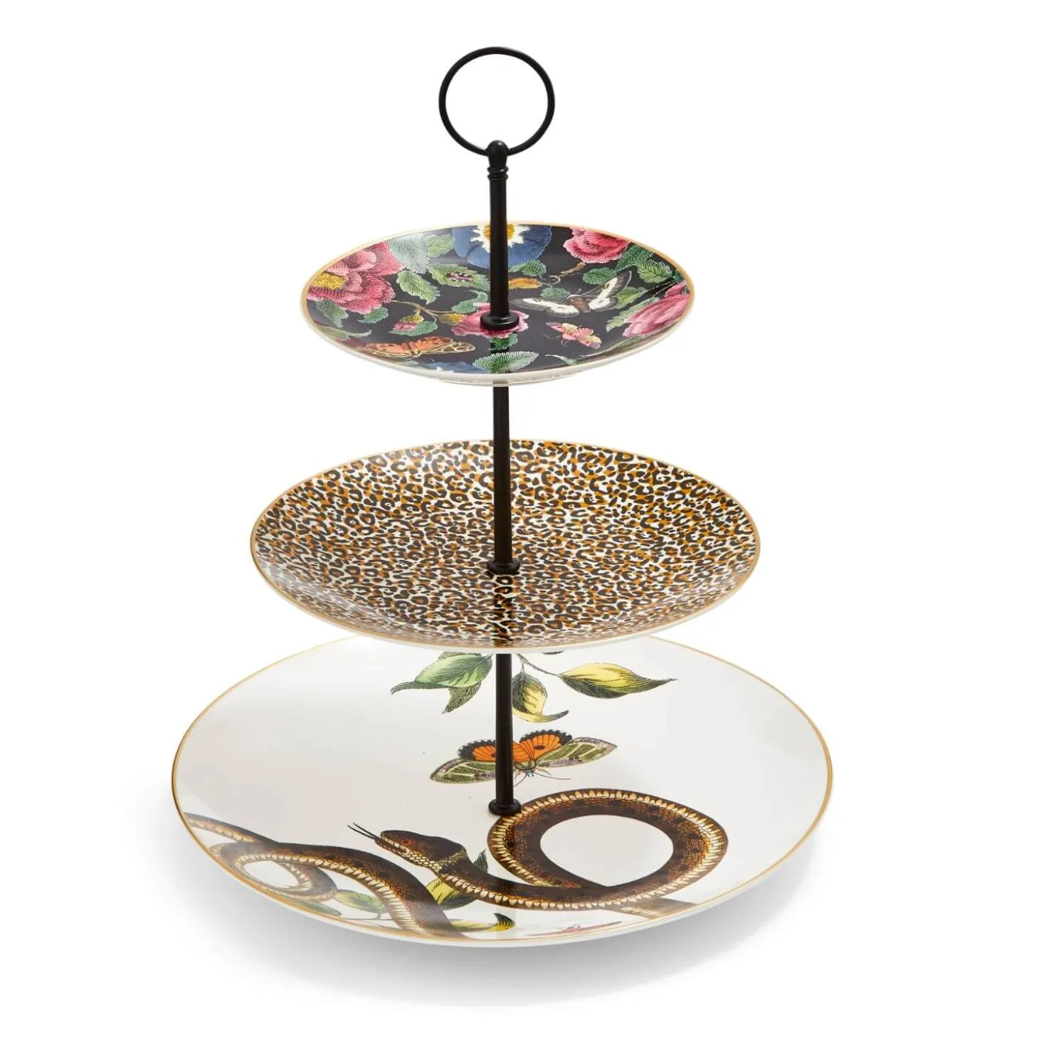 Designed by Spode and produced by Portmeirion is this beautiful 3 Tier Cake Stand being part of Spodes Creatures of Curiosity range. The bottom plate has the snake design, the middle plate has the leopard print and the top plate has the beautiful dark floral design. This striking cake stand will certainly make a statement on your table for an afternoon tea. There are other beautiful complementing products available in the Creatures of Curiosity range. This boldly decorated Spode 3 Tier Cake Stand would make a wonderful gift or a treat for yourself.