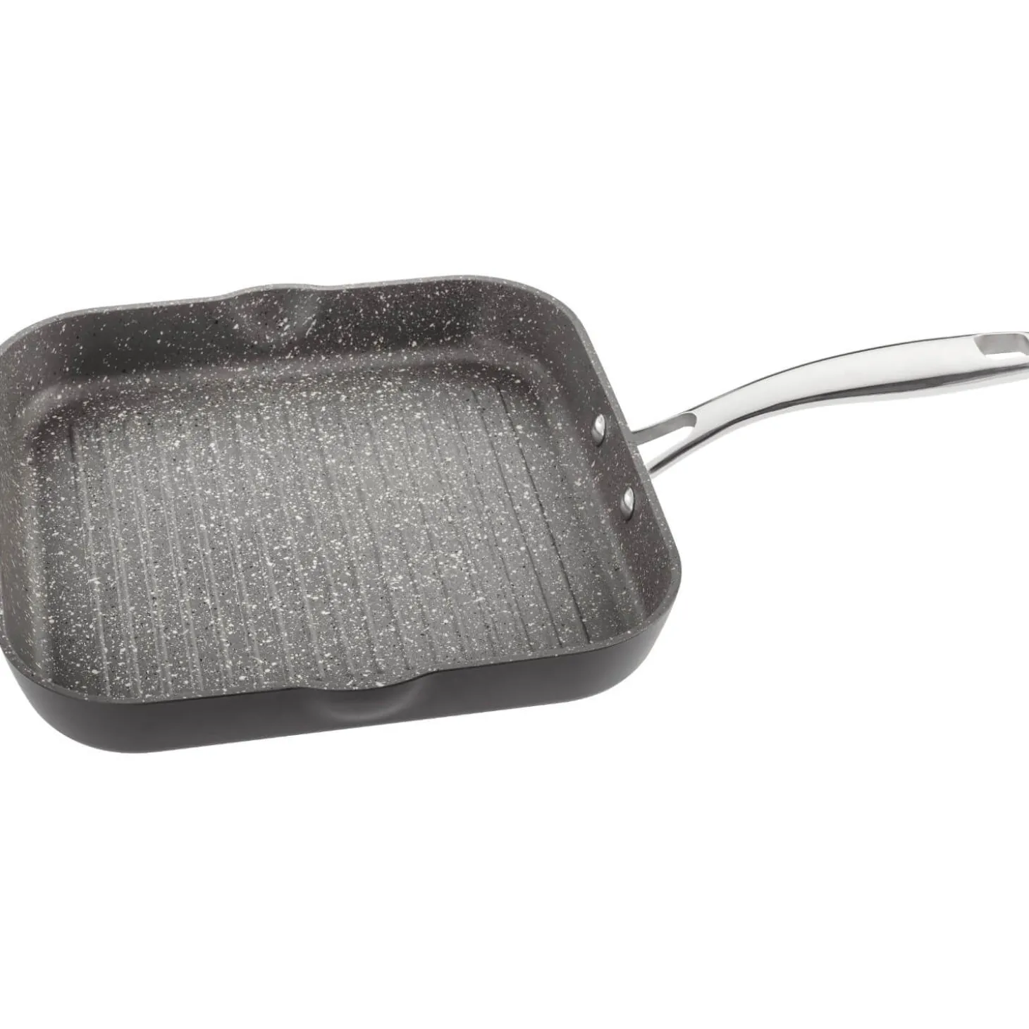 This 26cm diameter non-stick square grill pan forms part of the Rocktanium cookware range by Stellar. Ideal for searing meats, grilling fish and cooking vegetables with little to no oil thanks to a PFOA free QuanTanium non-stick coating that allows for excellent release and easy cleaning. This grill has been created using durable, yet light materials and has an ergonomic handle secured by polished rivets. Suitable for induction hobs.