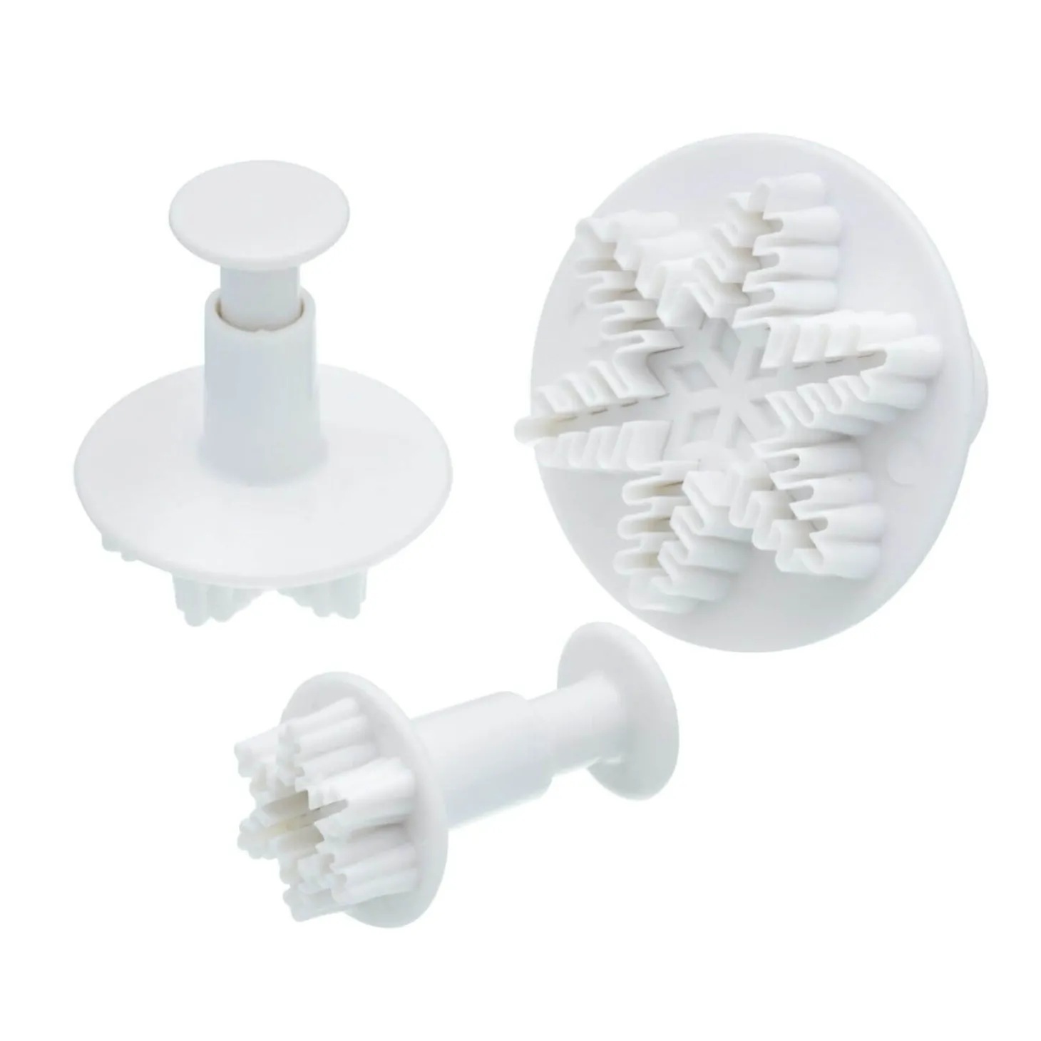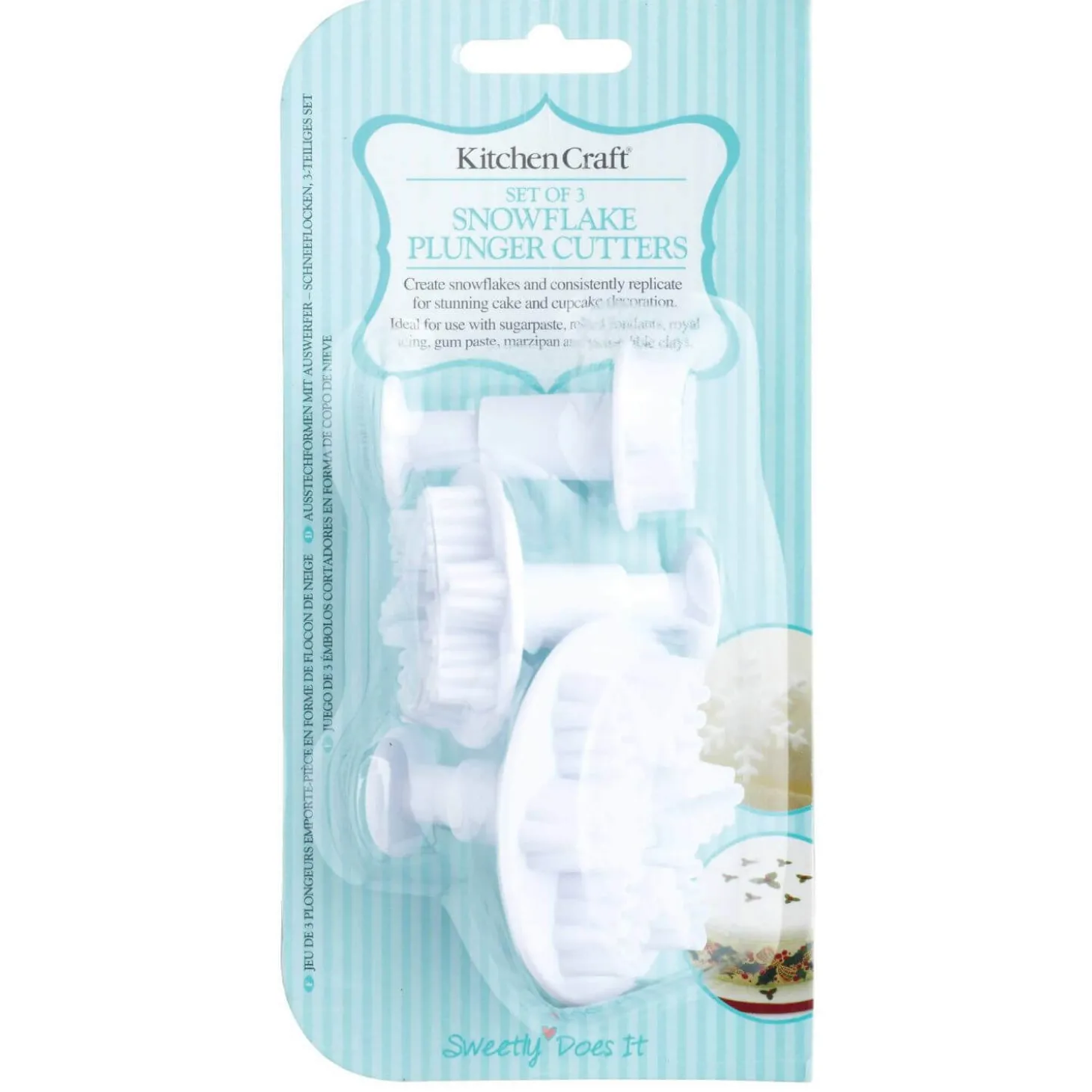This set of 3 snowflake-shaped fondant cutters from the Sweetly Does It range by KitchenCraft is perfect for any home baking needs. Featuring a plunger mechanism which embosses, cuts and releases the icing to produce consistent delicate snowflakes. This set is ideal for use with a large variety of icing including sugar paste, rolled fondant and marzipan.