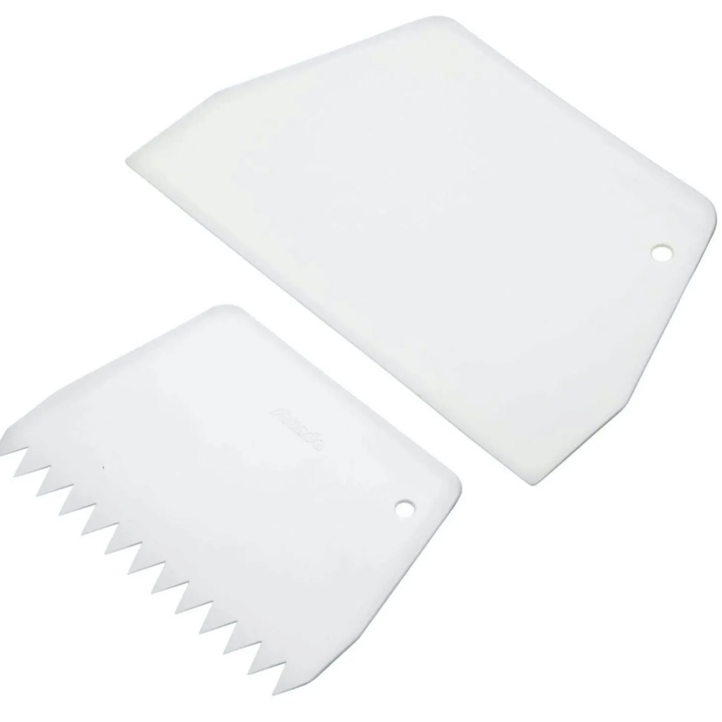 This set of 2 icing scrapers form part of the Sweetly Does It range from KitchenCraft. This pack includes a straight edge scraper for a smooth finish and also a serrated edge tool to produce textured results. A perfect tool for use with buttercream and royal icing.