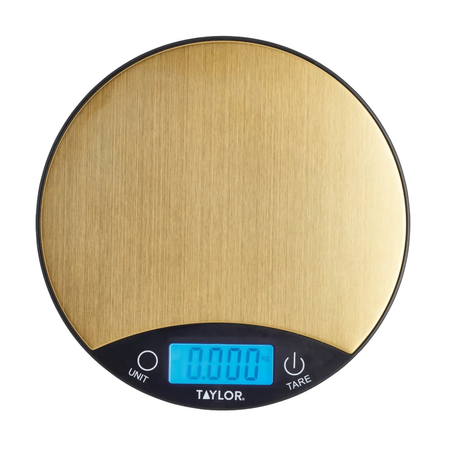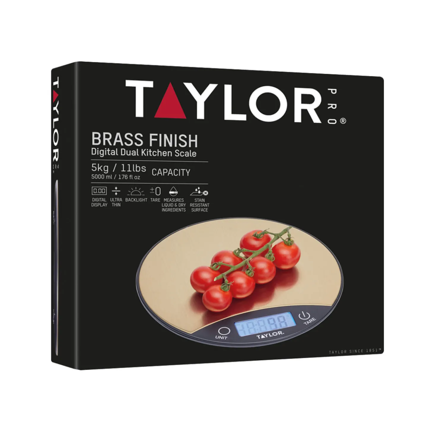 Perfect for everyday tasks this on-trend 5kg dual digital kitchen scale in copper and black from Taylor Pro is simple but functional, fitted with two long-lasting CR2032 batteries. The surface has a brushed finish whilst the circular shape can easily accommodate bowls, cups and jugs perfect when measuring dry and liquid ingredients.