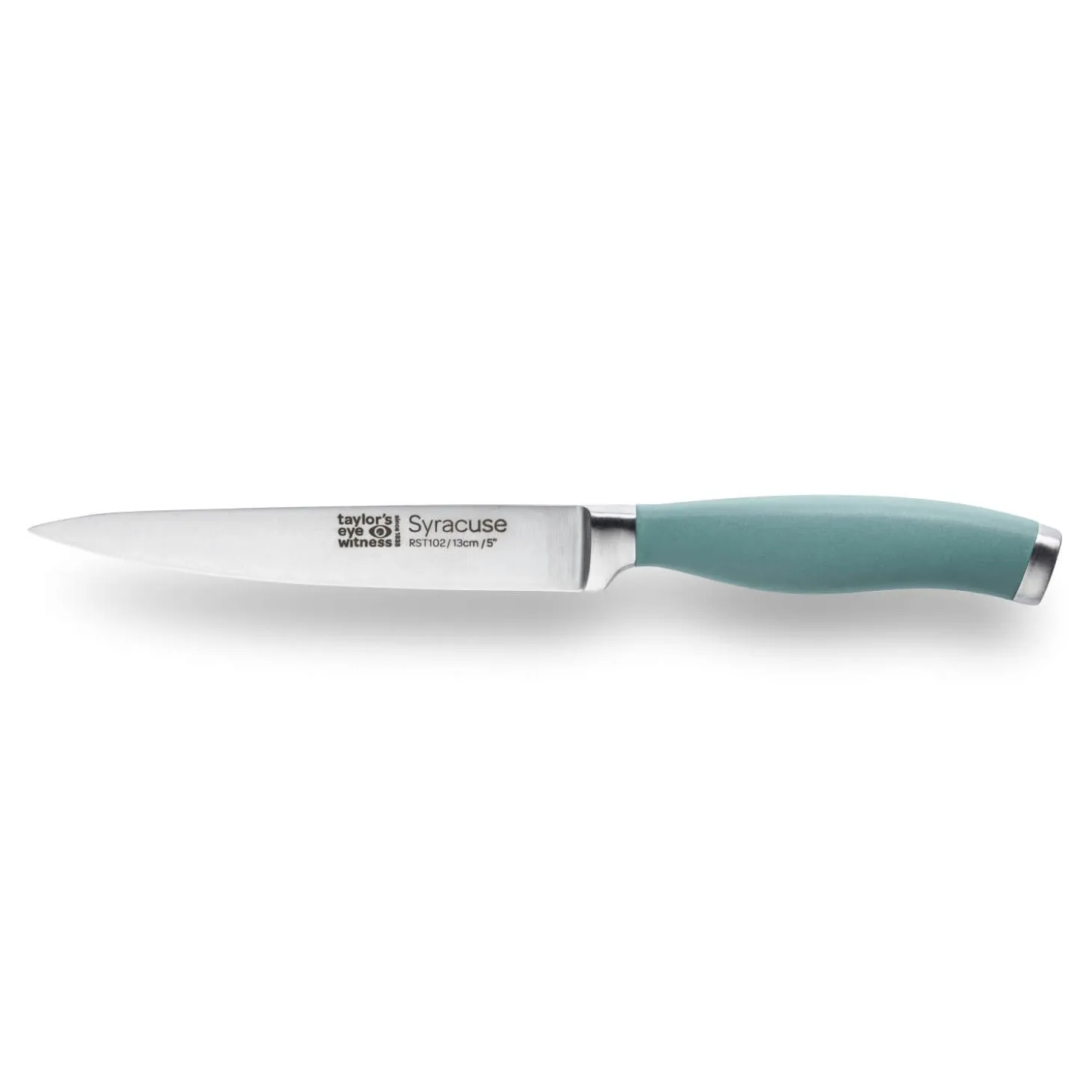 Taylor’s Eye Witness presents the 13cm all-purpose knife in Aqua Blue as part of their Syracuse range. Each item in the collection has been created using finely ground stainless steel that is sharp and long-lasting ensuring effortless performance. The handles on the kitchen knives feature an ergonomic shape with a soft-grip finish for better grip and control. Includes a 25-year manufacturer guarantee.