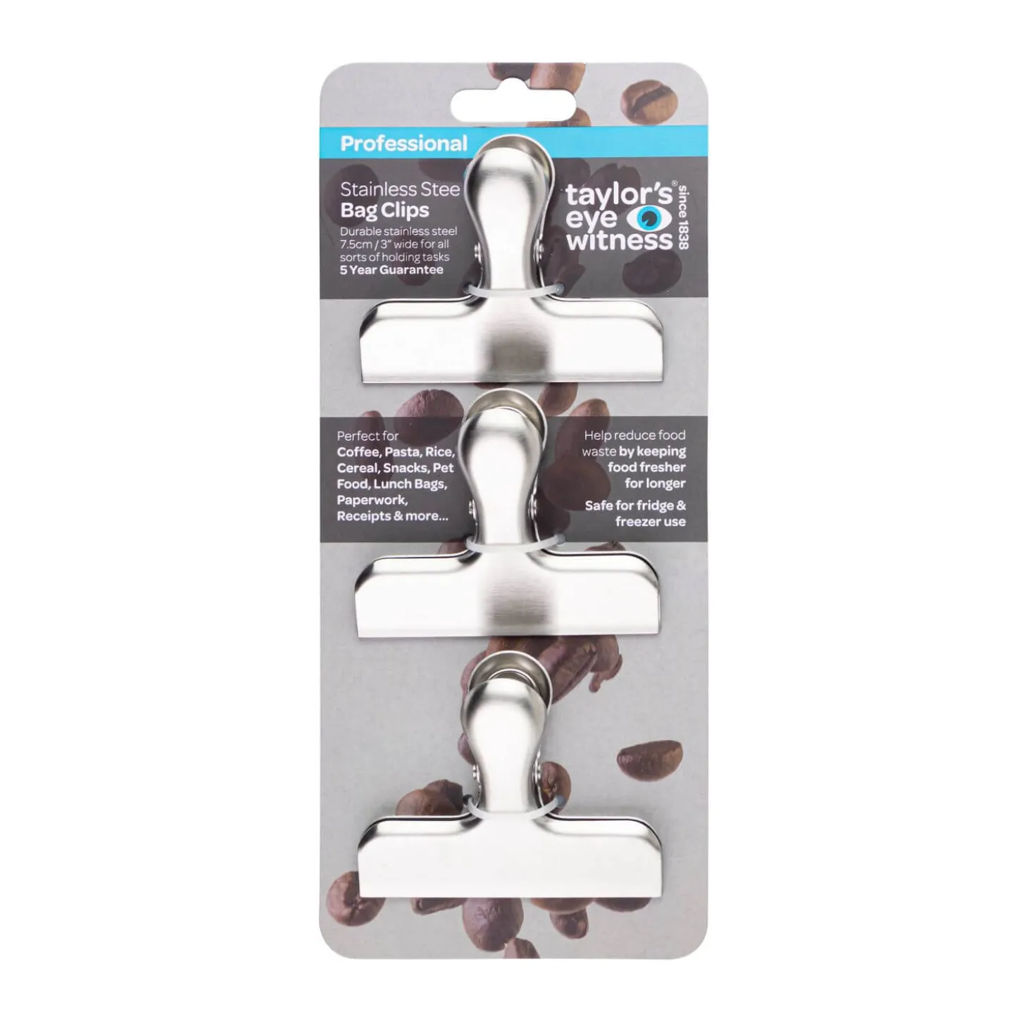 Taylor’s Eye Witness presents their 3 Piece Medium Bag Clip Set in Silver. Made from durable stainless steel, these clips are ideal for many holding tasks, whether it be for keeping bags of rice, pasta or other types of foodstuff contained they could also be used to keep paperwork together and much more.