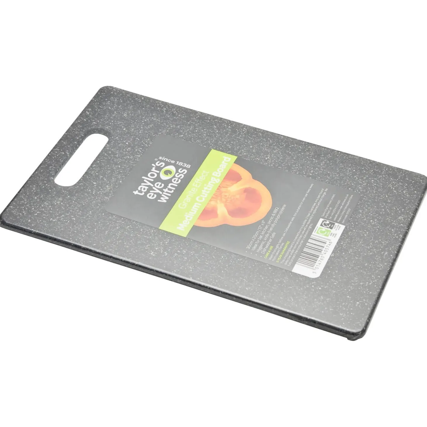 Protect worktops and knives when preparing meat, vegetables and poultry with the medium rectangular chopping board from Taylor’s Eye Witness. Created using durable polypropylene with a Black granite finish. Other colours and sizes are also available.