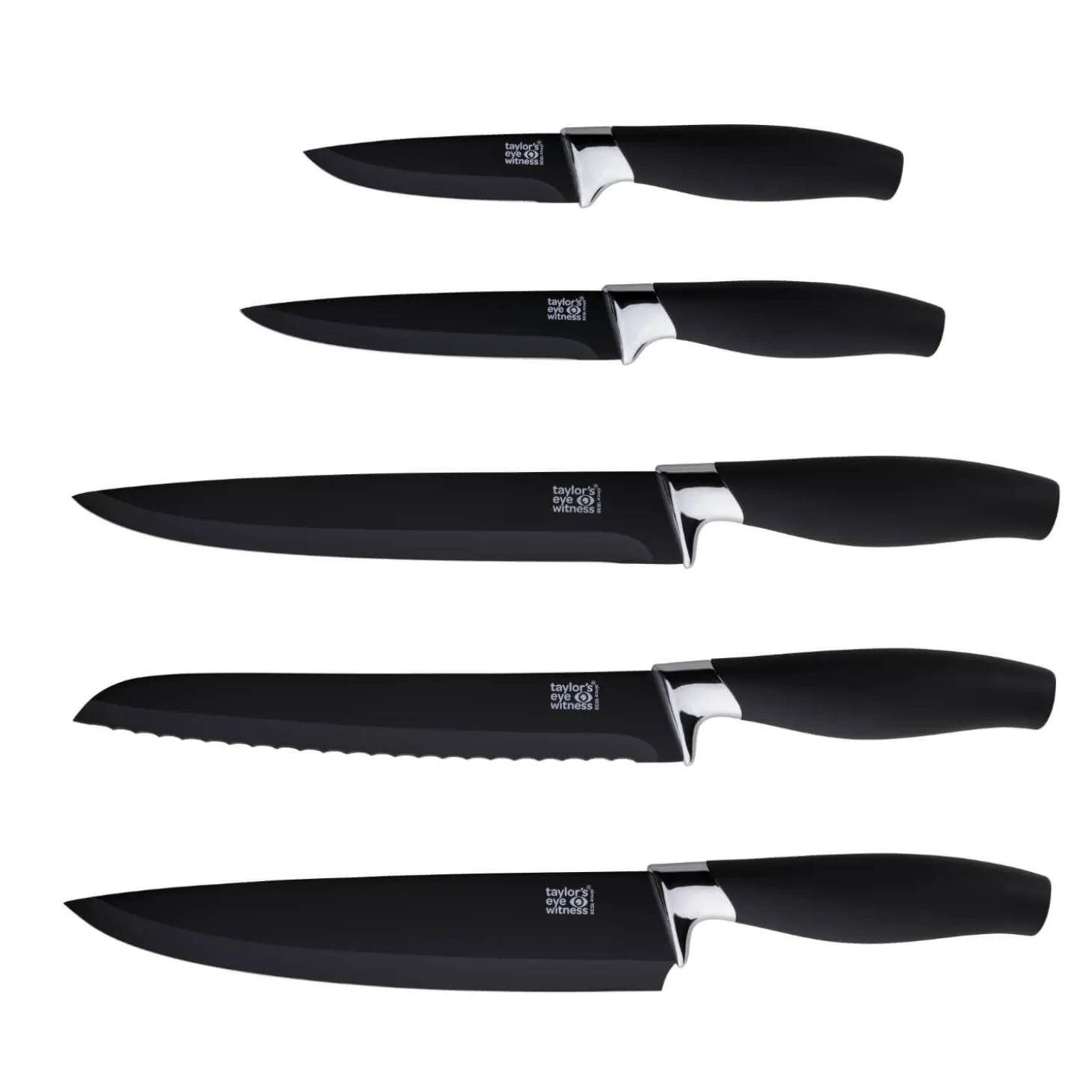 Taylor’s Eye Witness presents the Brooklyn range which features this 5 Piece Revolving Knife Block Set. The revolving base makes it easier to reach your desired knife and with blades forged from hollow ground steel, you can expect exceptional cutting performance. The Knife set includes 5 individual knives that each serve their own purpose and have been crafted with the utmost care. Each knife has a special anti-bacterial coating and an ergonomic rubber handle for optimum comfort and control.