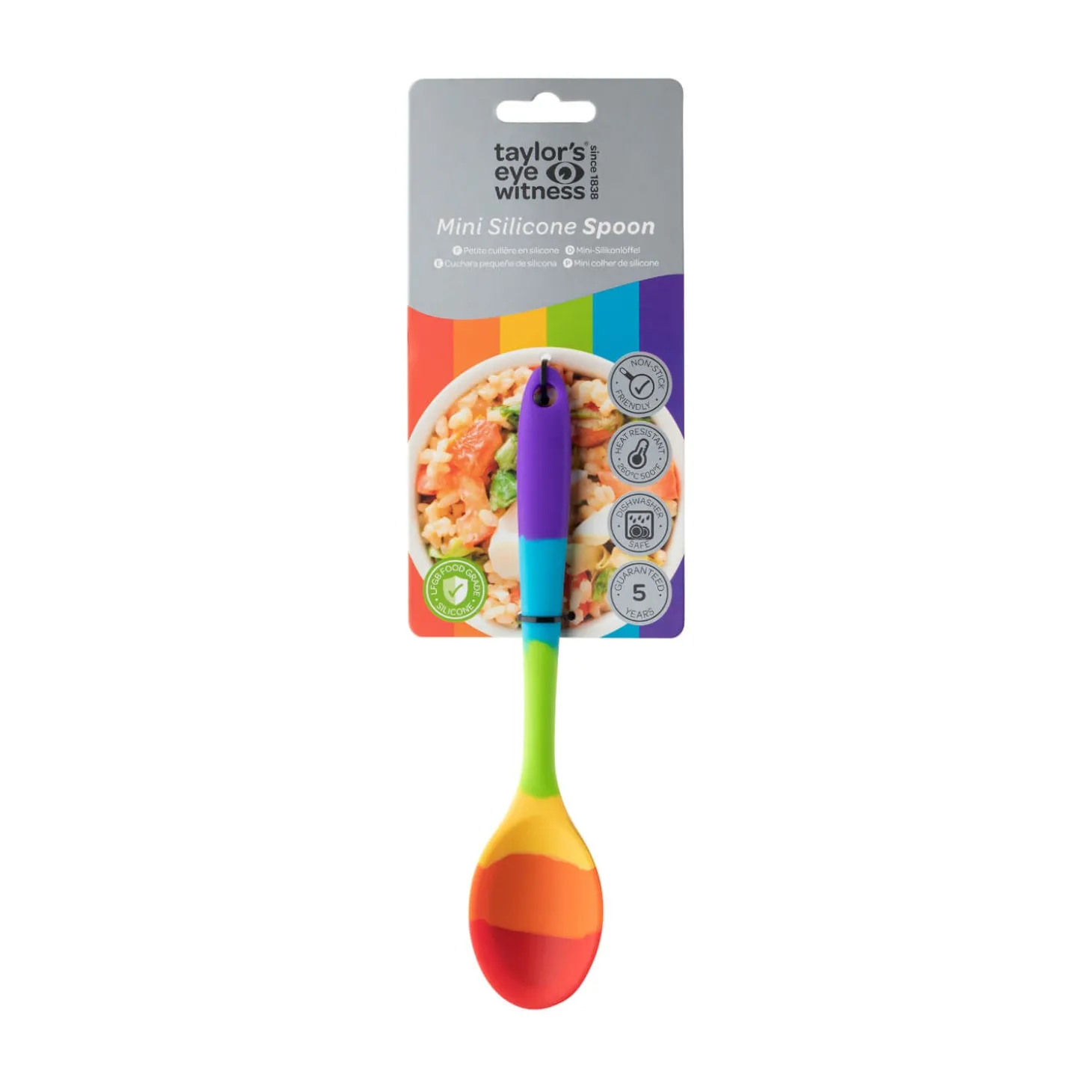 Taylor’s Eye Witness presents the mini silicone spoon which forms part of the Rainbow range. Ideal for use for stirring sauces and to scoop out contents from jars and tins. This ladle has an ergonomic soft-touch handle and silicone head which is scratch resistant on all cookware. The steel core is durable whilst this tool is heat, odour and stain resistant which ensures the bright rainbow colours will always stay bright!Â