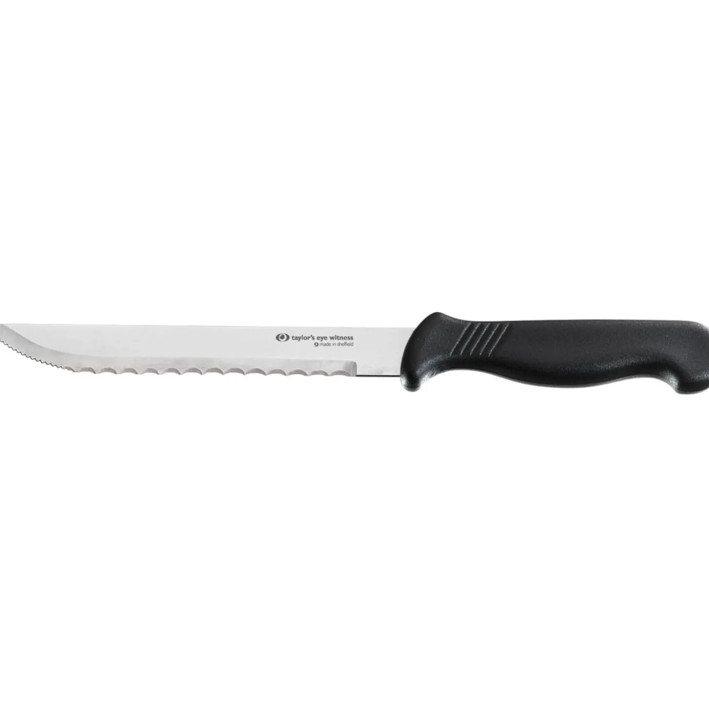 This 16cm scalloped all purpose knife forms part of the Sheffield Choice range by Taylor’s Eye Witness. Each item in the collection has been created by skilled craftsmen in Sheffield using precision ground stainless steel that has an ultra-fine edge that ensures sharp and long-lasting performance. The handles on the kitchen knives are directly moulded onto the blade and have an ergonomic ribbed design for superior grip and control. Includes a lifetime guarantee.