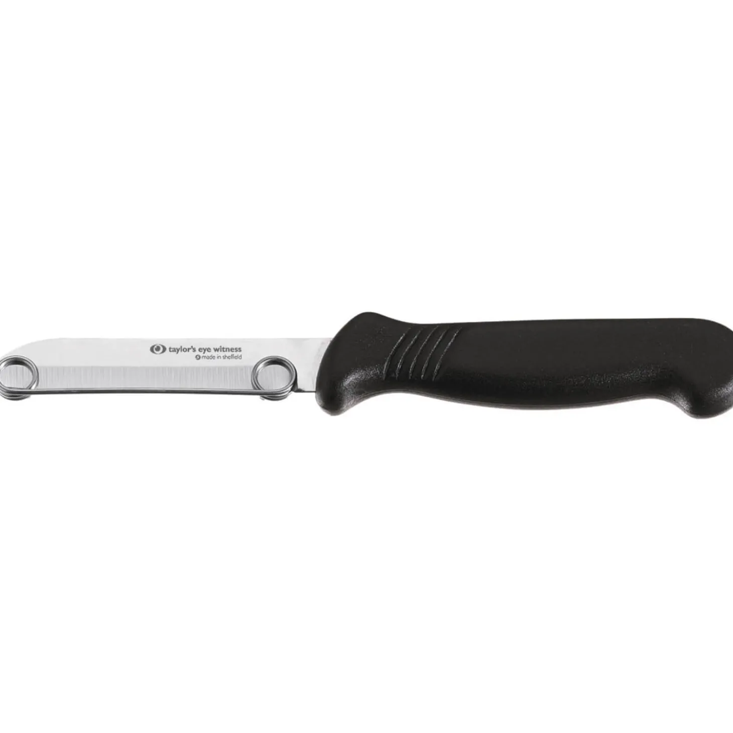 This 8cm Peeling knife forms part of the Sheffield Choice range by Taylor’s Eye Witness. Each item in the collection has been created by skilled craftsmen in Sheffield using precision ground stainless steel that has an ultra-fine edge that ensures sharp and long-lasting performance. The handles on the kitchen knives are directly moulded onto the blade and have an ergonomic ribbed design for superior grip and control. Includes a lifetime guarantee.