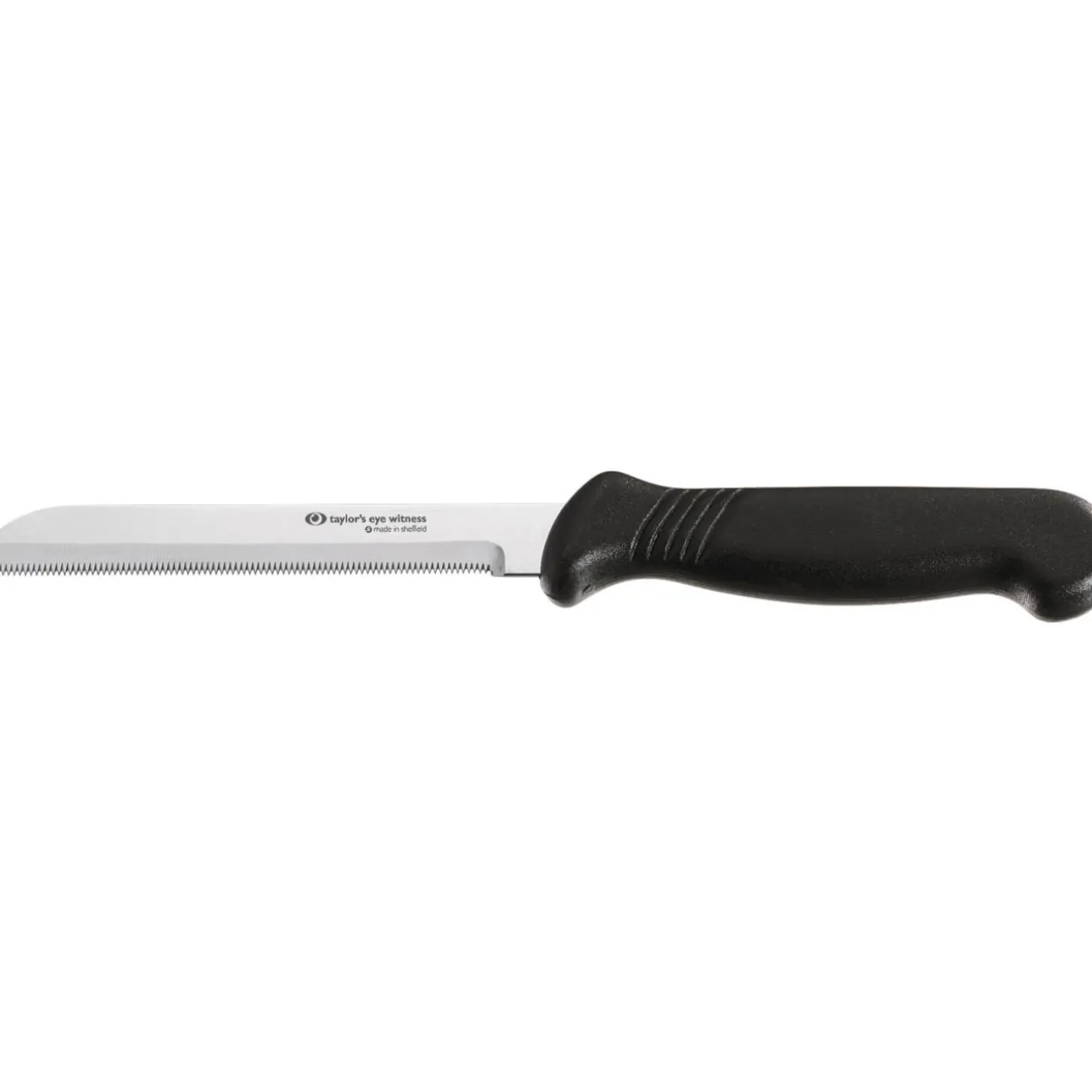 This 10cm Multi-Purpose knife forms part of the Sheffield Choice range by Taylor’s Eye Witness. Each item in the collection has been created by skilled craftsmen in Sheffield using precision ground stainless steel that has an ultra-fine edge that ensures sharp and long-lasting performance. The handles on the kitchen knives are directly moulded onto the blade and have an ergonomic ribbed design for superior grip and control. Includes a lifetime guarantee.