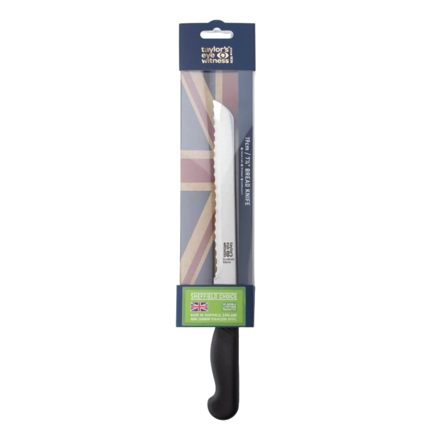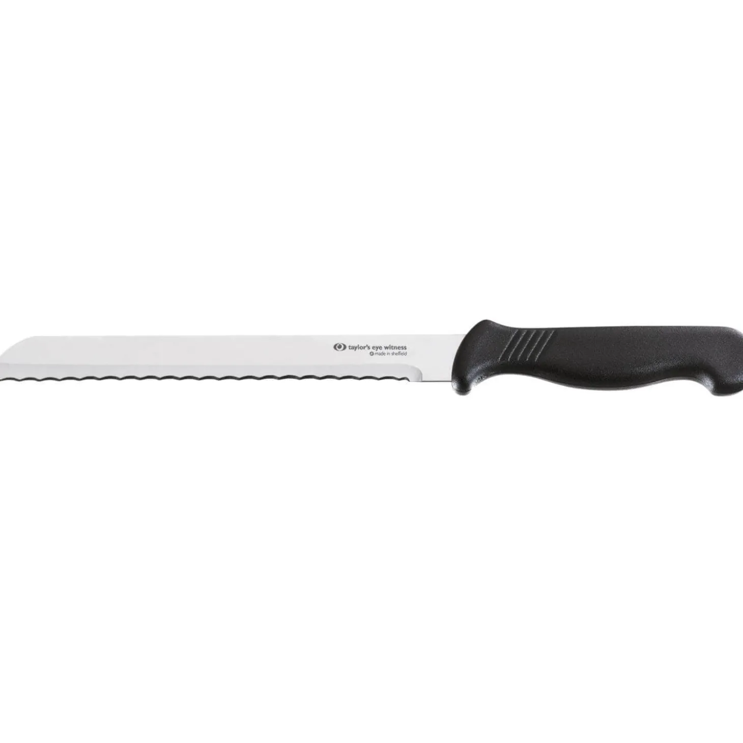 Taylor’s Eye Witness presents the 19cm Bread Knife as part of their Sheffield Choice range. These Sheffield knives are crafted by skilled craftsmen to the highest quality standards. The blades are hollow-ground with razor steel for optimal performance. The handle is moulded onto the blade for a tactile feel, featuring a ribbed area for a secure grip.