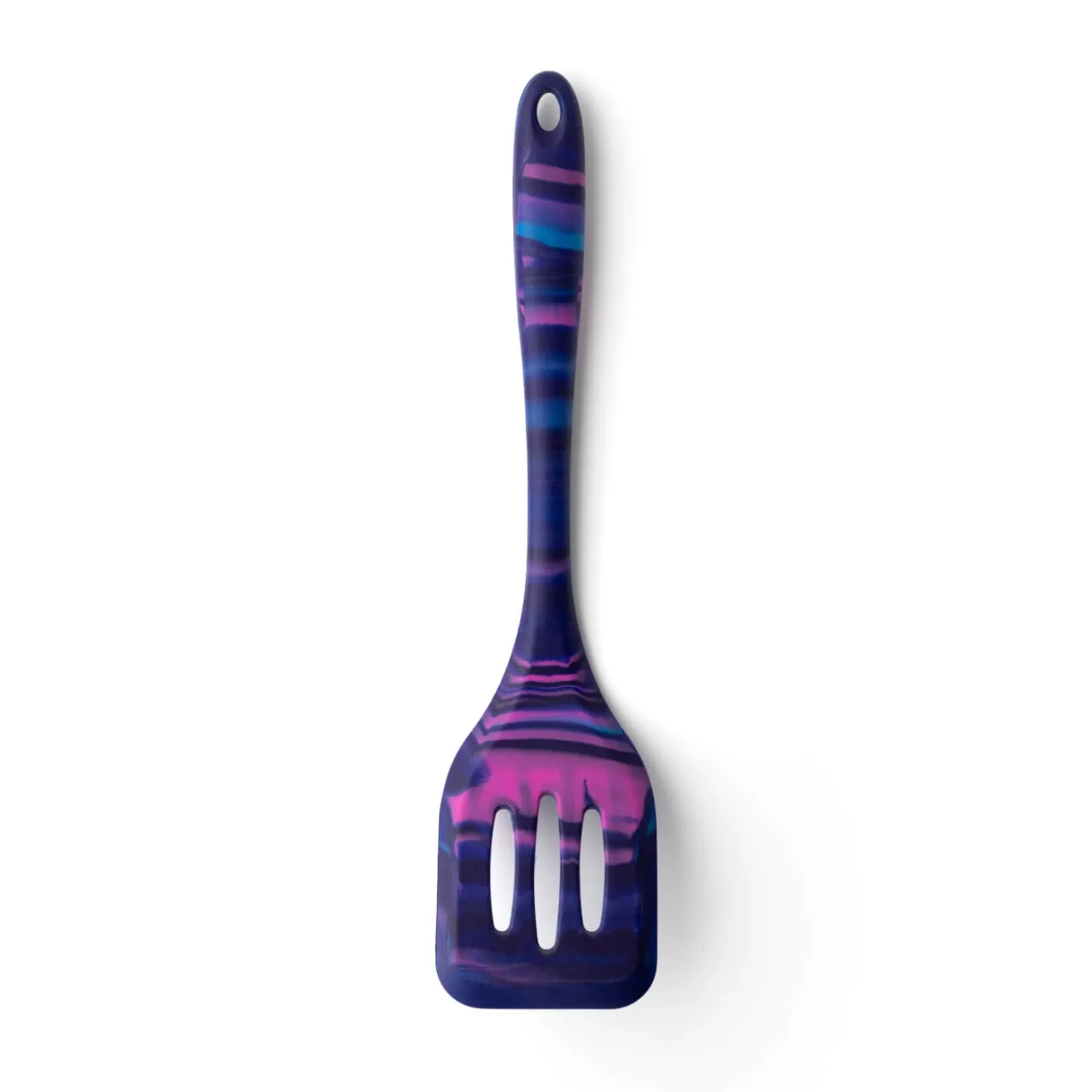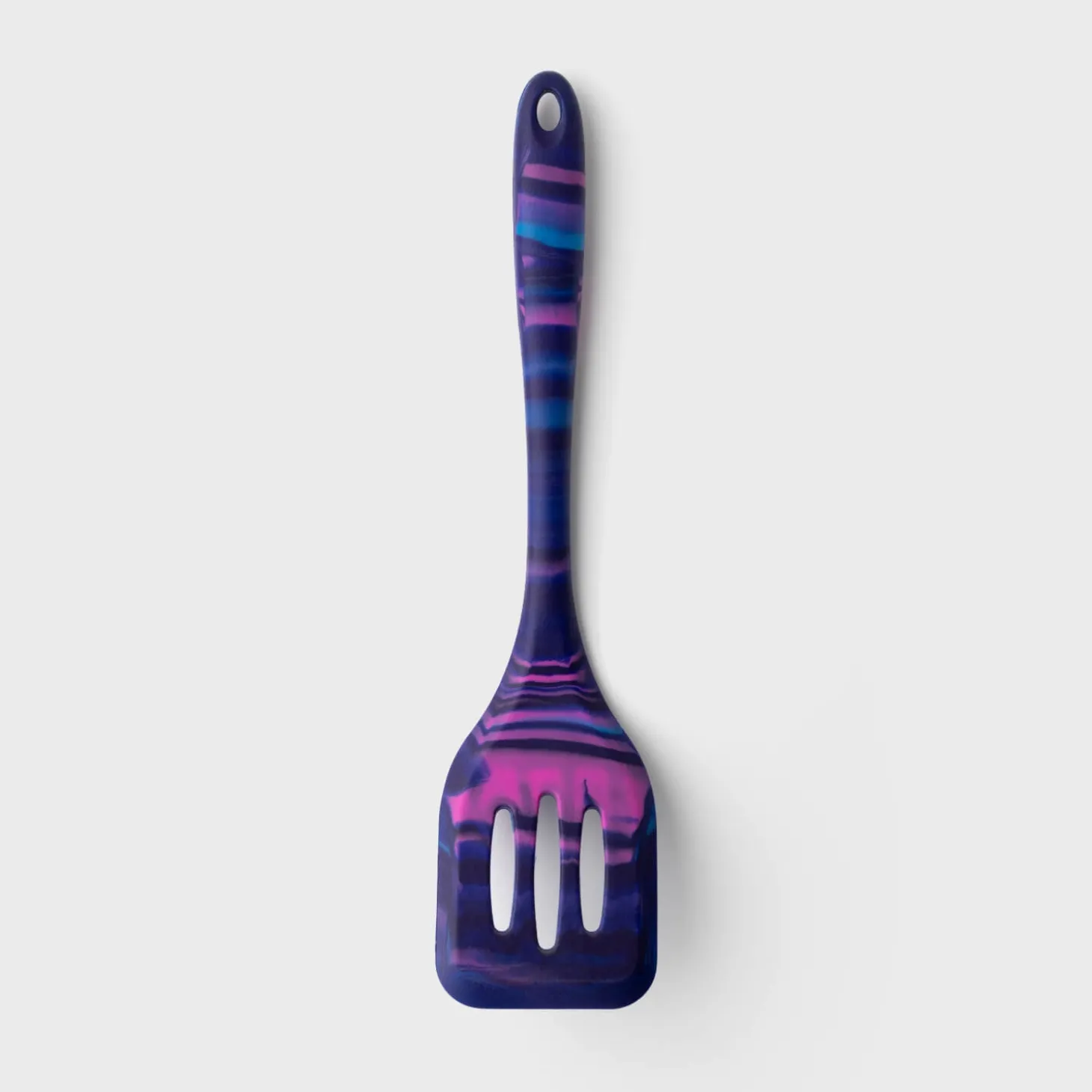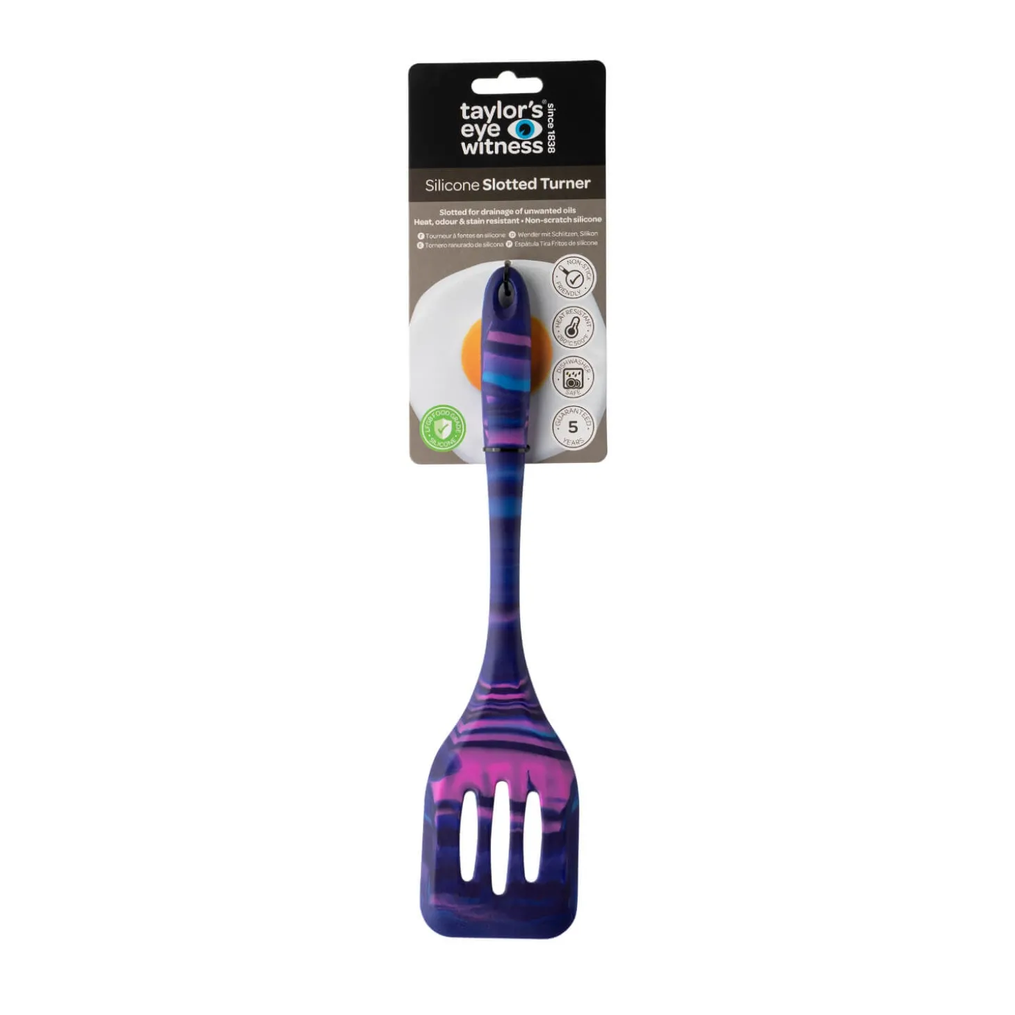 Taylor’s Eye Witness presents the Silicone Slotted Turner which forms part of their Nebula range. Ideal for flipping fish cakes, omelettes, pancakes and much more, and is a great tool for an enthusiastic cook in the kitchen. The steel core is durable, whilst this tool is heat, odour and stain resistant, ensuring the bright colours will always stay bright! All pieces in this range are created with a marbling effect making them all different and delightfully individual.