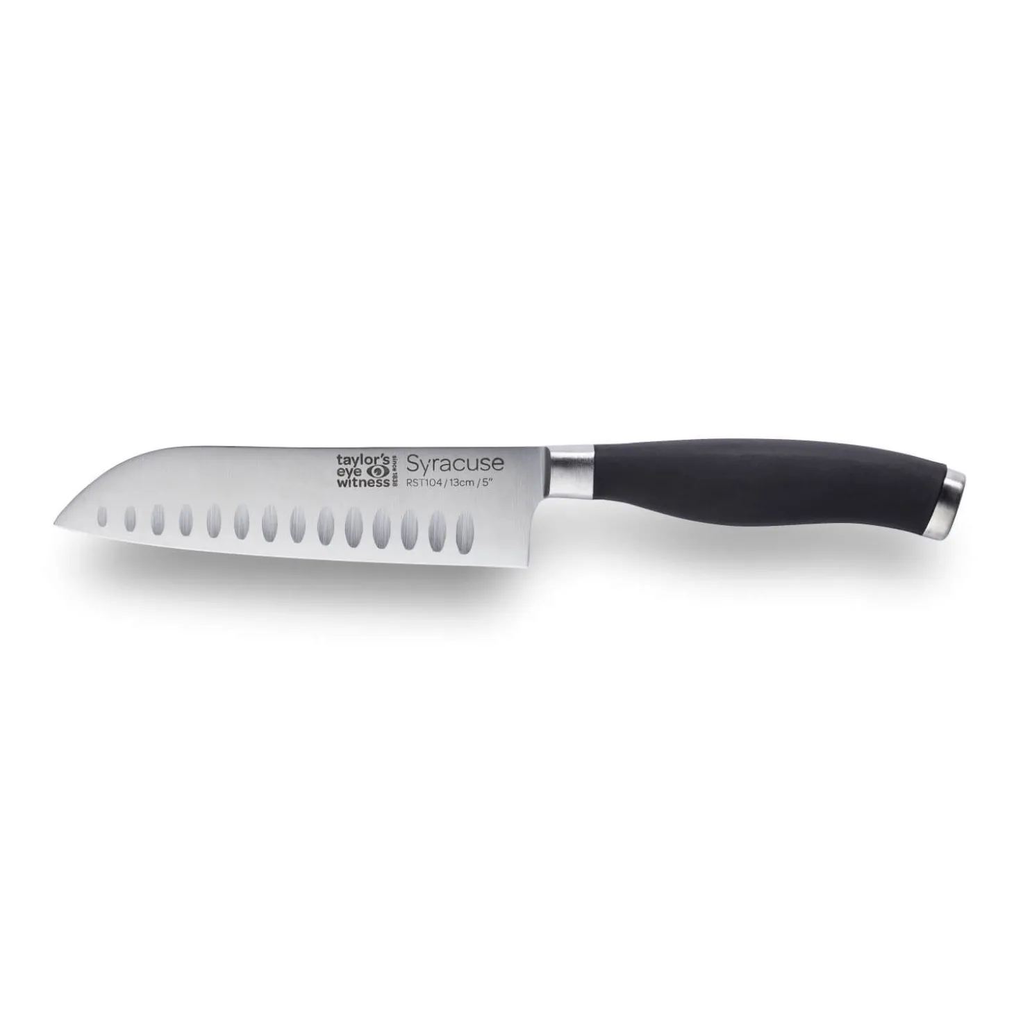 This 13cm SantokuĀ knife in blackĀ forms part of the Syracuse range by Taylor’s Eye Witness. Each item in the collection has been created using finely ground stainless steel that is sharp and long-lasting ensuring effortless performance. The handles on the kitchen knives feature an ergonomic shape with a soft-grip finish for better grip and control. Includes aĀ 25-year manufacturer guarantee.