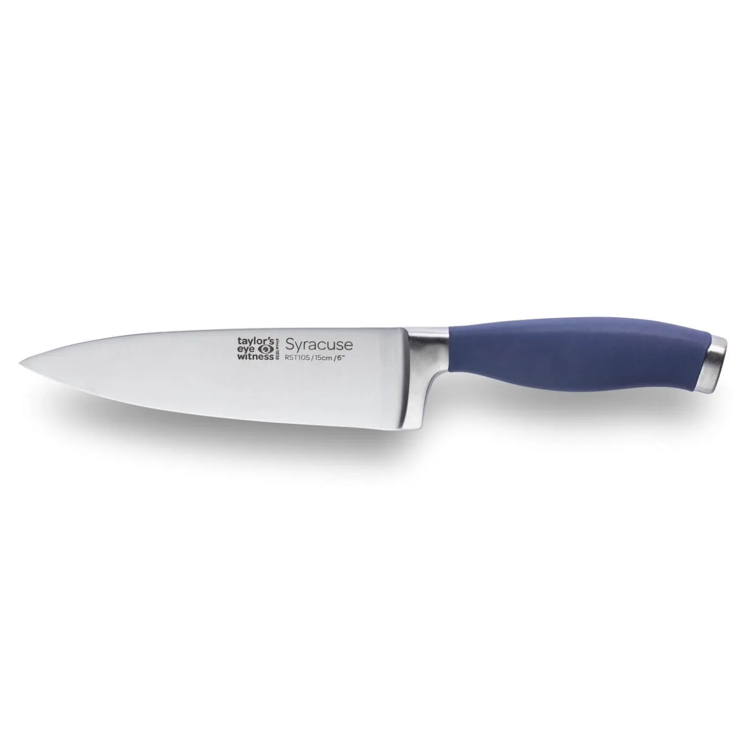 This 15cm Chef’s knifeĀ in denim (blue) forms part of the Syracuse range by Taylor’s Eye Witness. Each item in the collection has been created using finely ground stainless steel that is sharp and long-lasting ensuring effortless performance. The handles on the kitchen knives feature an ergonomic shape with a soft-grip finish for better grip and control. Includes aĀ 25-year manufacturer guarantee.