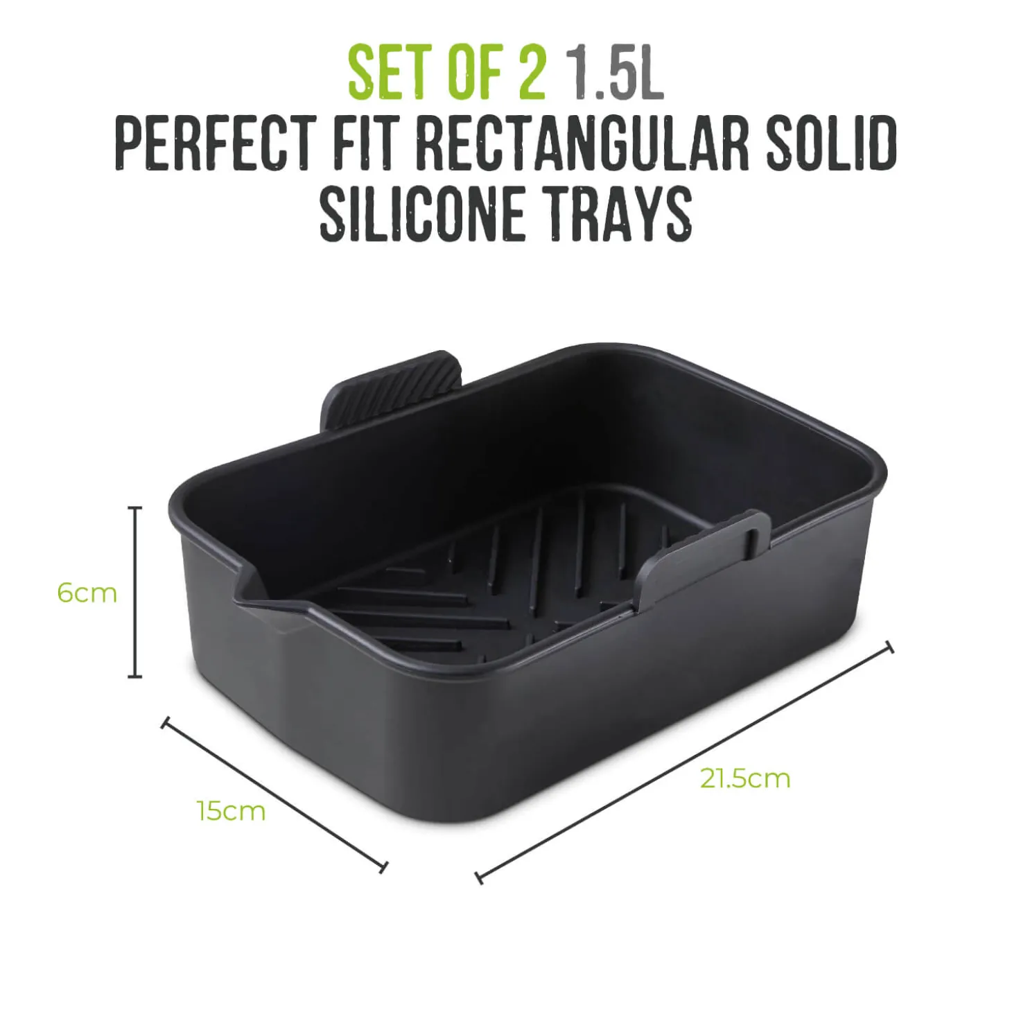 Tower presents the Pack of 2 Rectangular Solid Air Fryer Trays, made from durable, food-safe silicone. These trays are designed to fit most air fryers and offer a convenient, mess-free way to cook a variety of foods, such as chicken legs, pizzas, cakes, and more. They are reusable, making them an eco-friendly alternative to using parchment paper to line air fryer baskets.