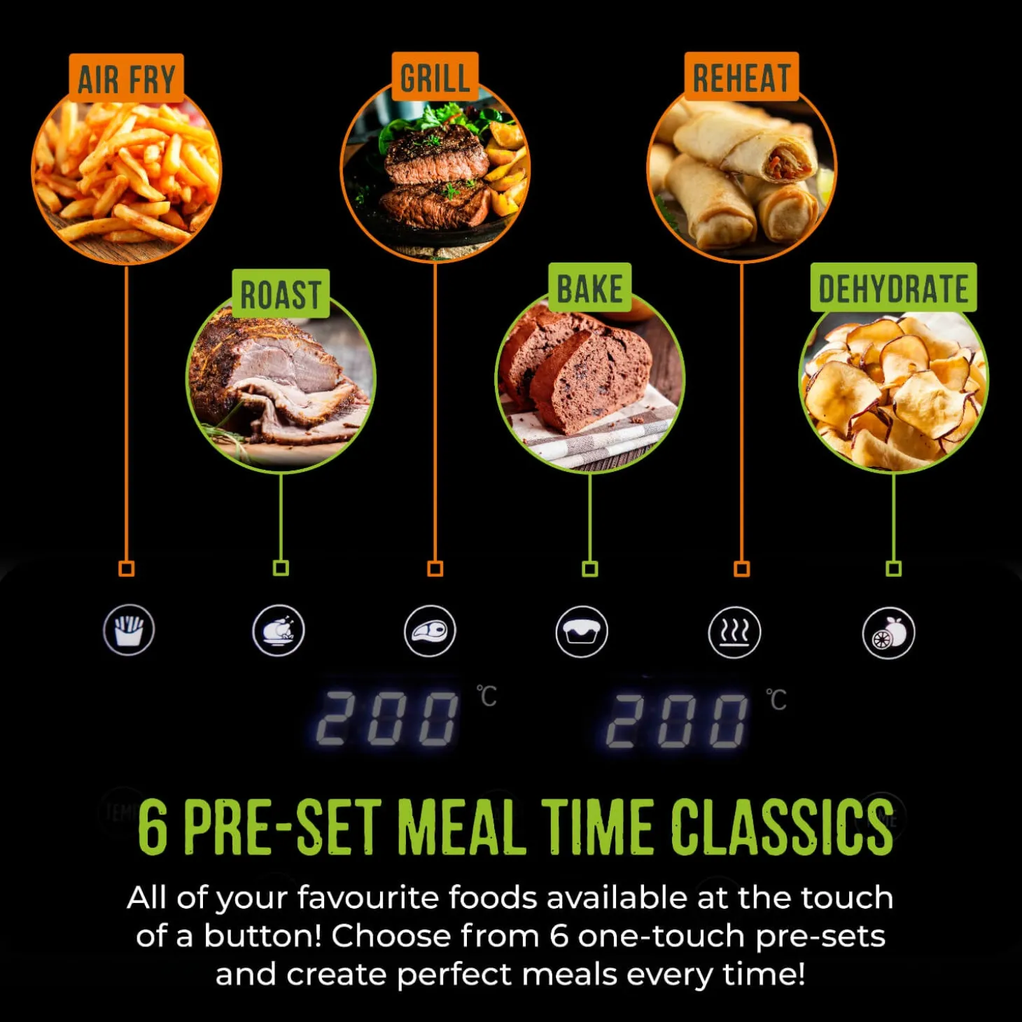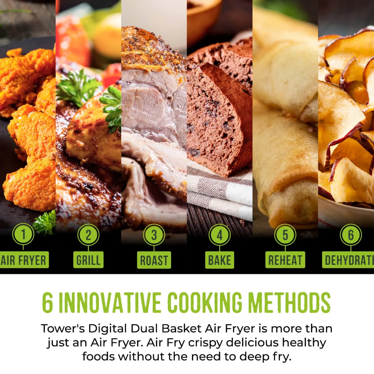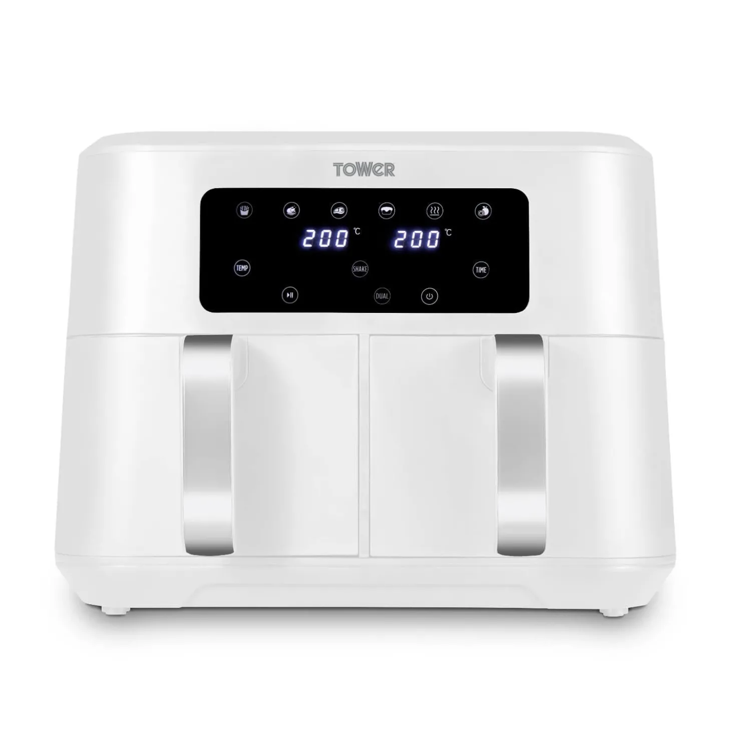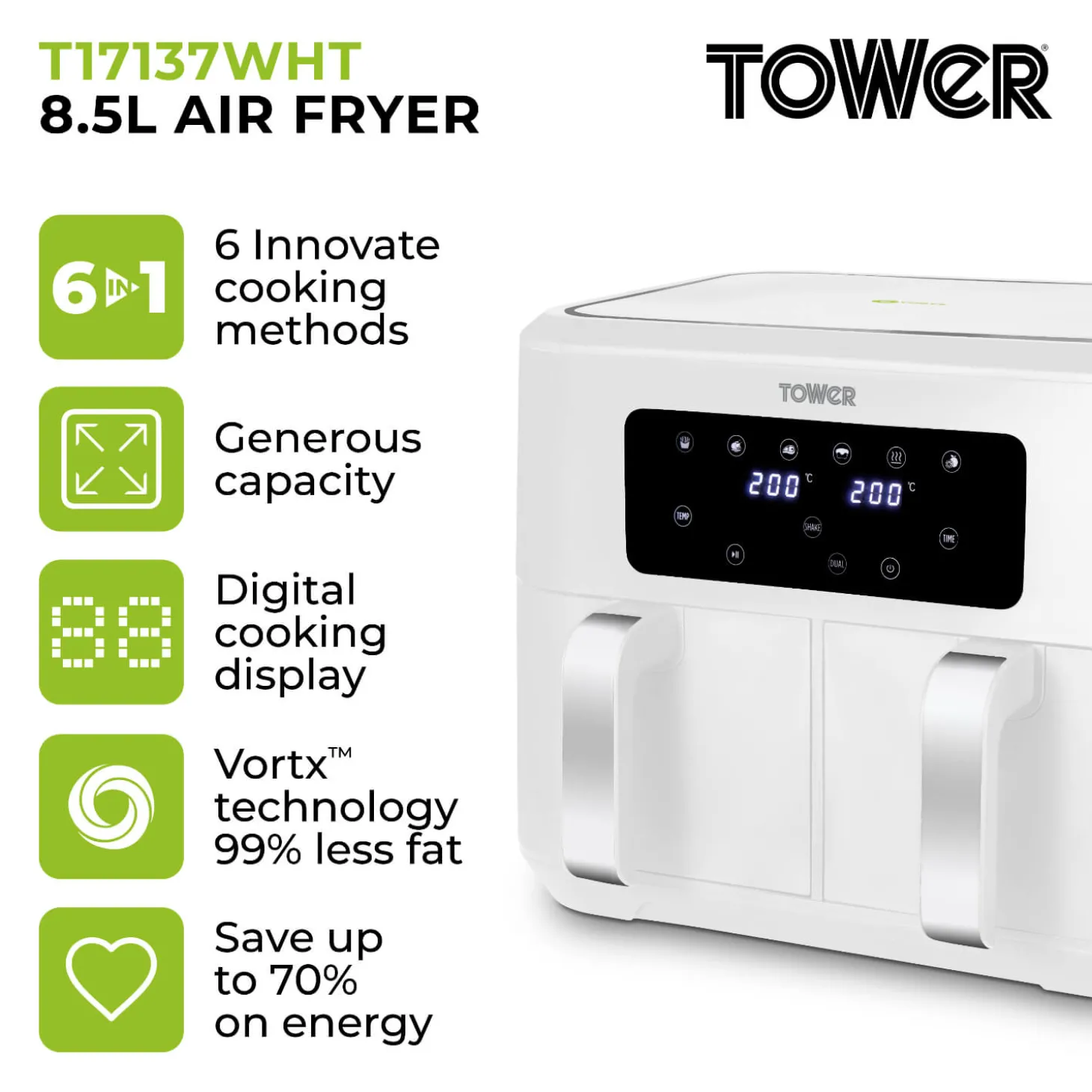 Prepare delicious and crispy meals and snacks with the Tower Dual Basket 8.5-litre air fryer. Utilising innovative Vortx technology, exclusive to Tower, it rapidly circulates air around the food while using 99% less oil and cooking 30% faster than traditional deep-fat fryers. The double-drawer design allows you to cook different meals for the whole family simultaneously, thanks to the convenient sync function. This air fryer is a fantastic addition to any kitchen, perfect for cooks of all skill levels!