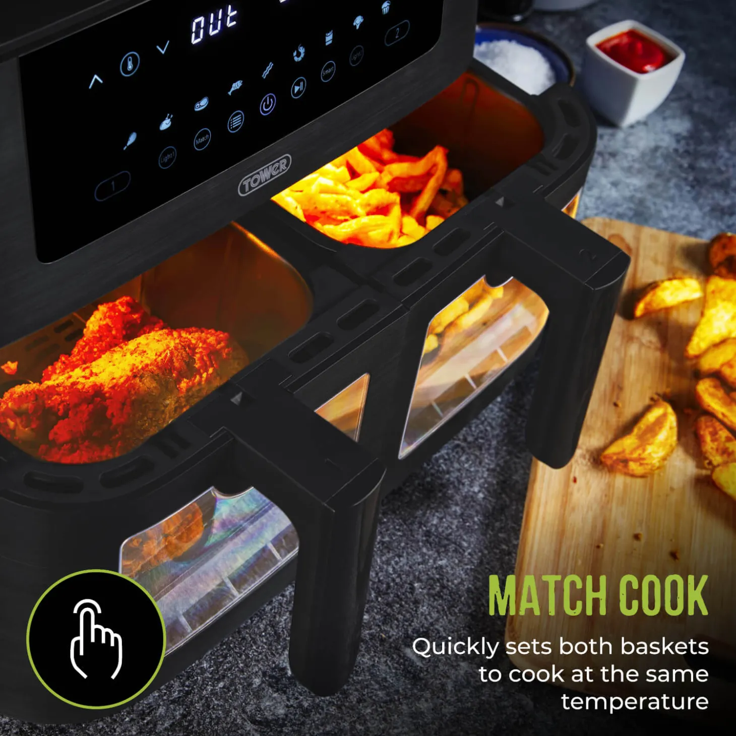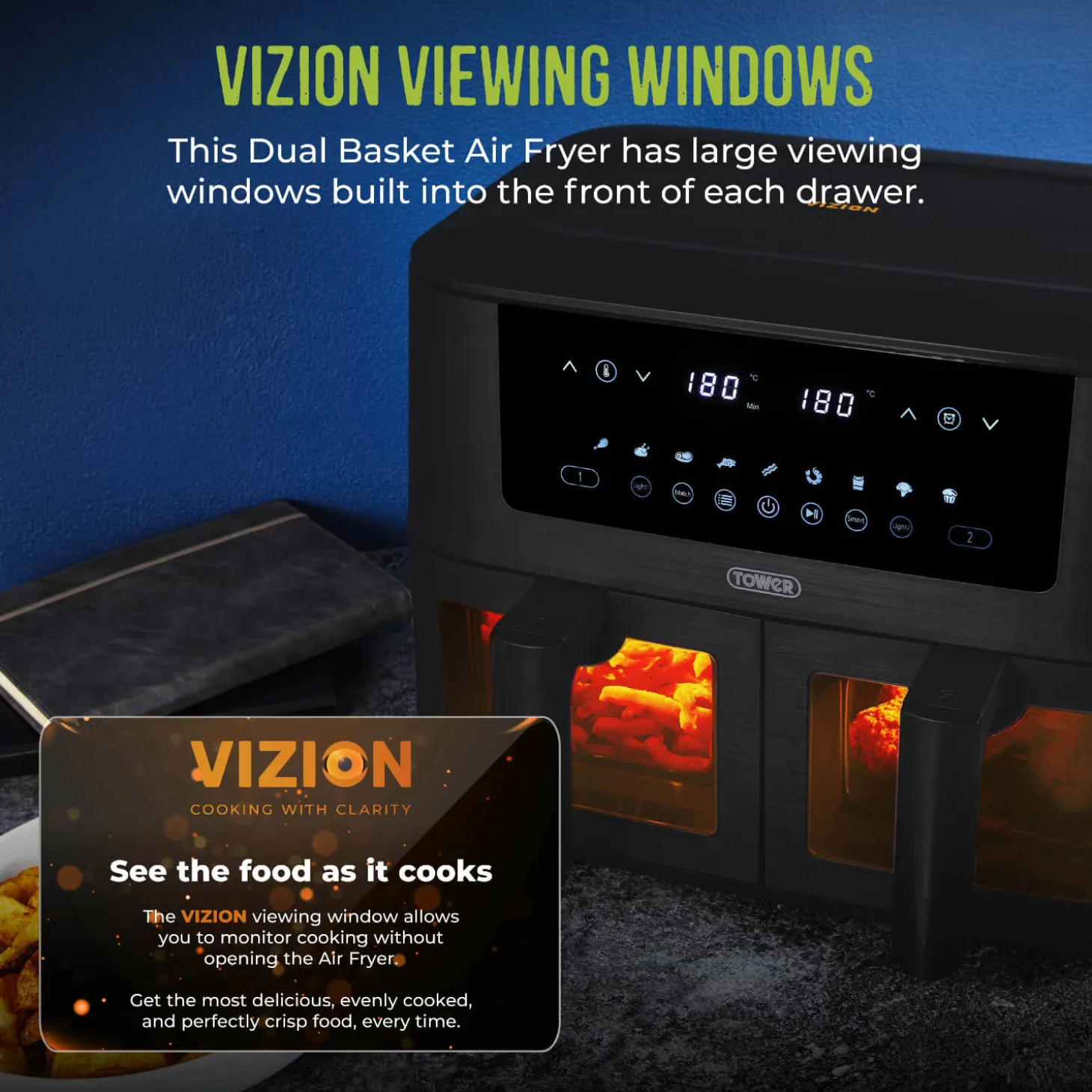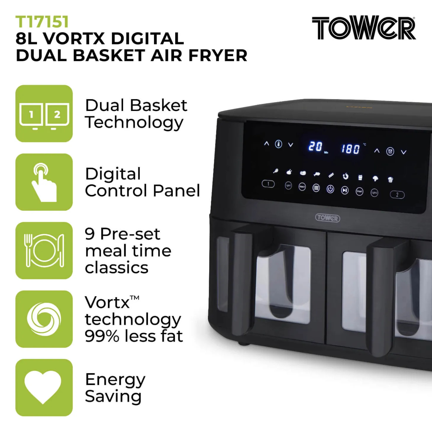 Prepare delicious and crispy meals and snacks with the Tower Vizion Dual Basket 8-litre air fryer. Utilising innovative Vortx technology, exclusive to Tower, it rapidly circulates air around the food while using 99% less oil and cooking 30% faster than traditional deep-fat fryers. The double-drawer design allows you to cook different meals for the whole family simultaneously. This air fryer is a fantastic addition to any kitchen, perfect for cooks of all skill levels!