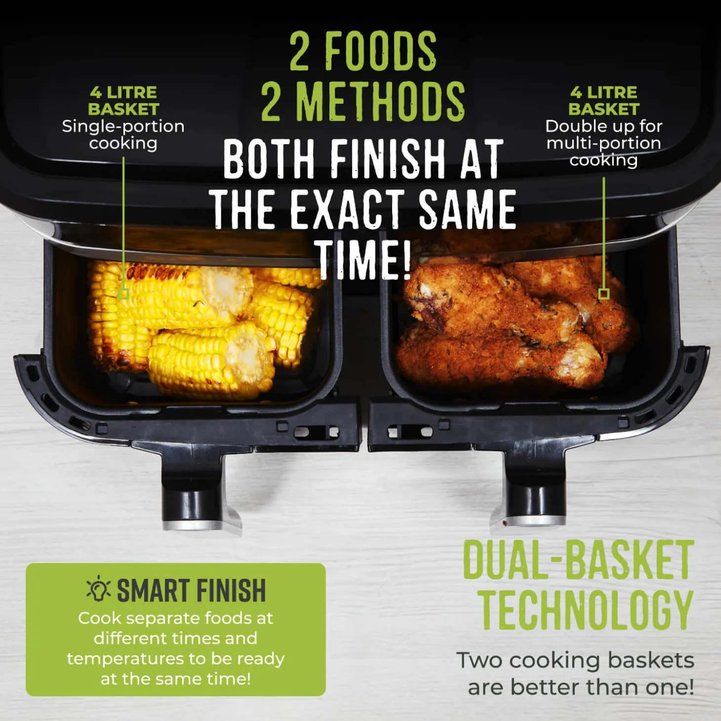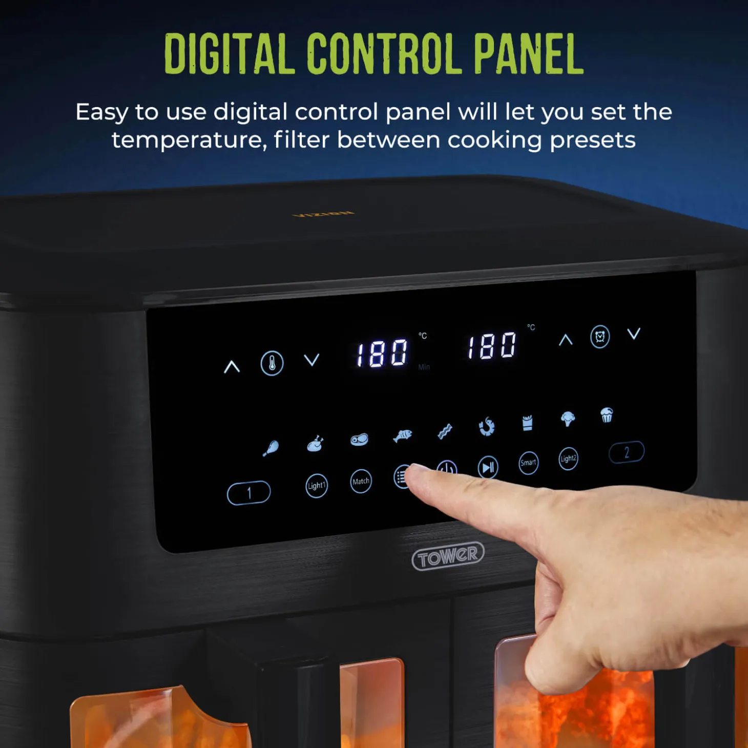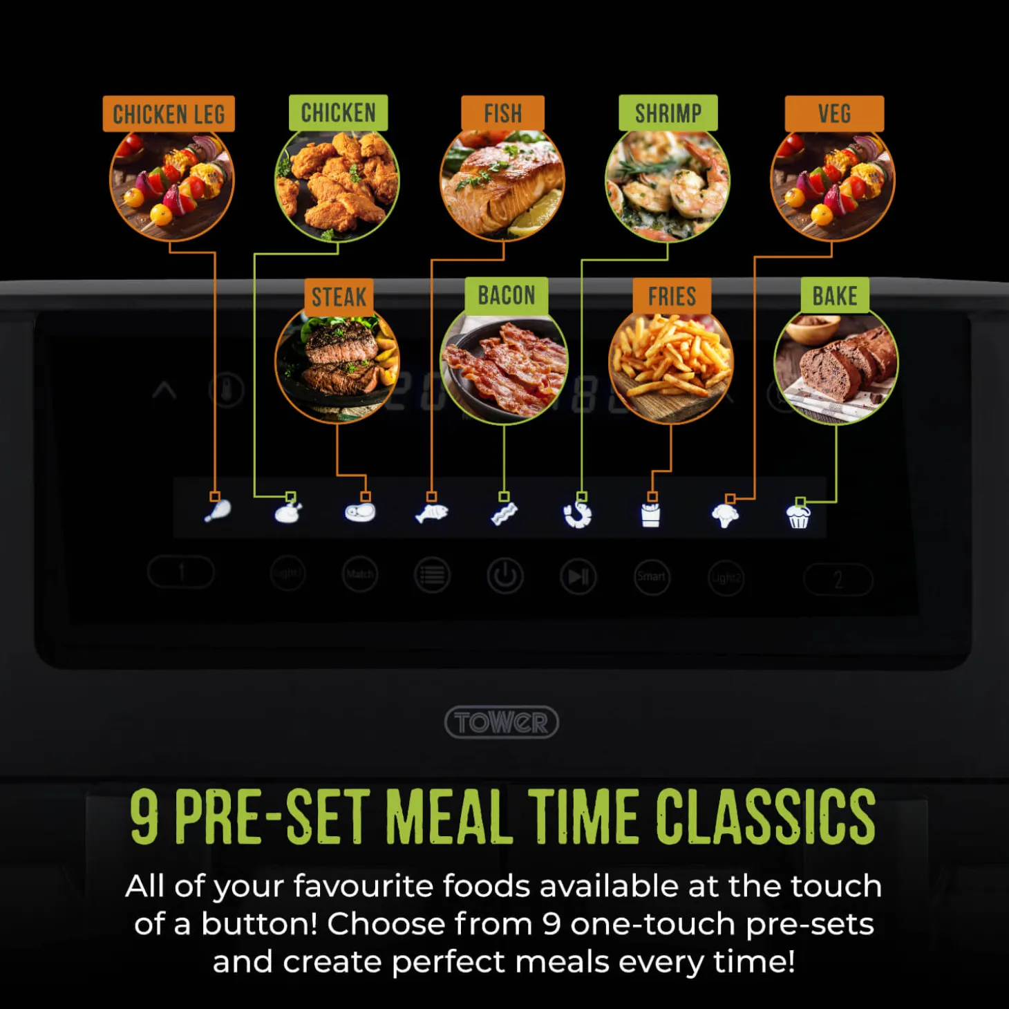 Prepare delicious and crispy meals and snacks with the Tower Vizion Dual Basket 8-litre air fryer. Utilising innovative Vortx technology, exclusive to Tower, it rapidly circulates air around the food while using 99% less oil and cooking 30% faster than traditional deep-fat fryers. The double-drawer design allows you to cook different meals for the whole family simultaneously. This air fryer is a fantastic addition to any kitchen, perfect for cooks of all skill levels!