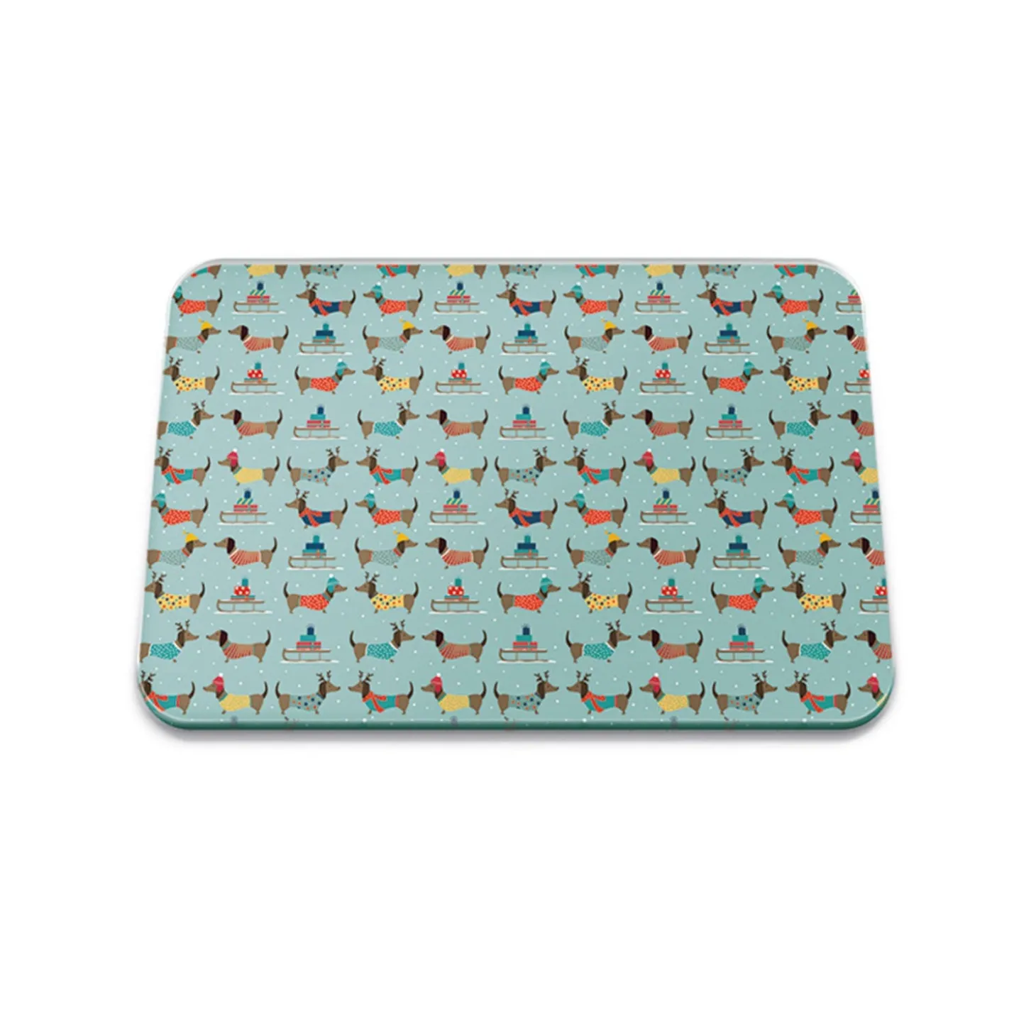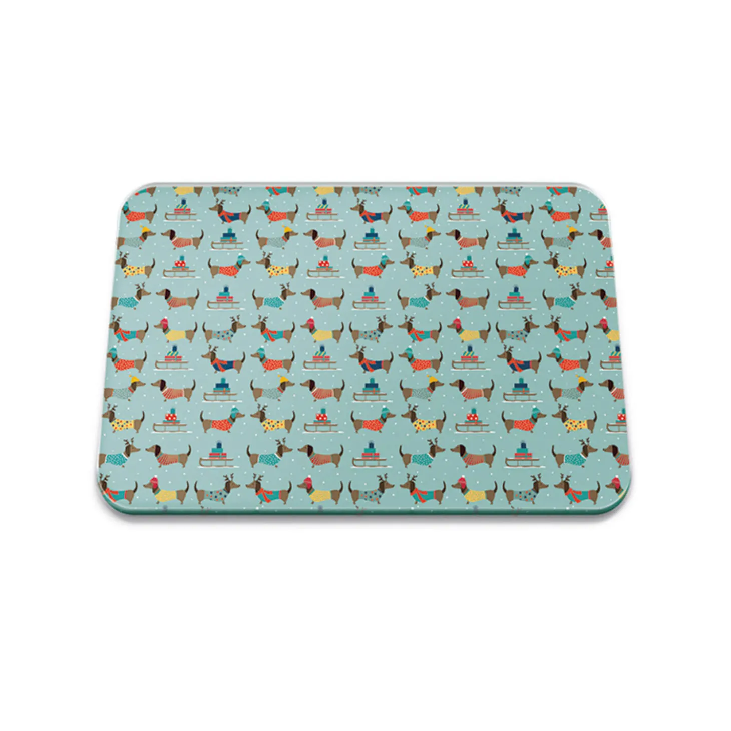 Presenting the Medium Worktop Saver in Christmas Dauchaund design, produced in the UK by Tuftop. This charming countertop saver features an array of adorable sausage dogs dressed in their festive best, perfect for adding a touch of holiday cheer to your cooking and baking this Christmas.