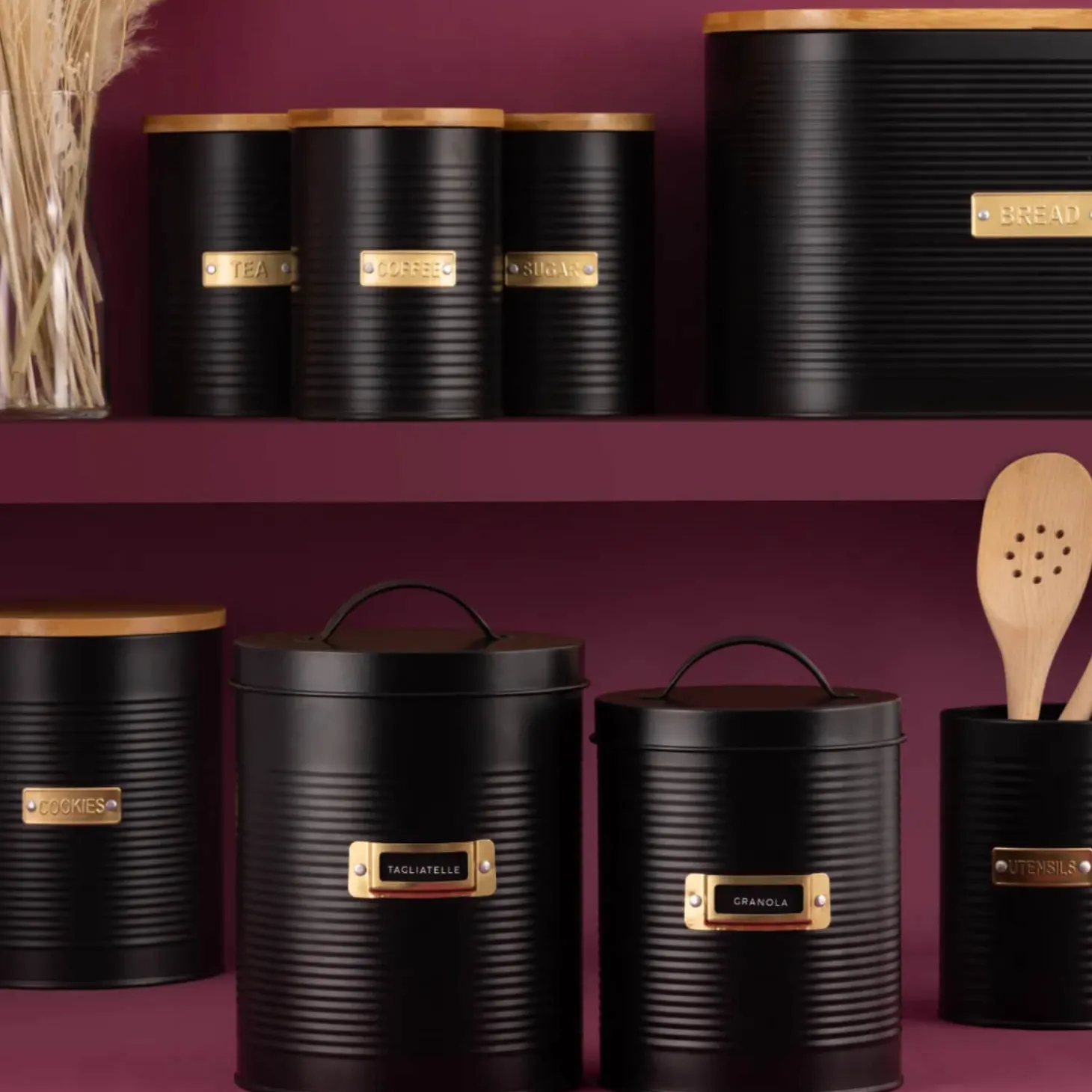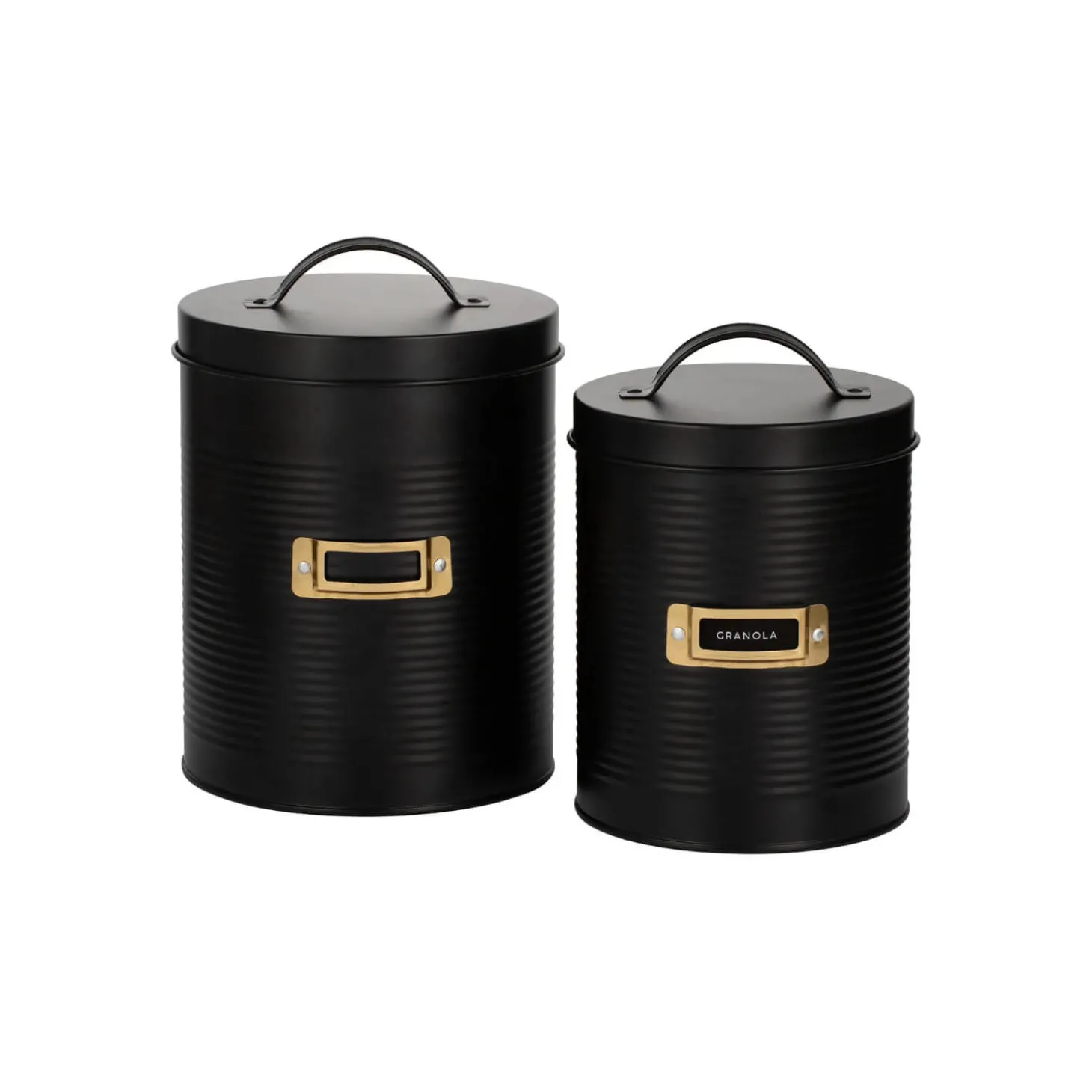 Typhoon presents the Otto 2-Piece Round Storage Canisters in Black with the ridge design and gold window on the front, labels are supplied for you to personalise them for your own storage needs. These canisters offer generous storage space. The medium canister has a capacity of 2.4 litres and the large has a 3.5 litre capacity, perfect for organising and storing bulk foods and cleaning products.